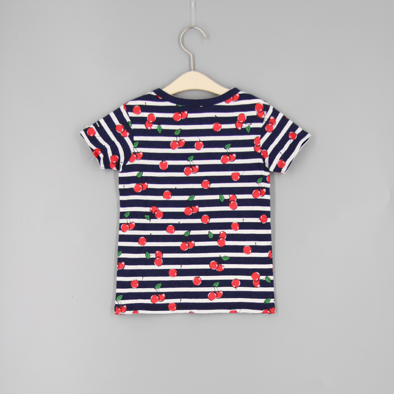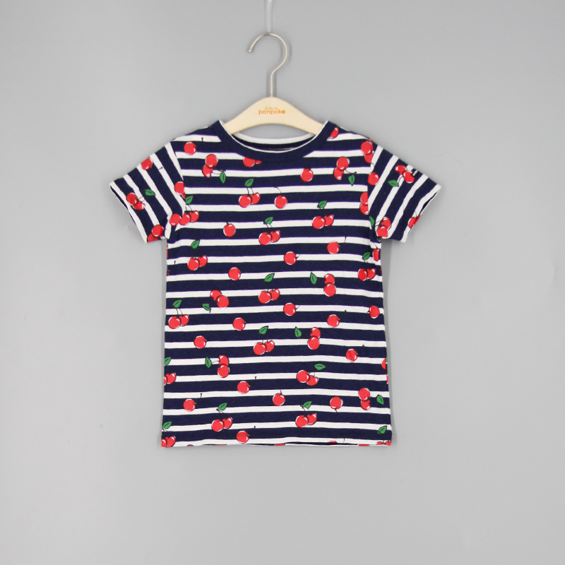 櫻桃圖案橫間布料, 圓領, 短袖, 合身款式