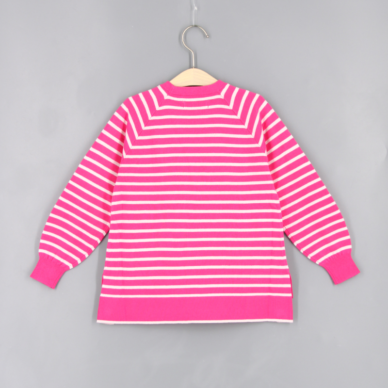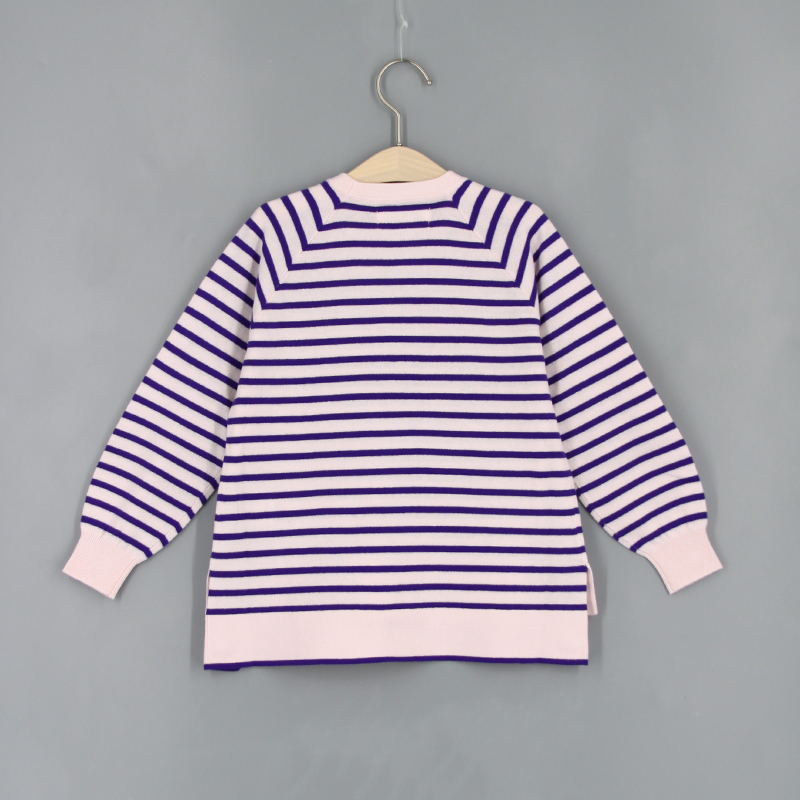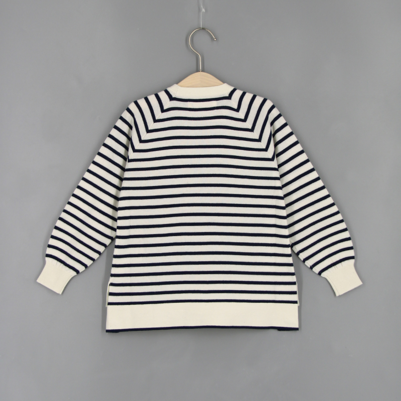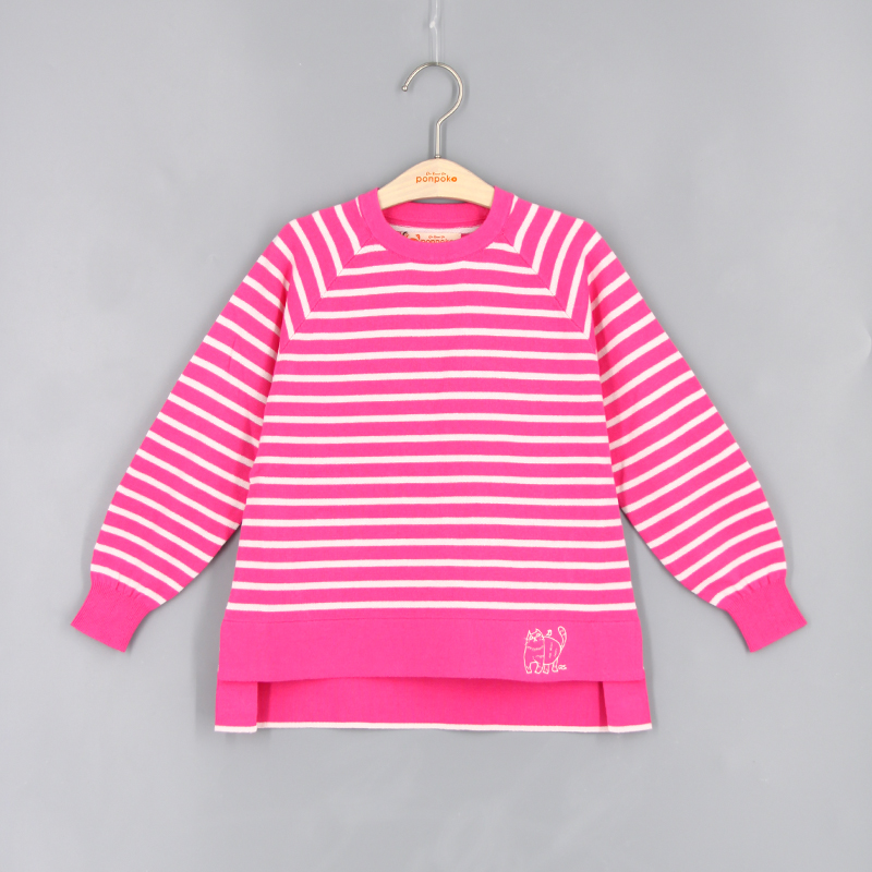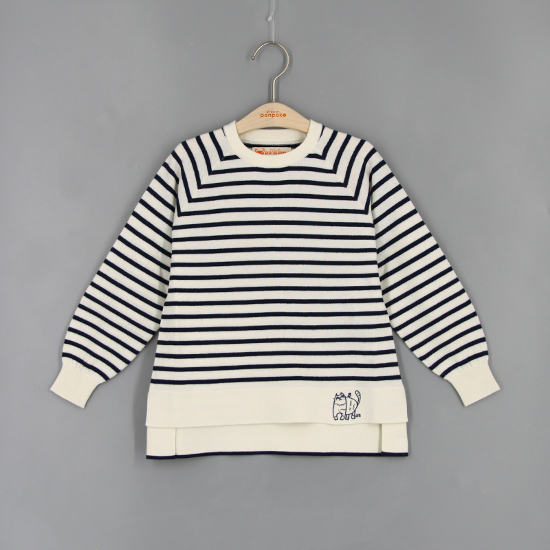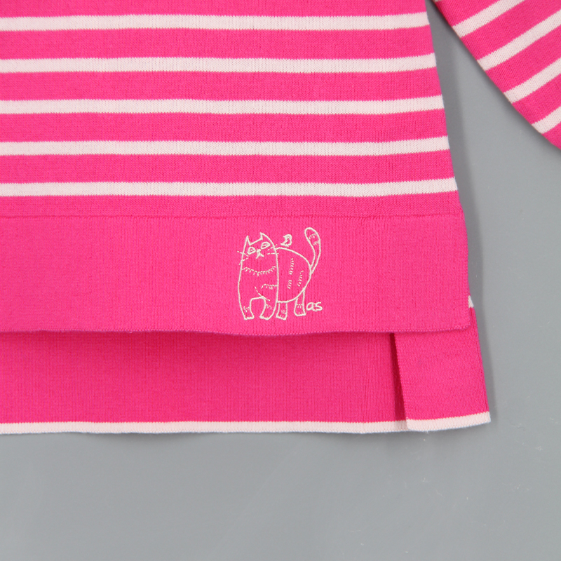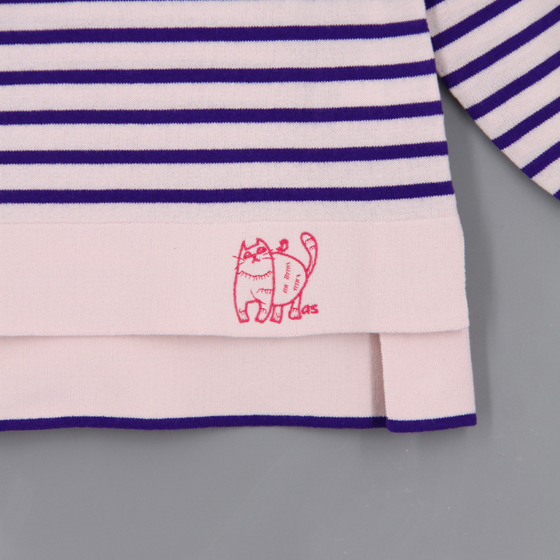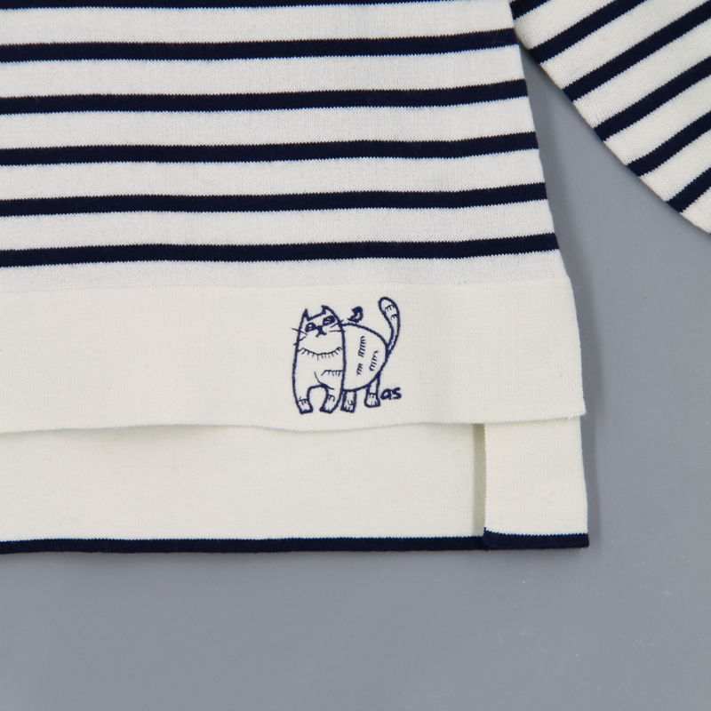 圓領, 撞色間條設計, 撞色手袖及衫腳, 貓咪刺繡, 前短後長衫腳, 牛角袖, 全棉, 大人同款