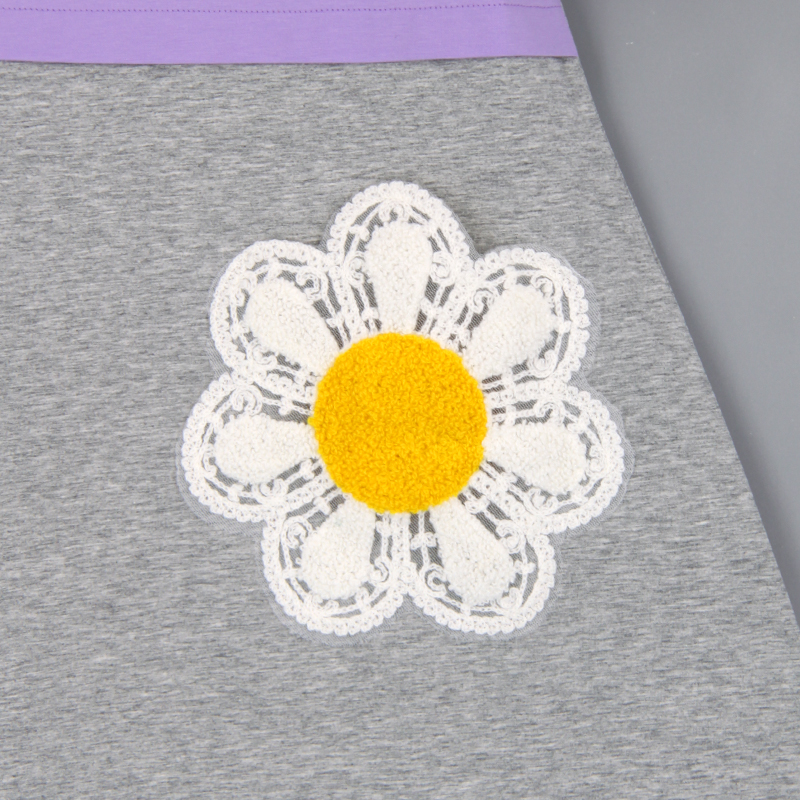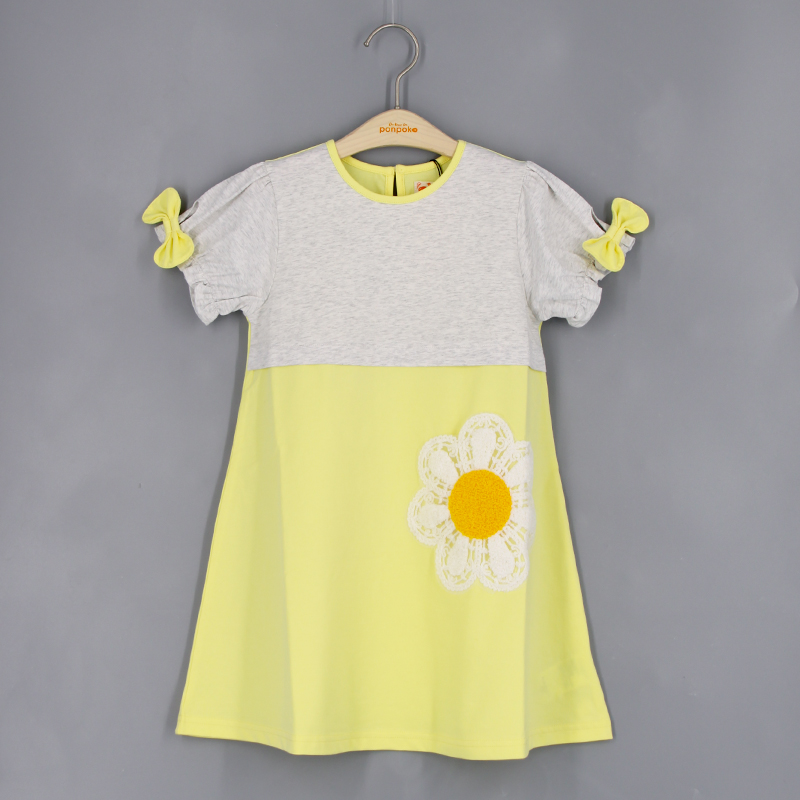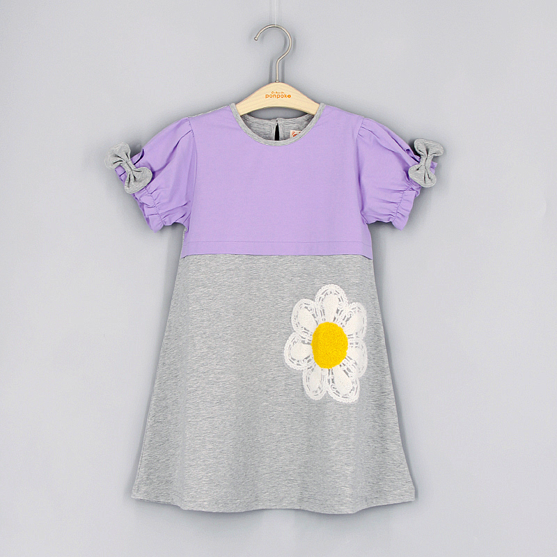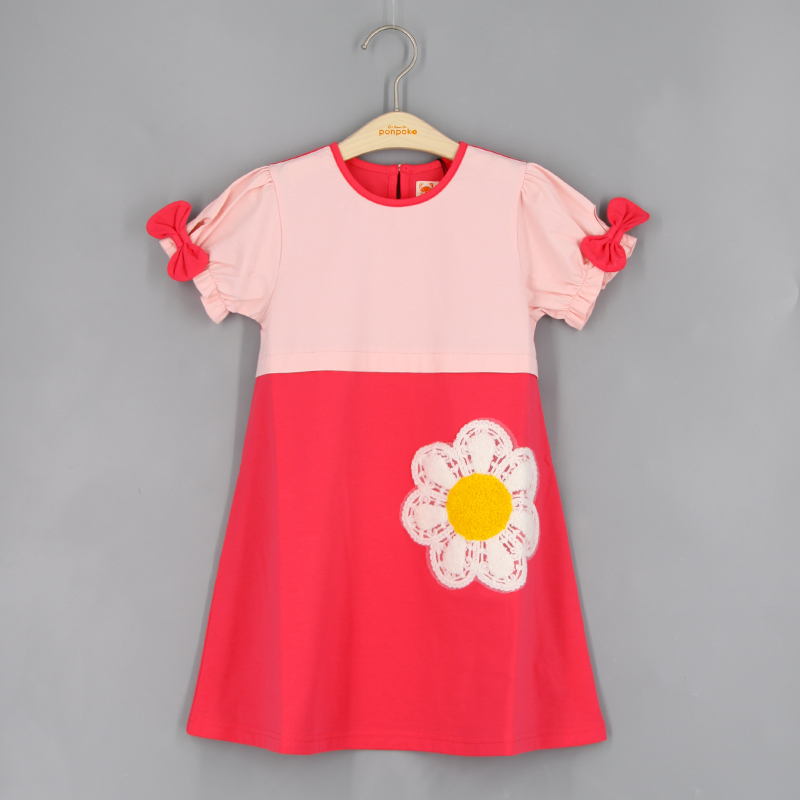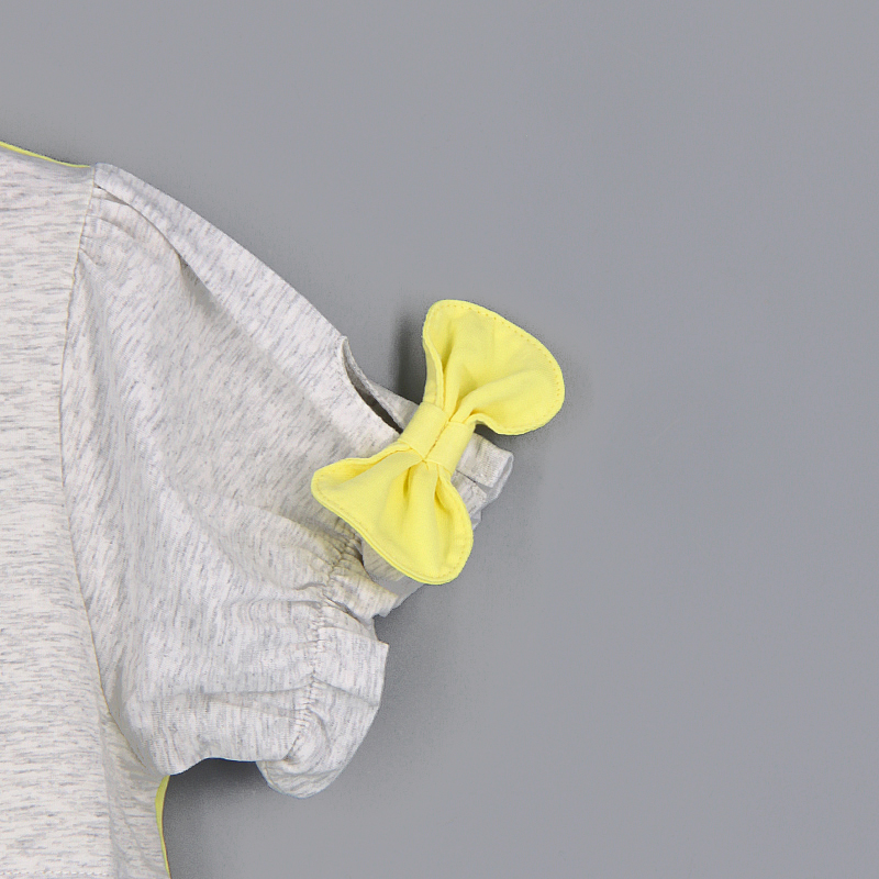 圓領, 短袖, 袖口位蝴蝶結裝飾, 彈性袖口, 洋甘菊毛巾刺繡口袋設計, 後方鎖匙窿設計, 寬鬆設計, 拼色設計