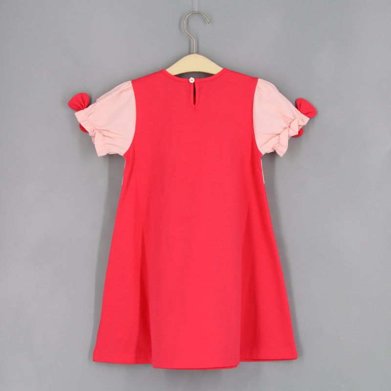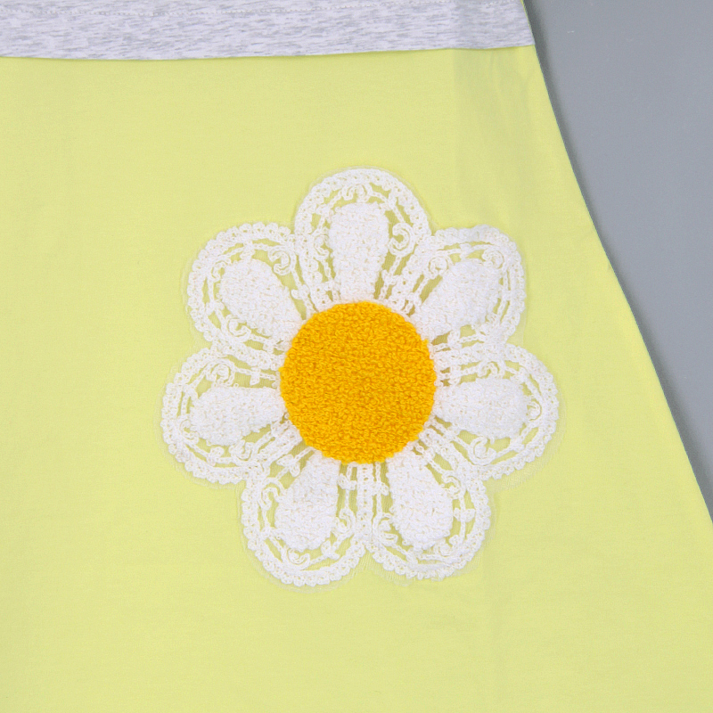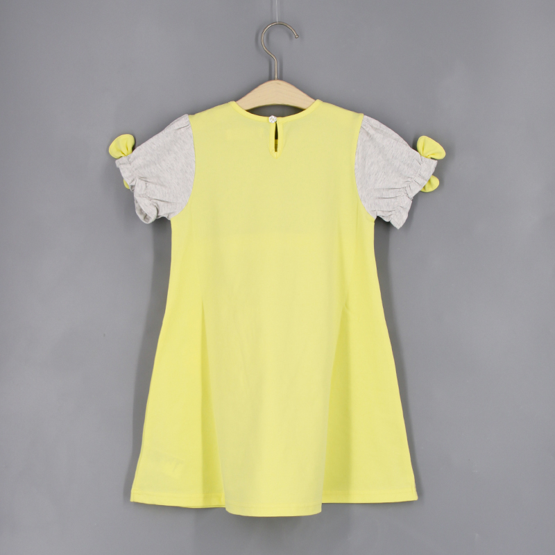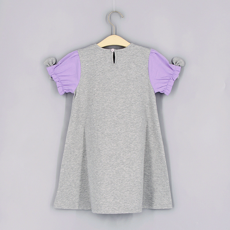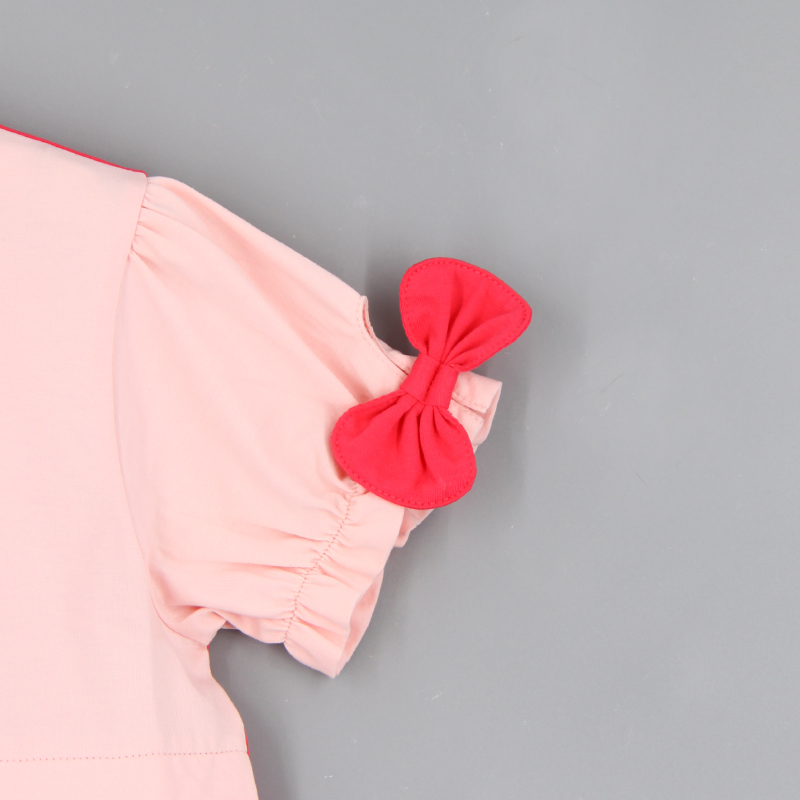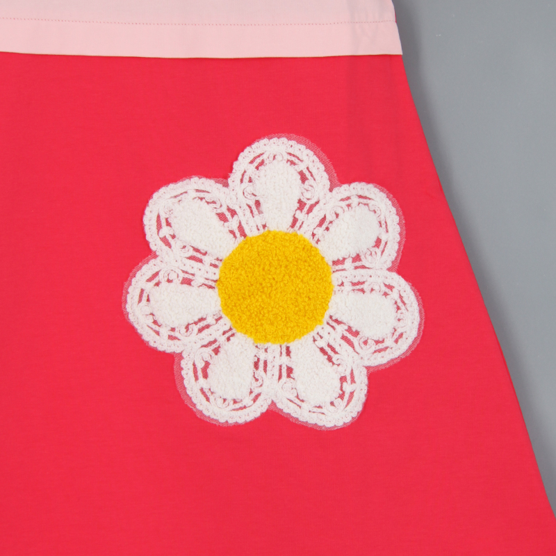圓領, 短袖, 袖口位蝴蝶結裝飾, 彈性袖口, 洋甘菊毛巾刺繡口袋設計, 後方鎖匙窿設計, 寬鬆設計, 拼色設計