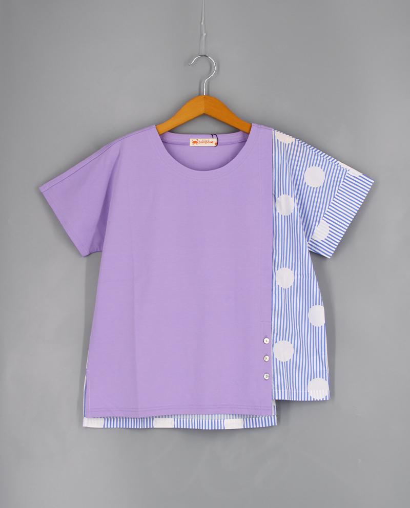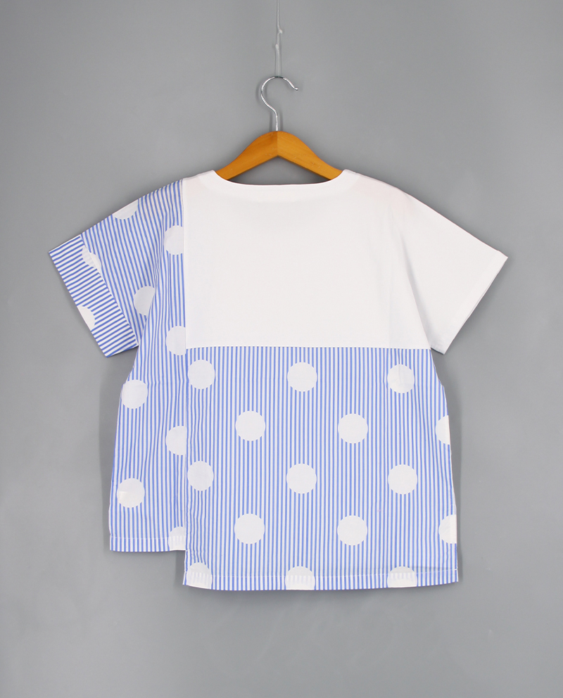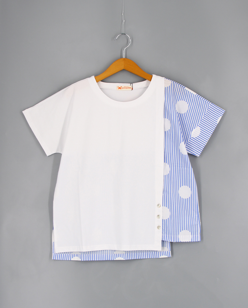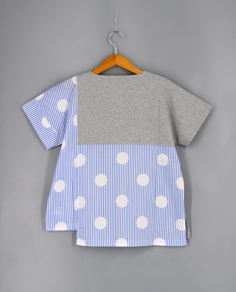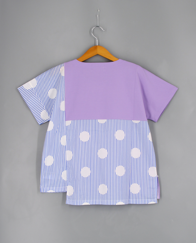 圓領, 短袖, 貝殼鈕扣, 前短後長衫腳, 拼布風格, 大人同款