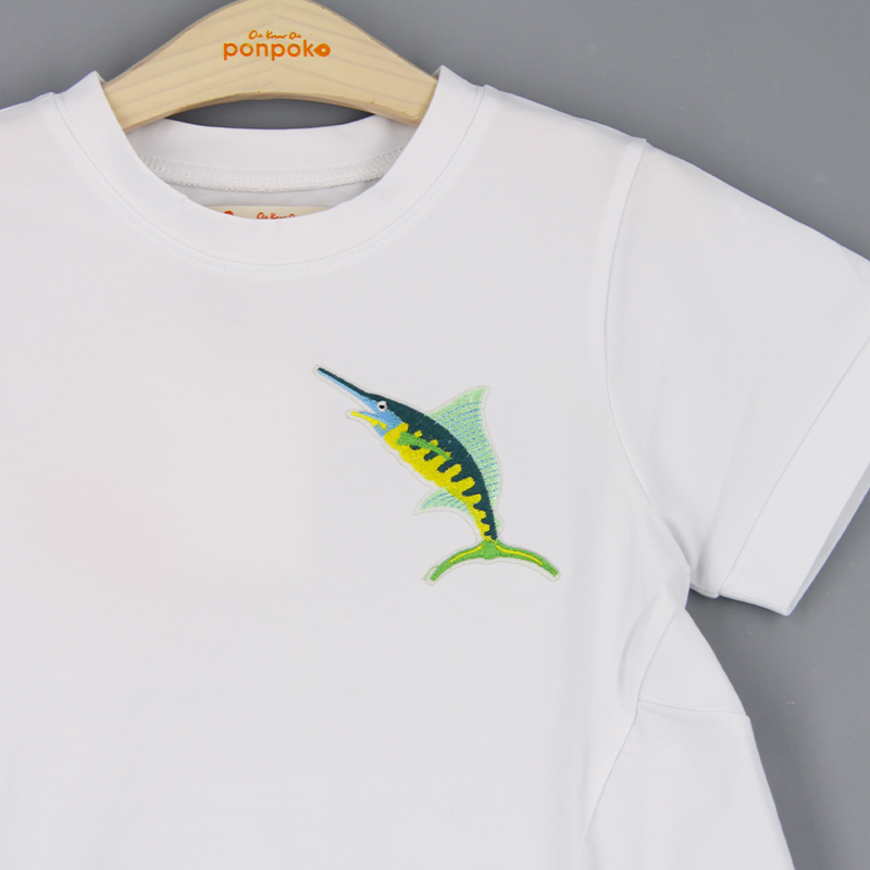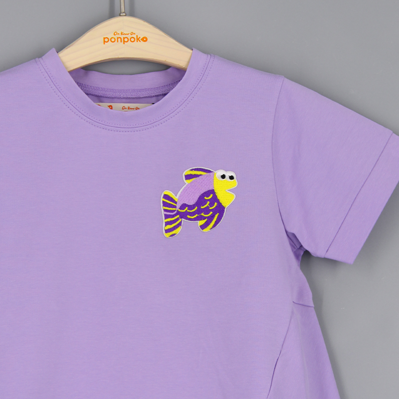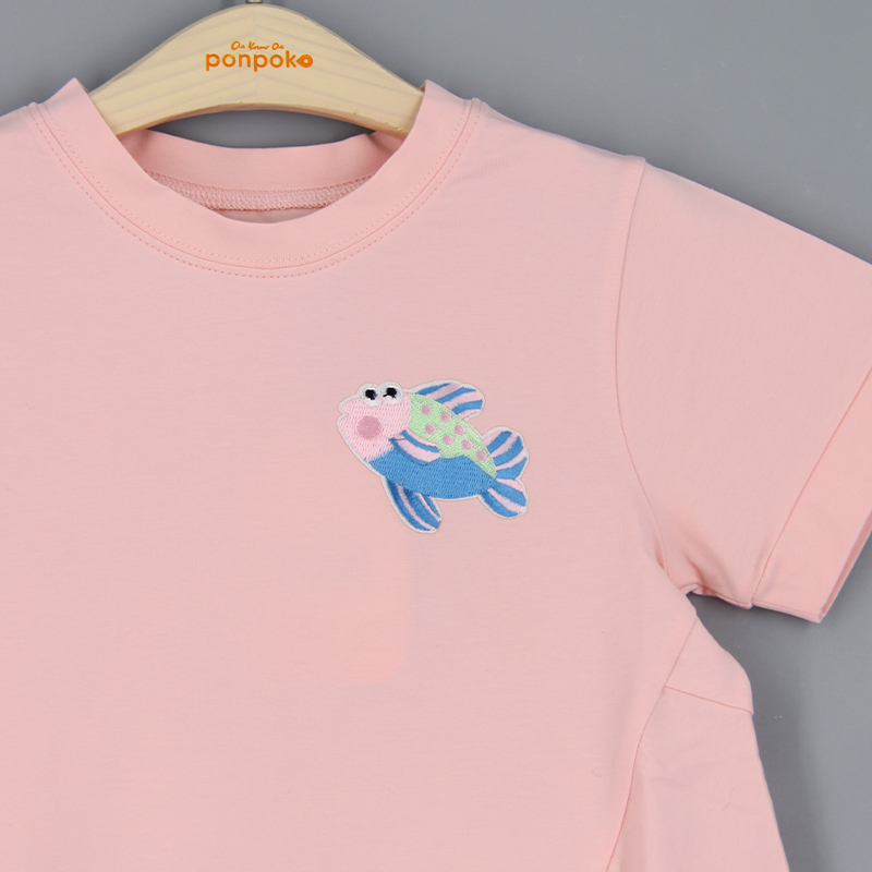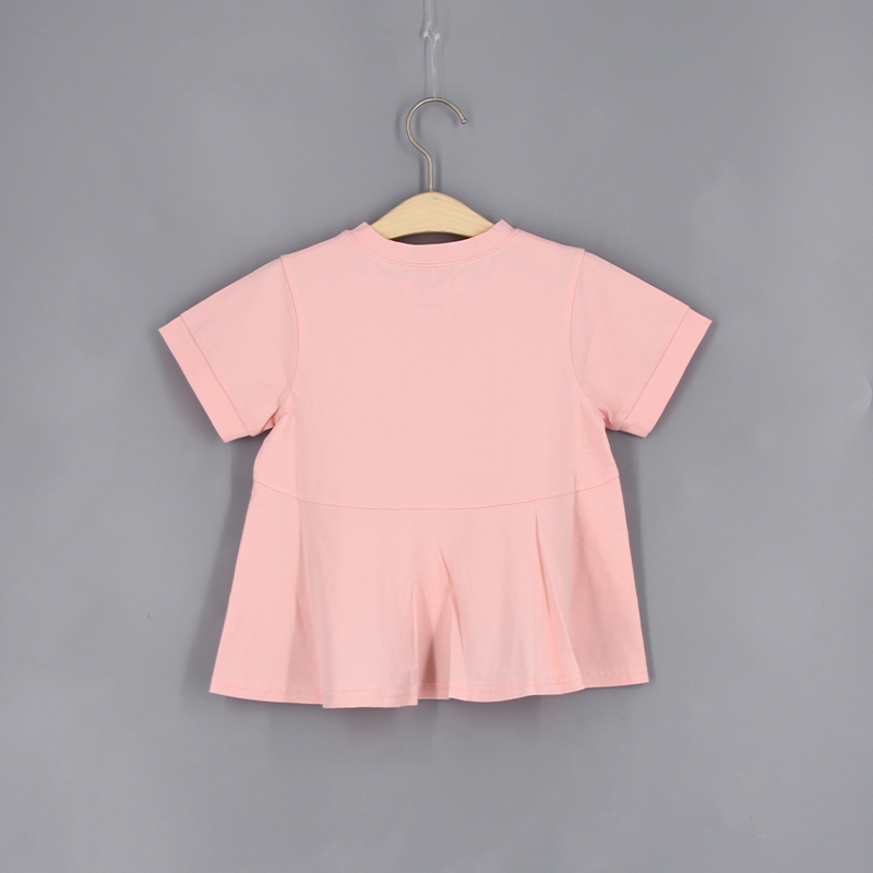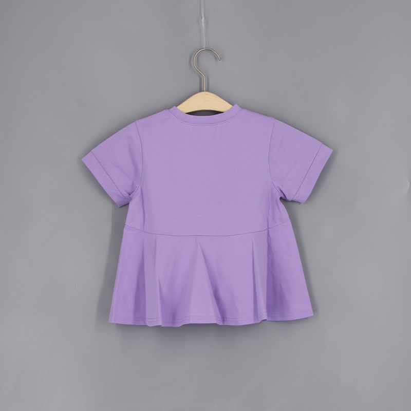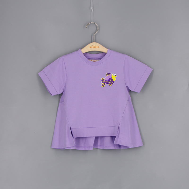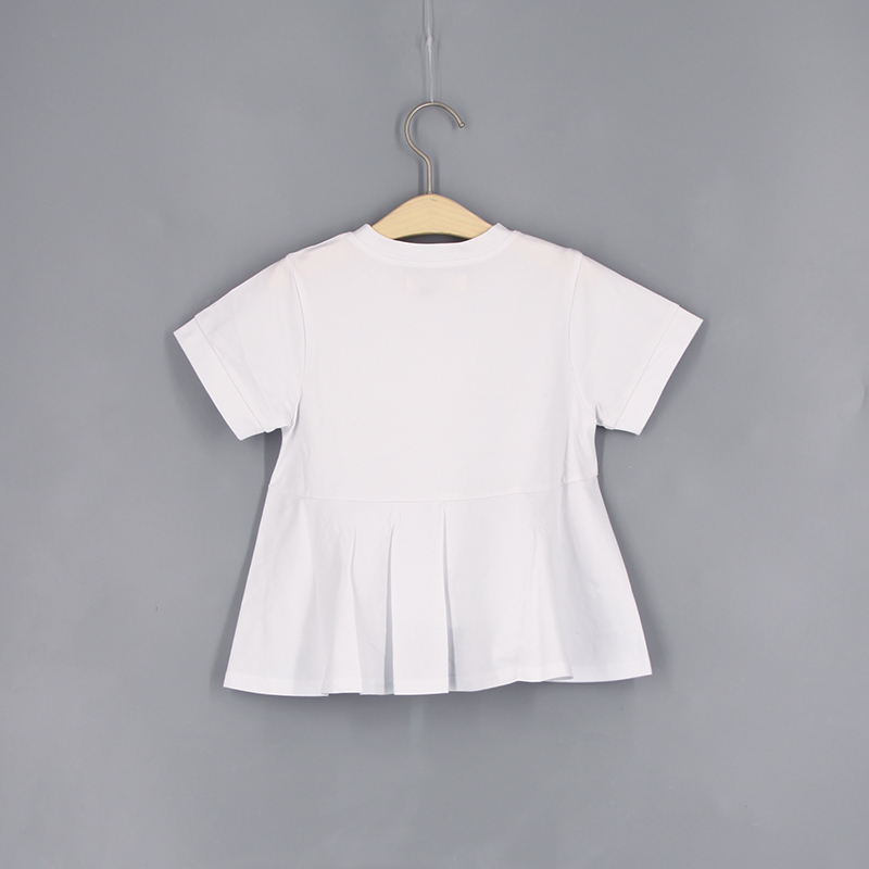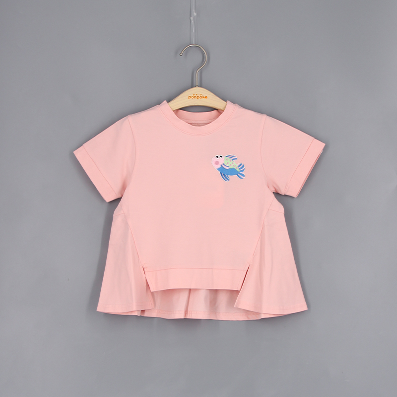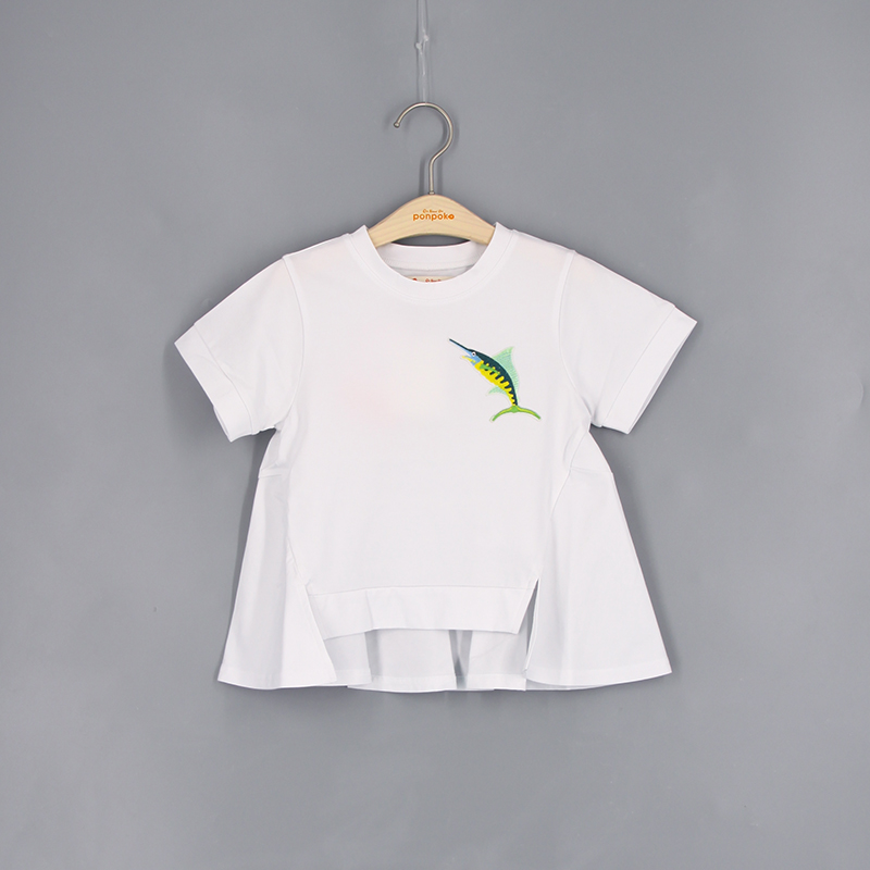 圓領, 短袖, 動物布貼, 荷葉下擺, 壓褶細節, 前短後長衫腳, 合身款式