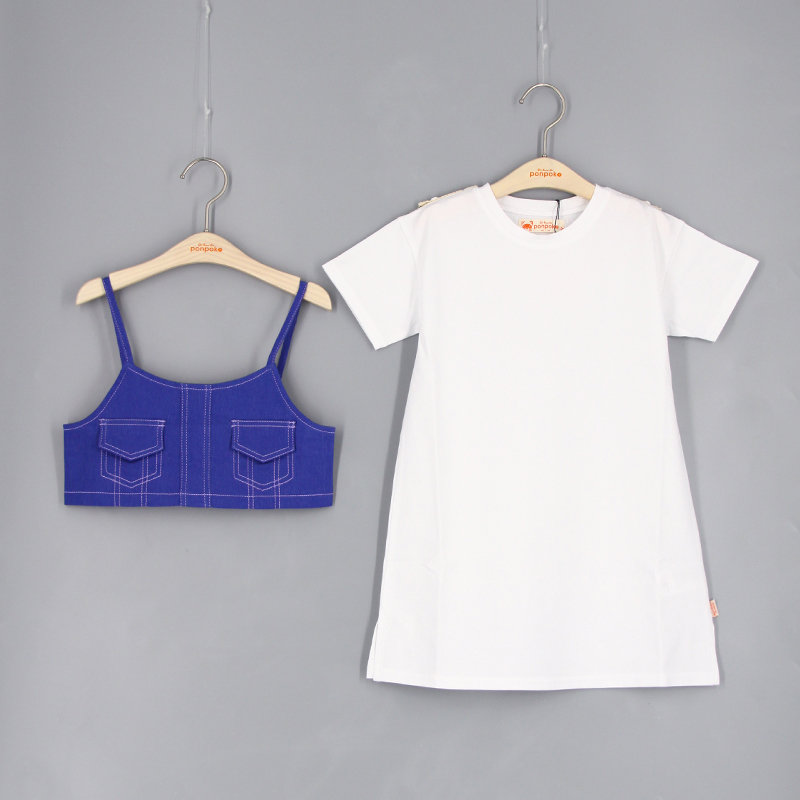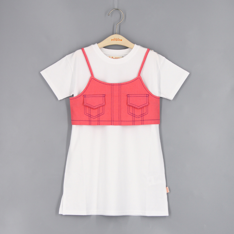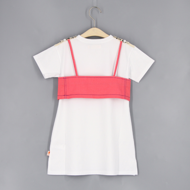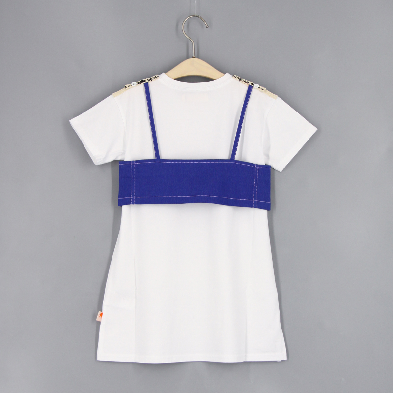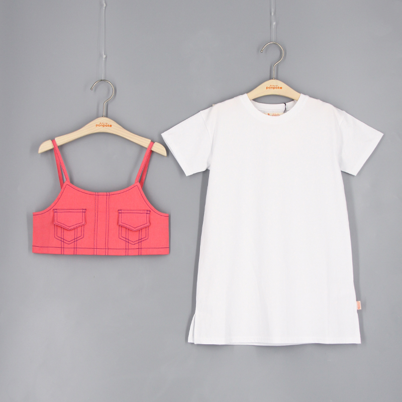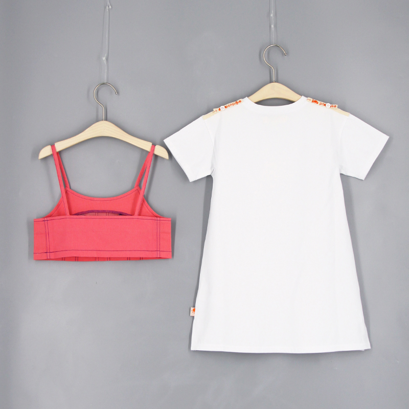 T裇: 圓領, 短袖, 長衫版型, 下擺左右開叉, 品牌小標籤細節, 肩膀有固定肩帶