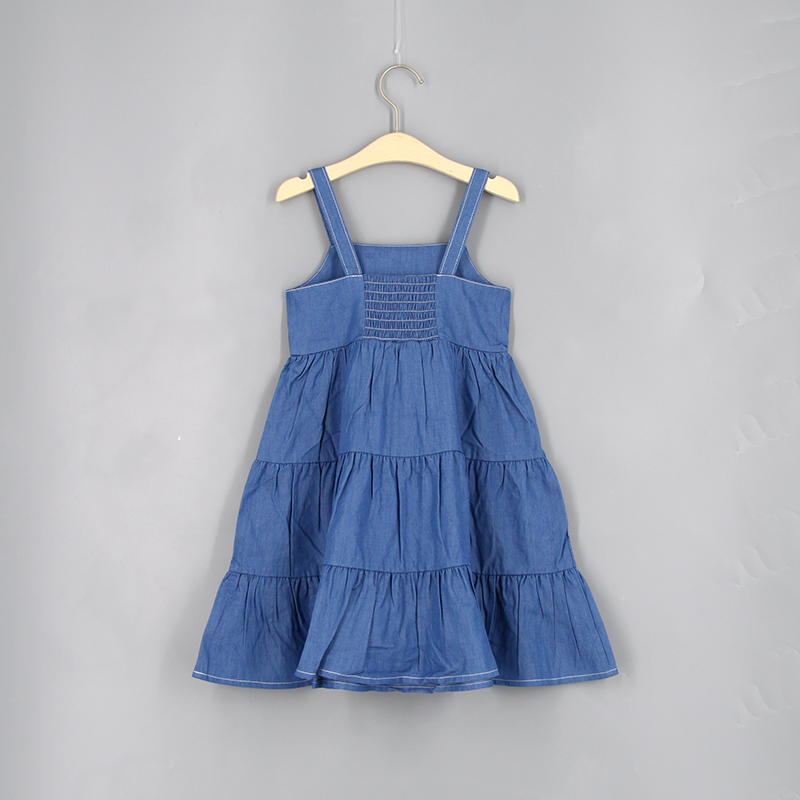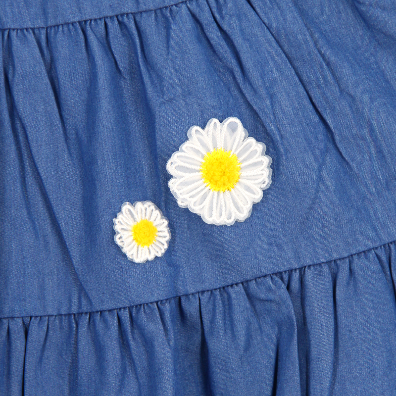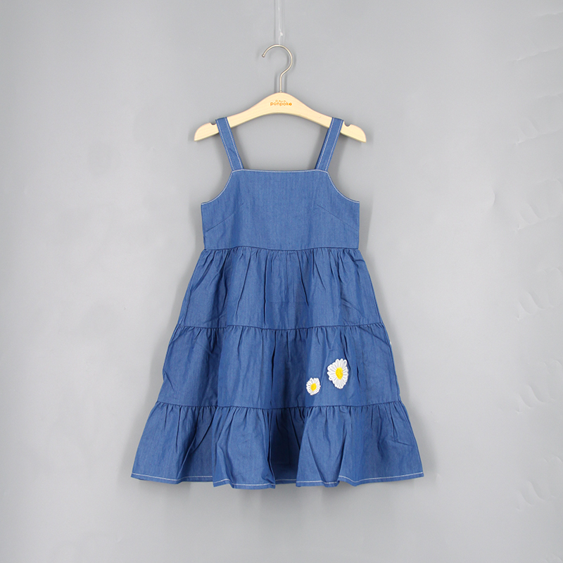 方領, 牛仔布,吊帶裙, 修腰款, 後方橡筋鬆緊帶, 洋甘菊裝飾, 蛋糕裙, 合身款式