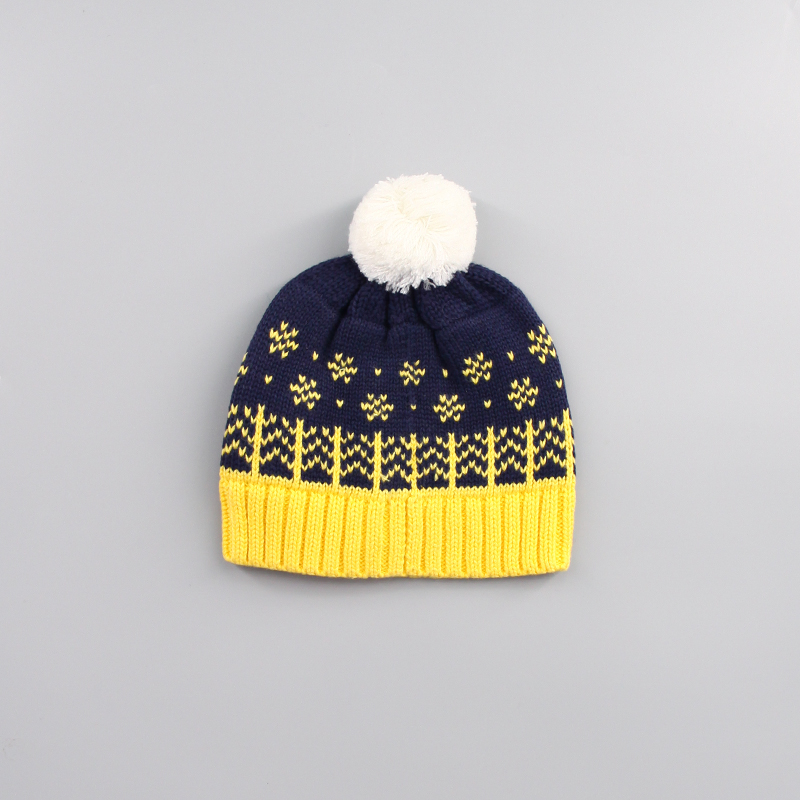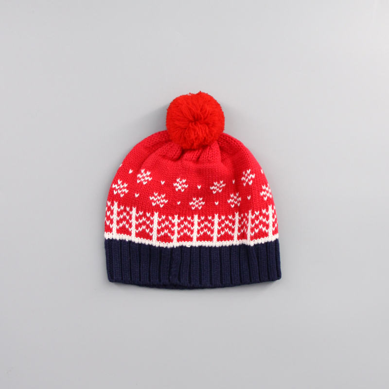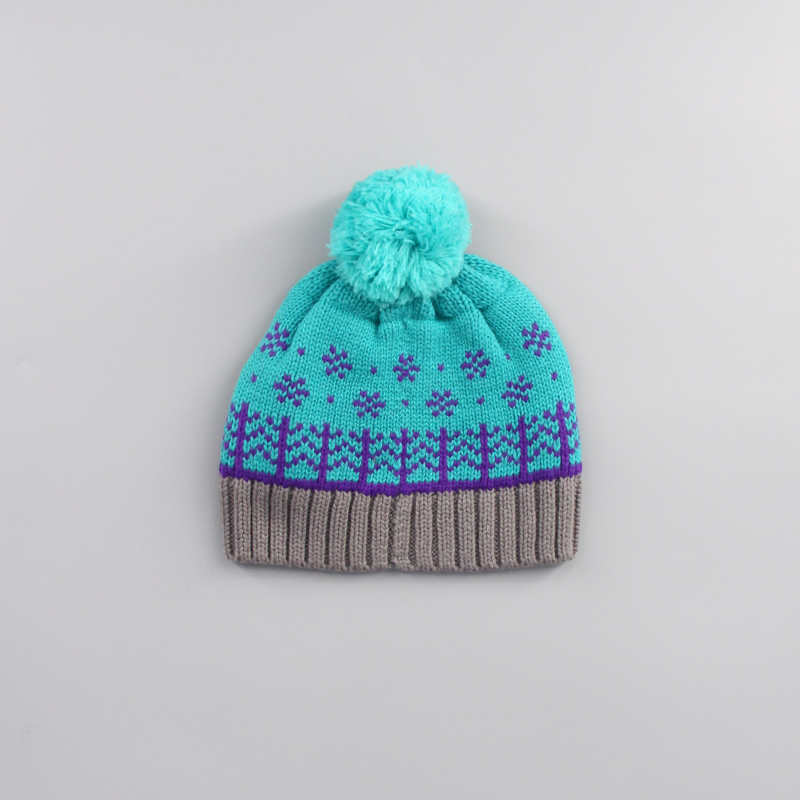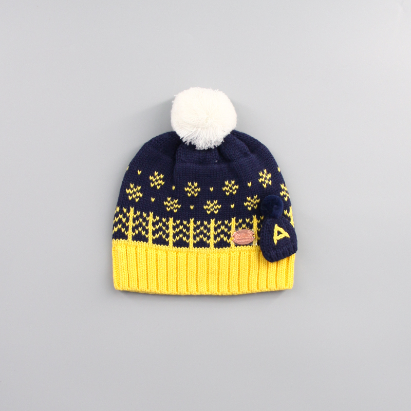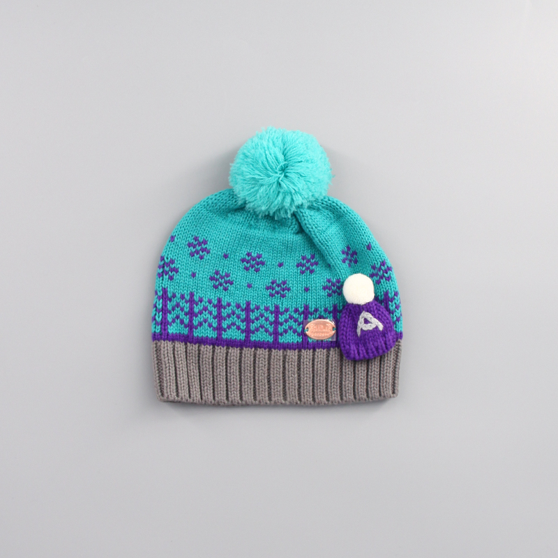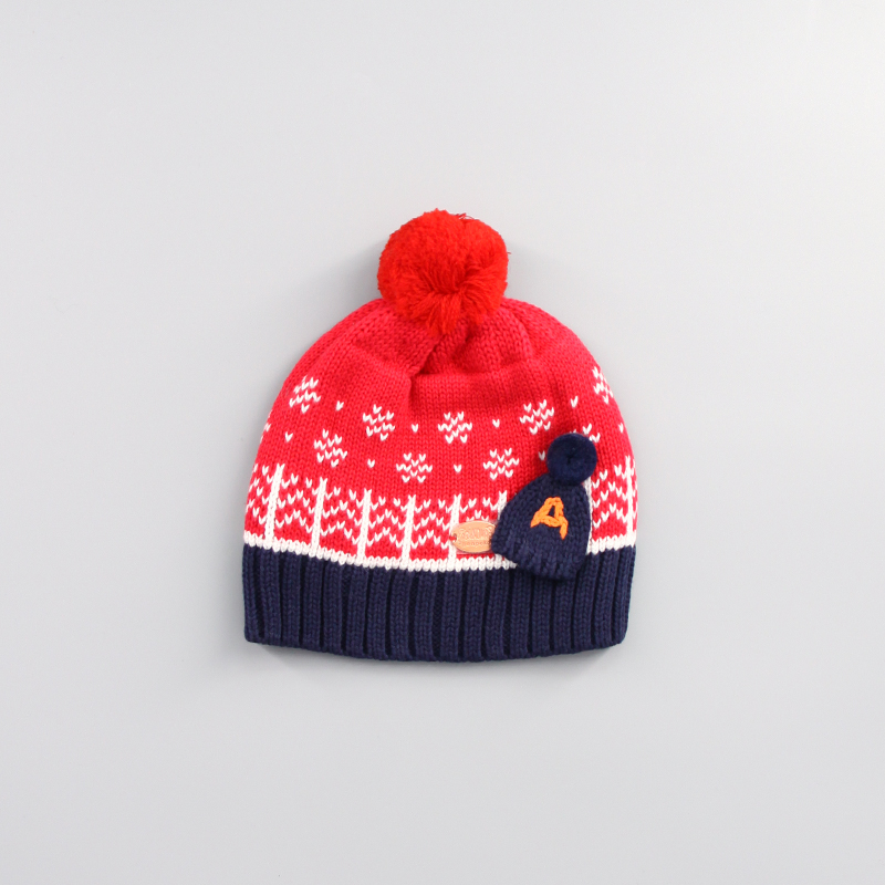 針織冷帽, 雪花圖案, 羅紋邊, 小帽子裝飾, 品牌金屬章, 毛球裝飾