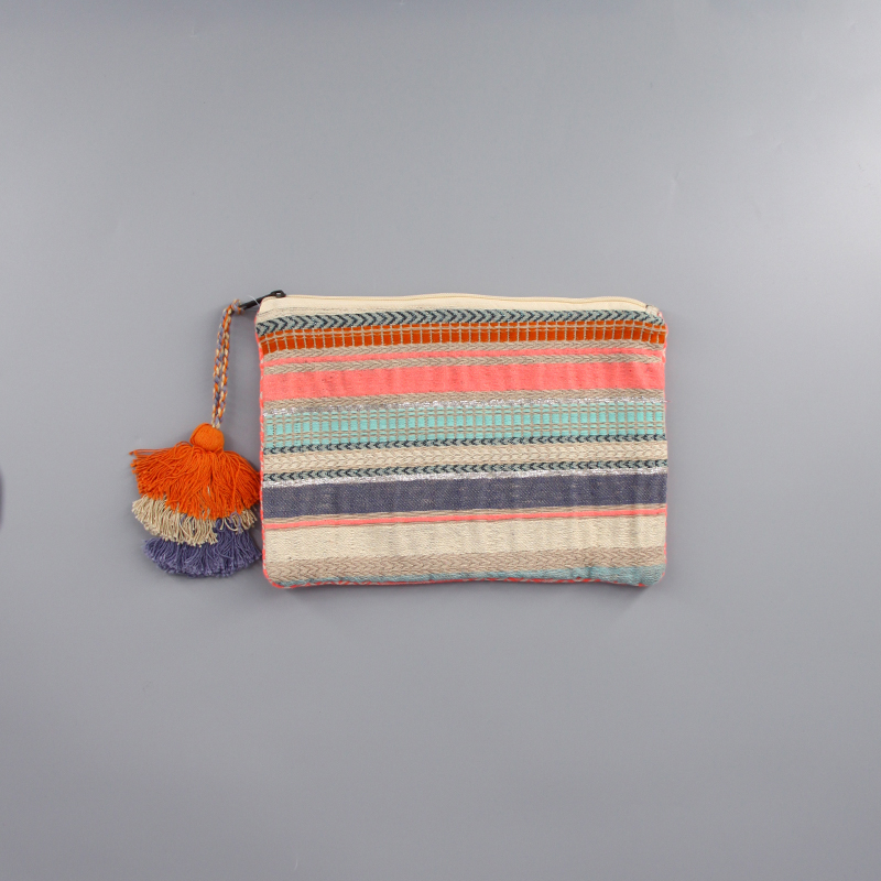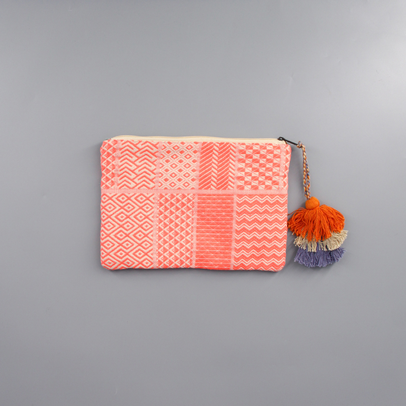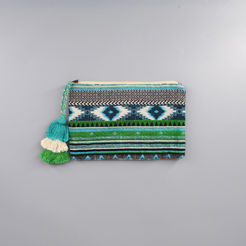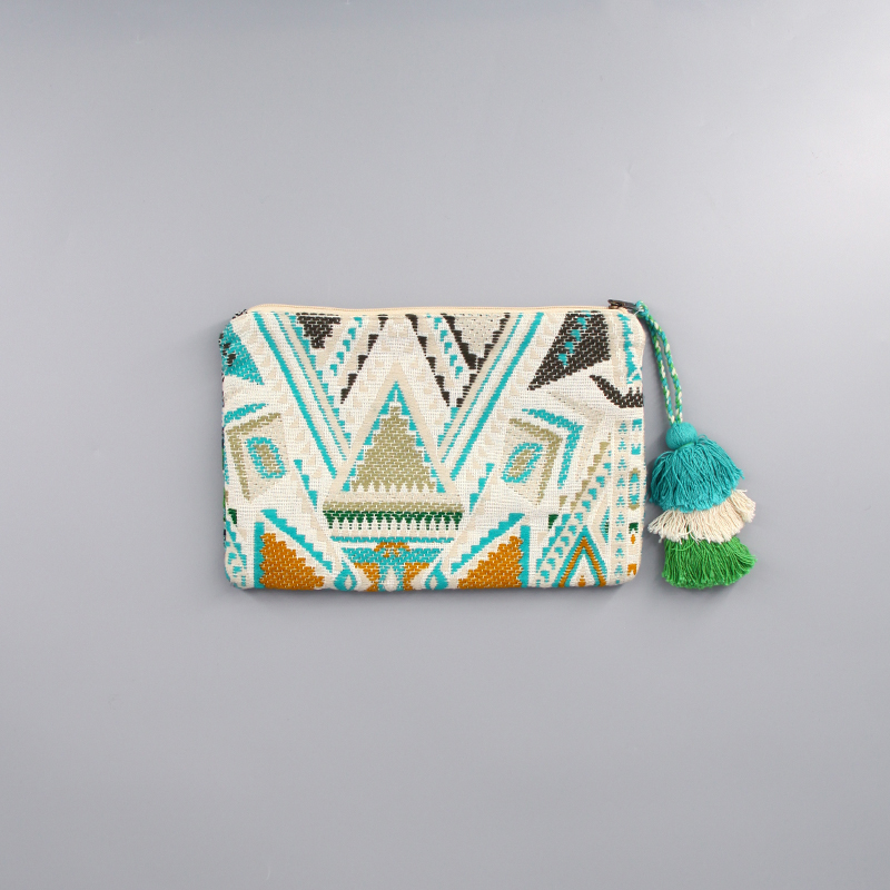 流蘇吊飾, 正反不一的圖騰圖案, 拼色風格, 拉鏈開合, 內袋