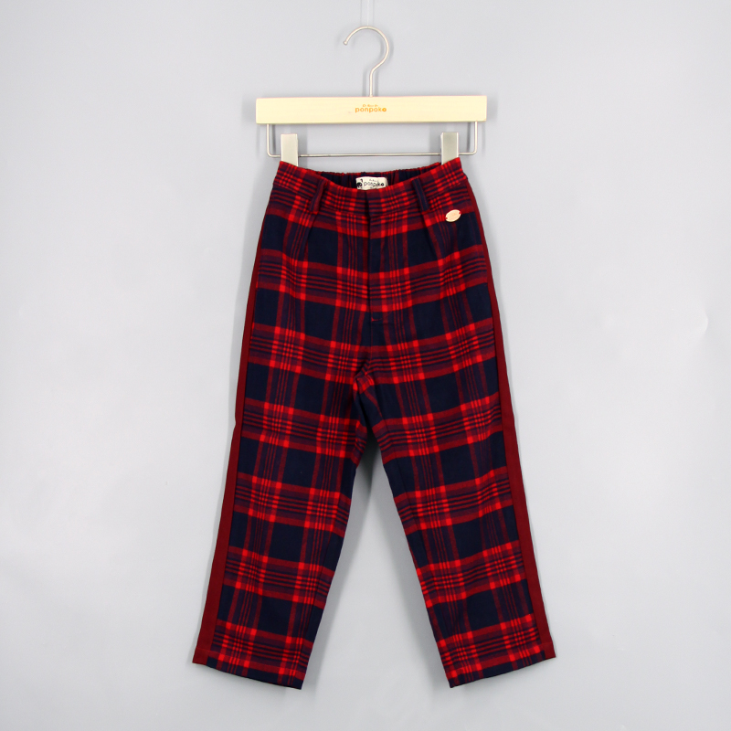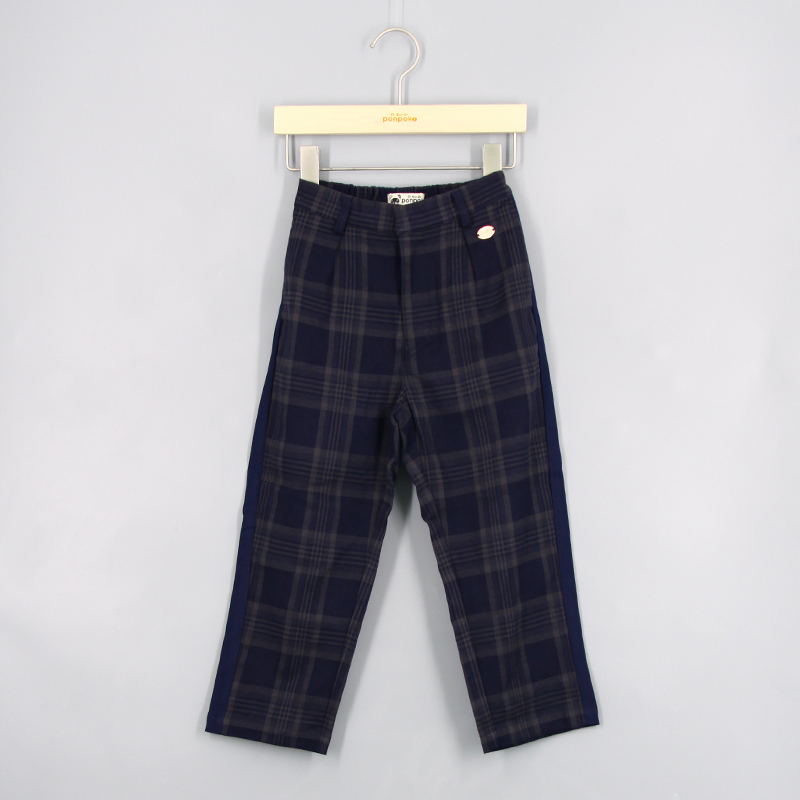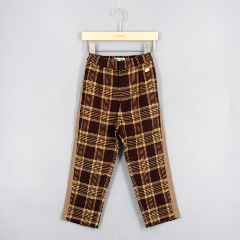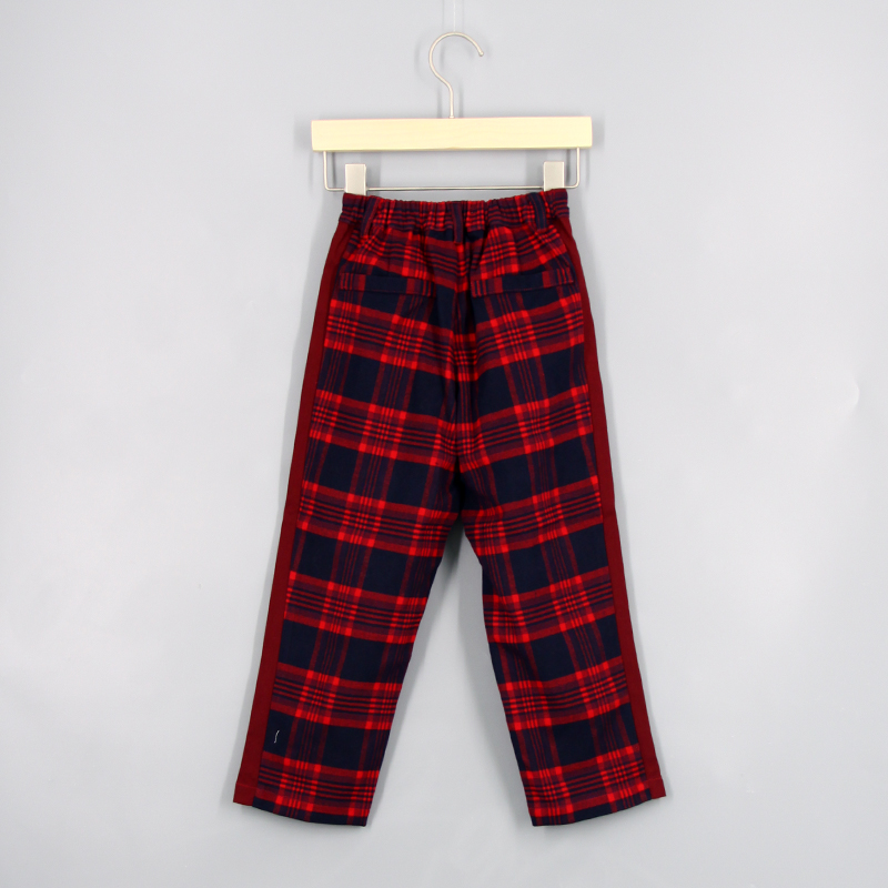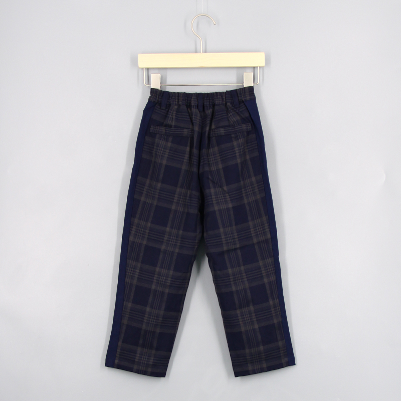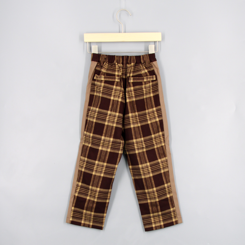 橡筋腰頭, 品牌金屬章, 兩側口袋, 後方假口袋, 撞色邊條, 拼色格仔圖案, 寬鬆版型
