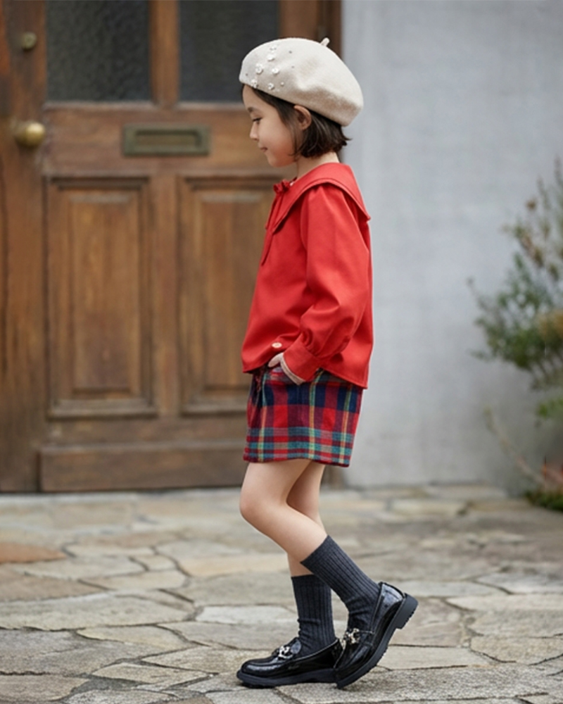 橡筋腰頭, 花朵鈕扣裝飾, 格仔圖案, 撞色風格