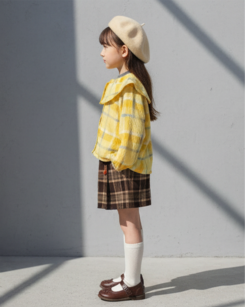 橡筋腰頭, 花朵鈕扣裝飾, 格仔圖案, 拼色風格