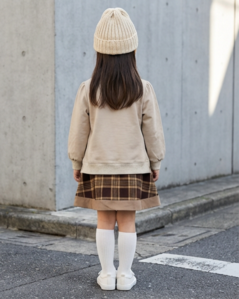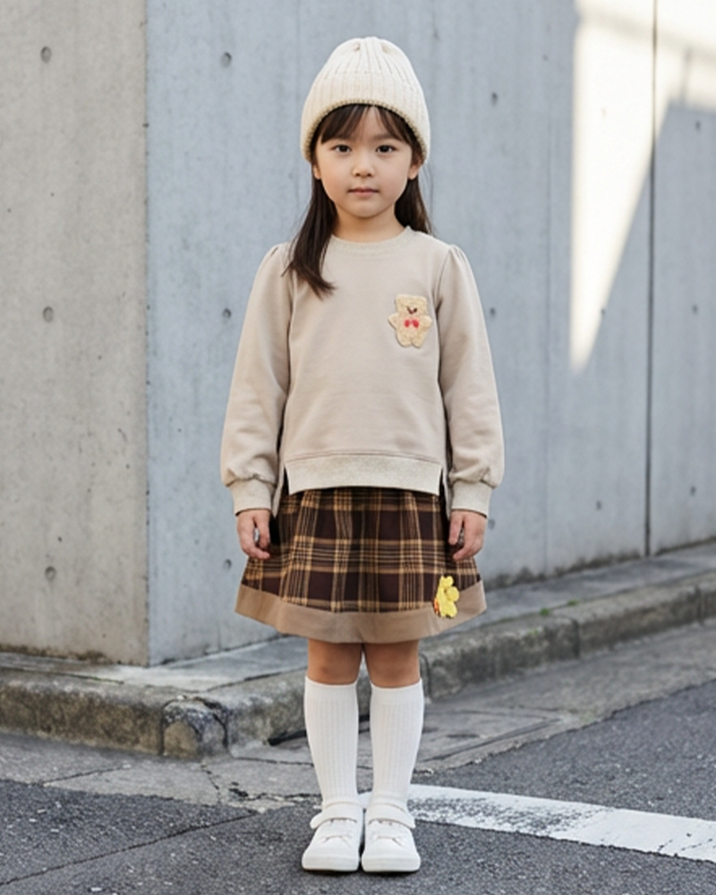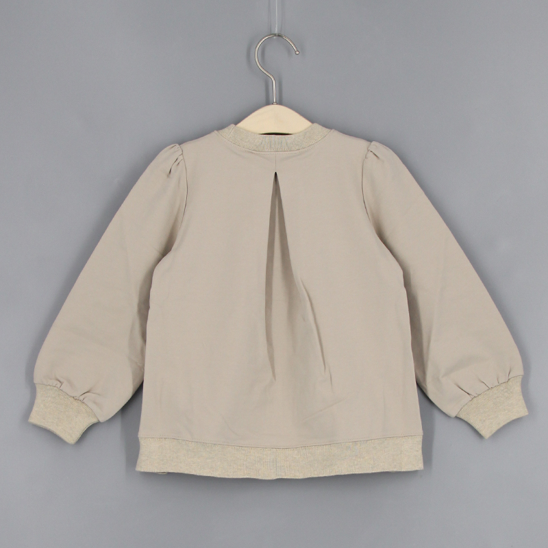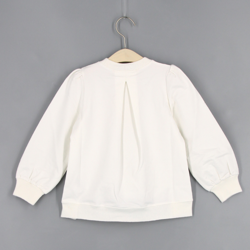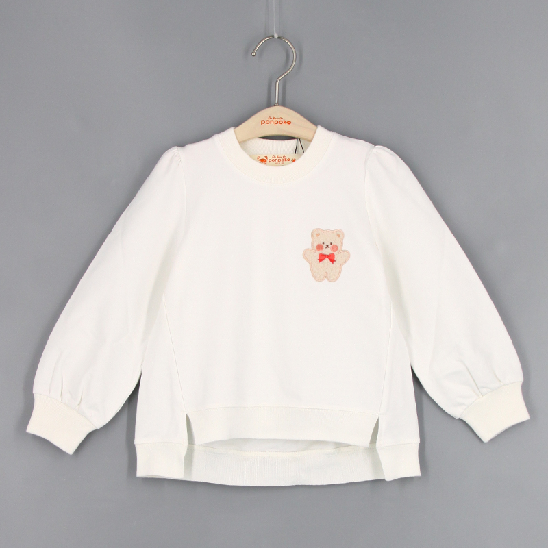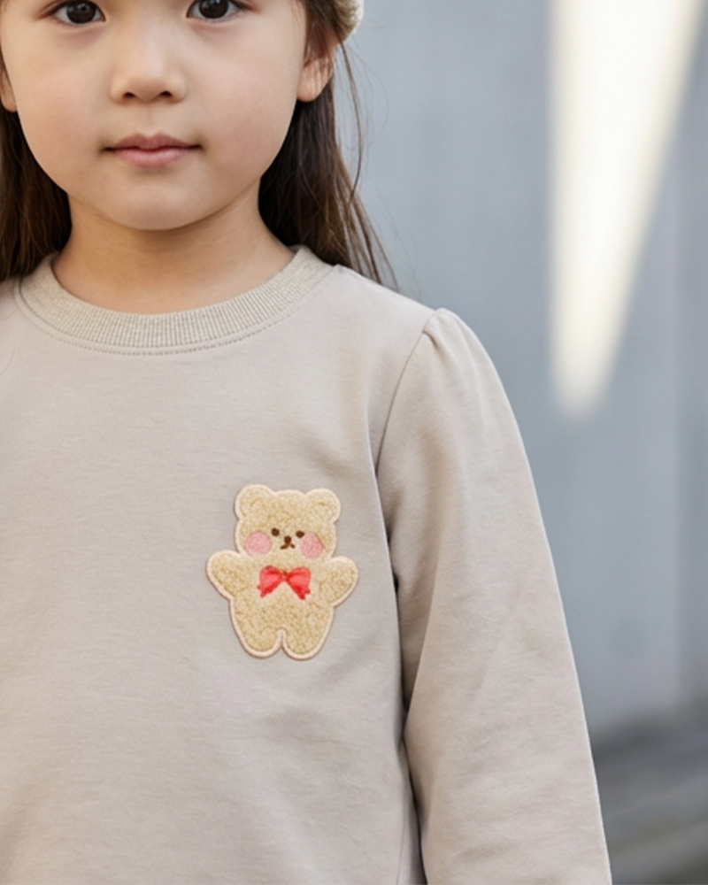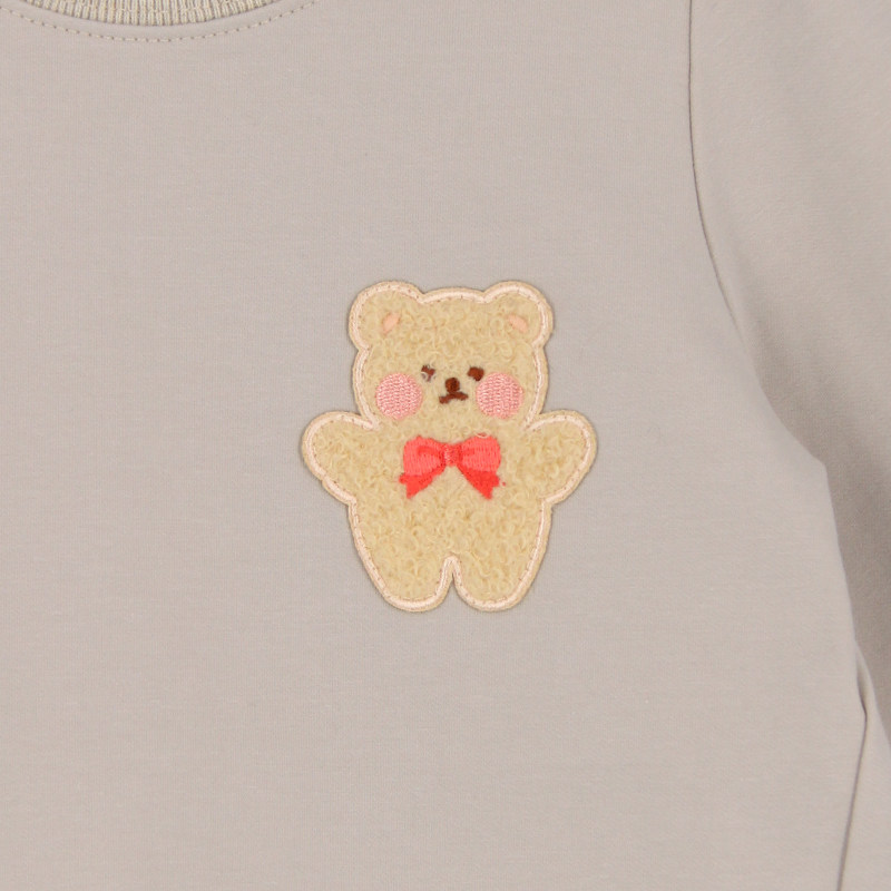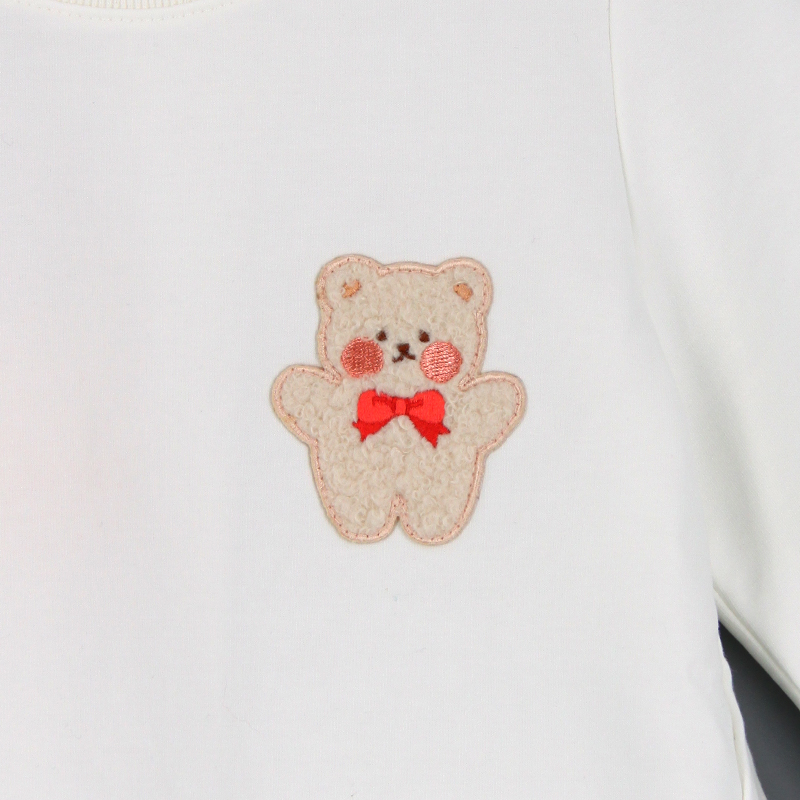 圓領, 羅紋領, 公主袖, 小熊布貼, 壓褶細節, 前短後長衫腳, 羅紋手袖及衫腳