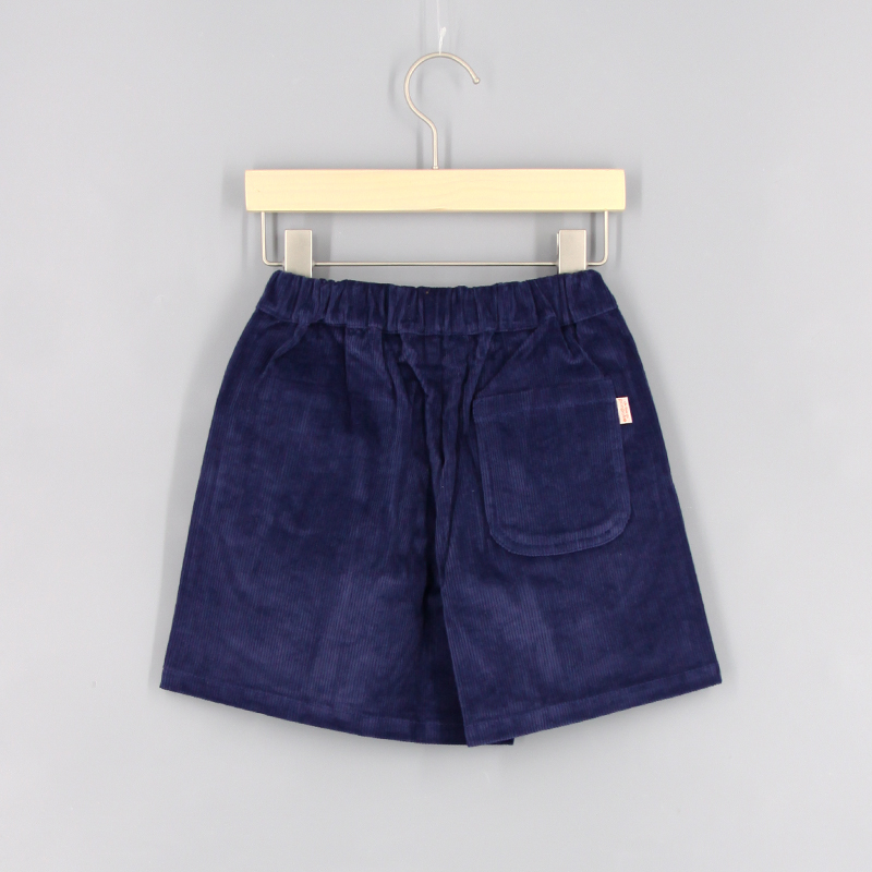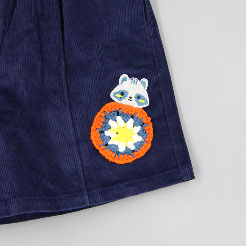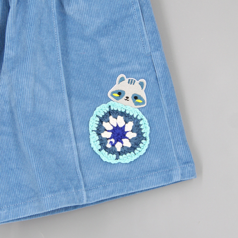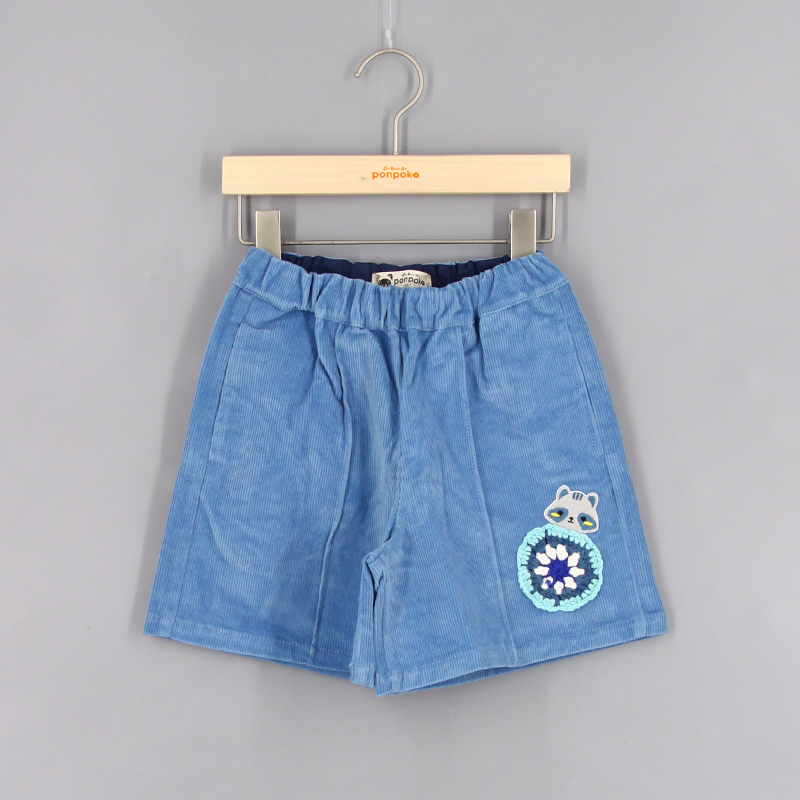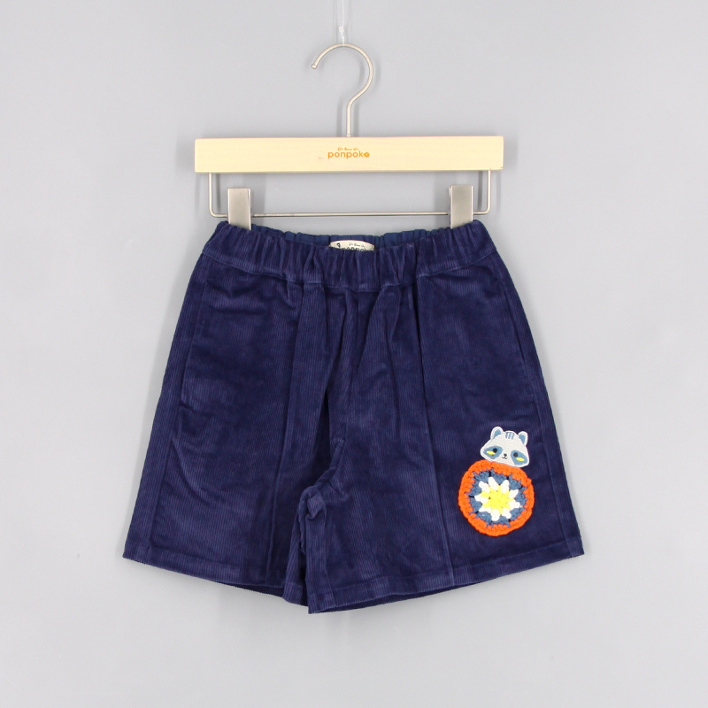 橡筋腰頭, 勾花布貼口袋, 浣熊刺繡章, 兩側口袋, 後方口袋, 品牌小標籤細節, 立體車骨線, 燈芯絨