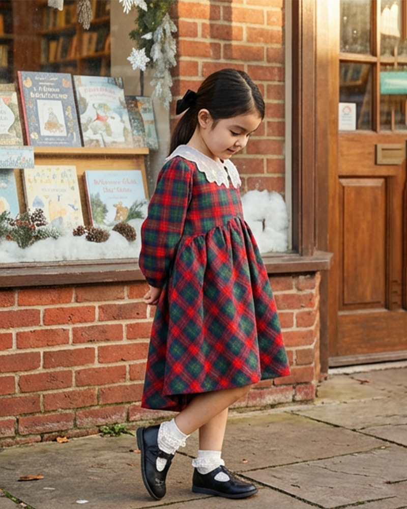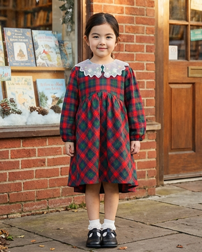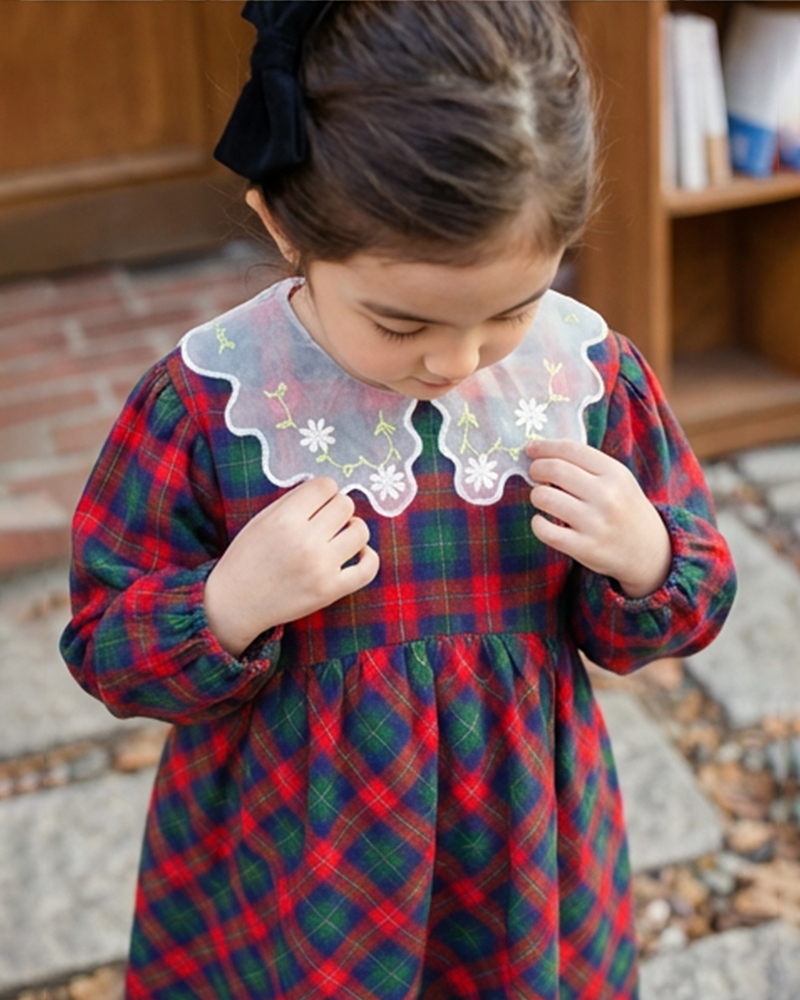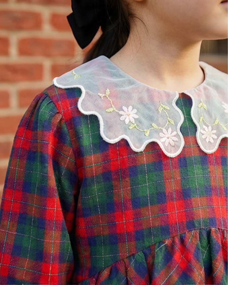 柯根紗刺繡領, 泡泡袖, 彎形腰線, 前短後長衫腳, 後中拉鏈開合, 傘裙, 格仔布