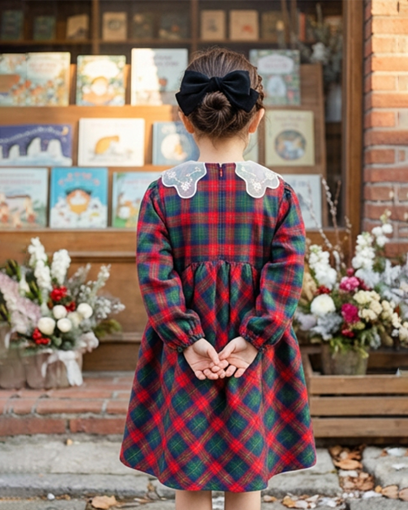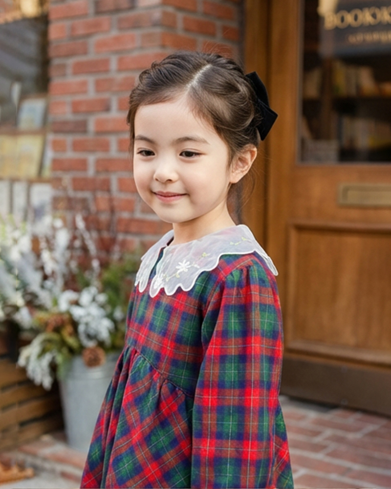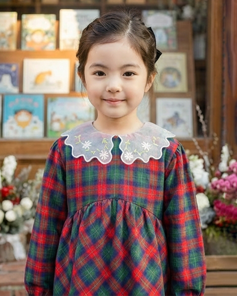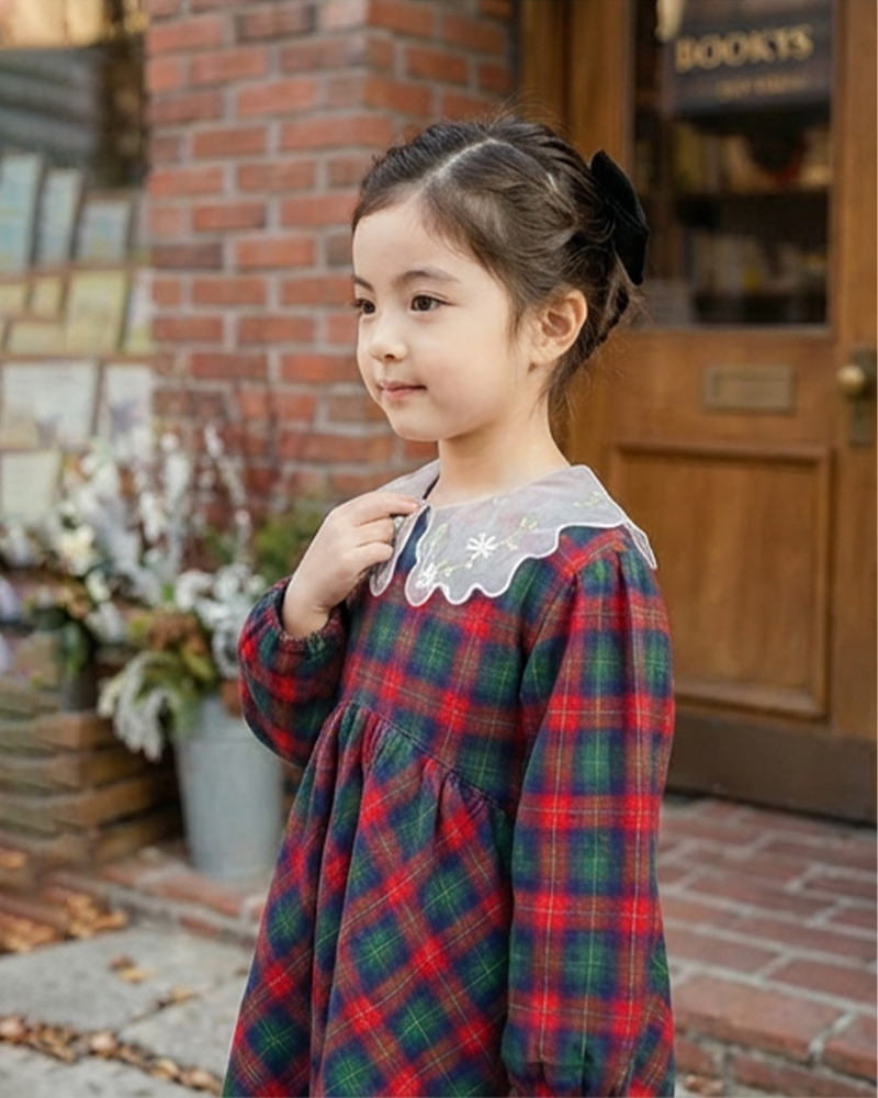 柯根紗刺繡領, 泡泡袖, 彎形腰線, 前短後長衫腳, 後中拉鏈開合, 傘裙, 格仔布