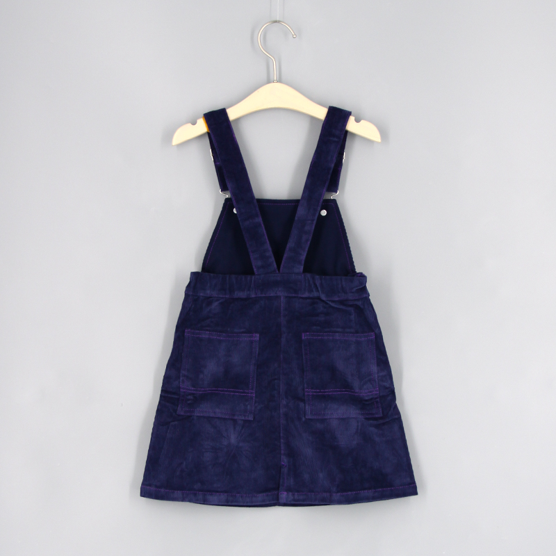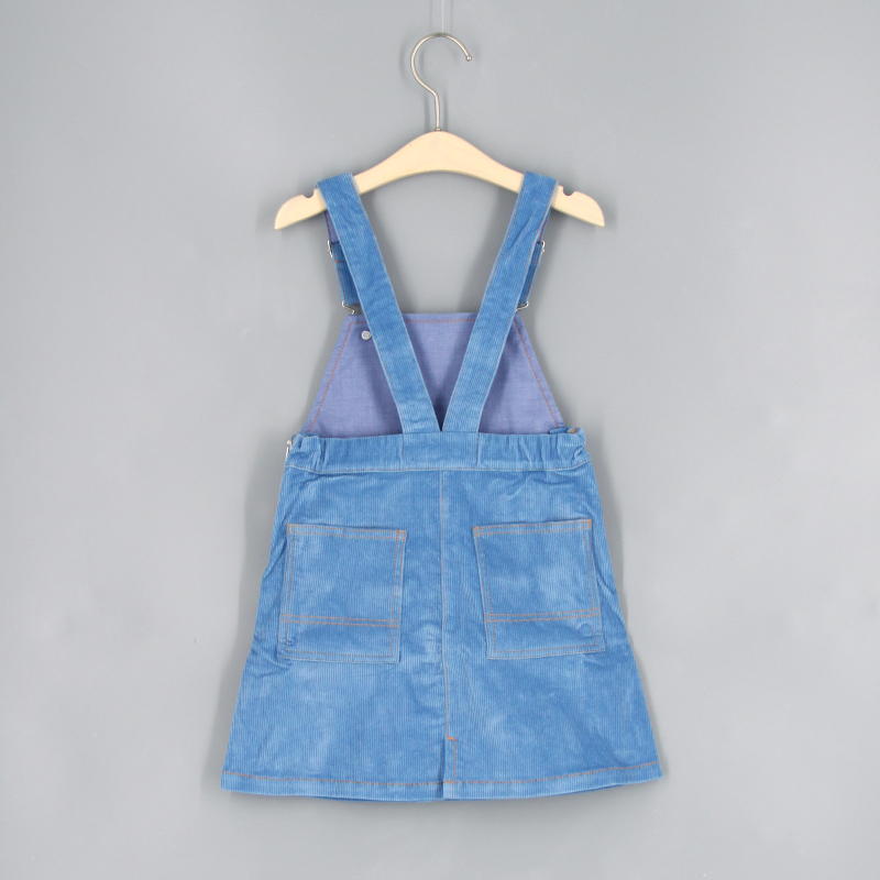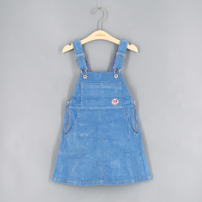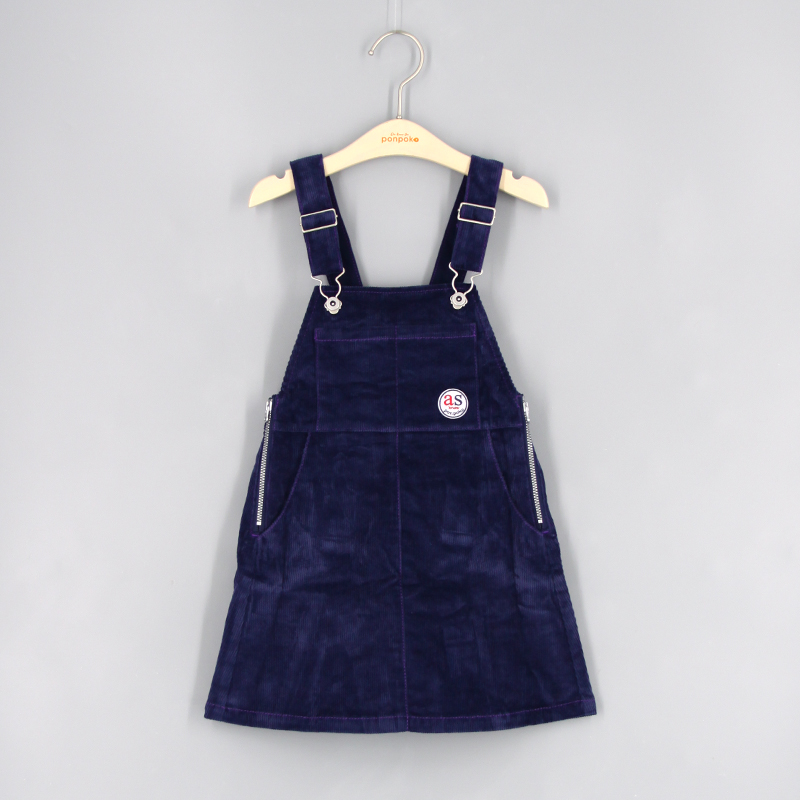 燈芯絨, 方領, 可調式吊帶配卡扣固定, 兩側拉鍊, 前貼袋, 後方口袋, A字裙, 撞色車線, 品牌as車章