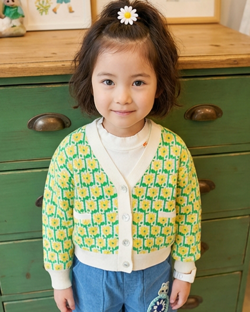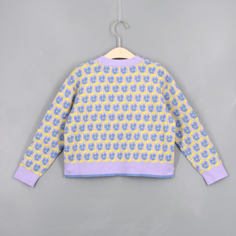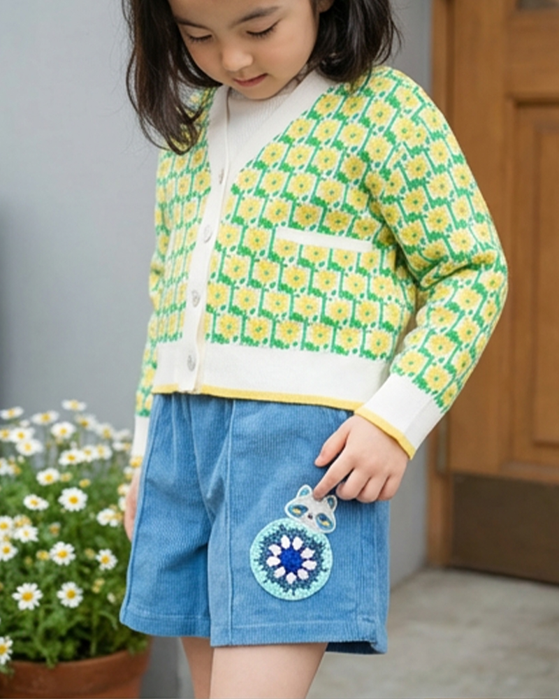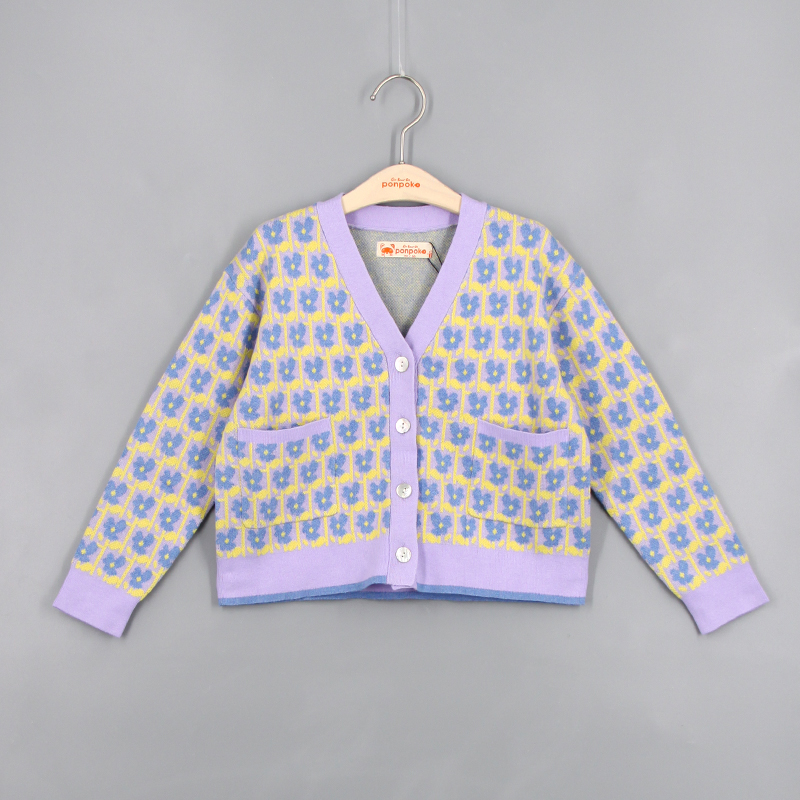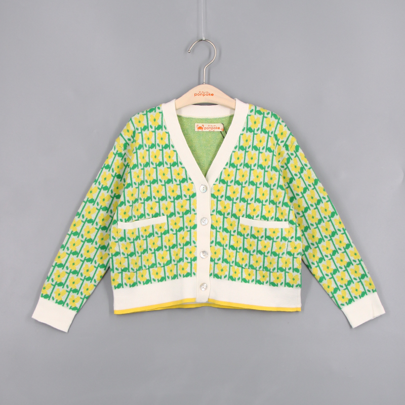 V領, 前中鈕扣開合, 花朵針織圖案, 貝殼鈕, 芝麻針織布, 前方口袋, 長袖, 撞色風格, 全棉, 寬鬆合身