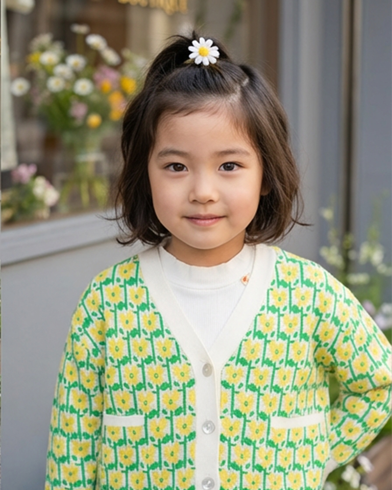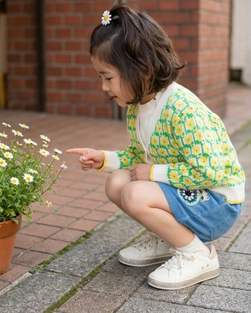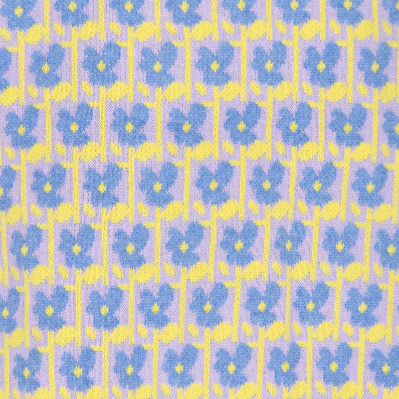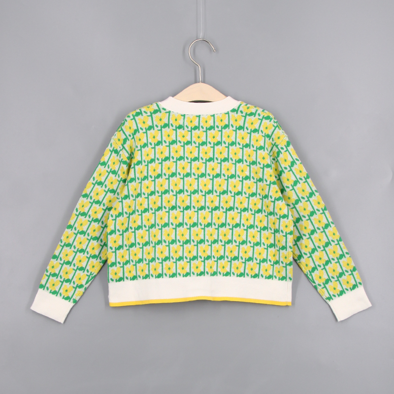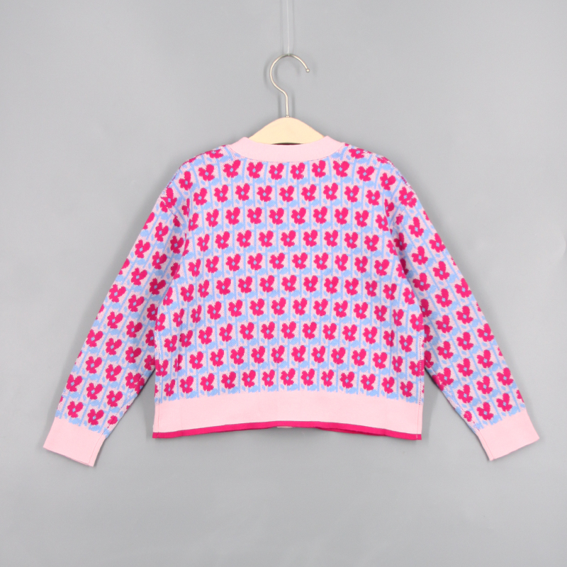 V領, 前中鈕扣開合, 花朵針織圖案, 貝殼鈕, 芝麻針織布, 前方口袋, 長袖, 撞色風格, 全棉, 寬鬆合身