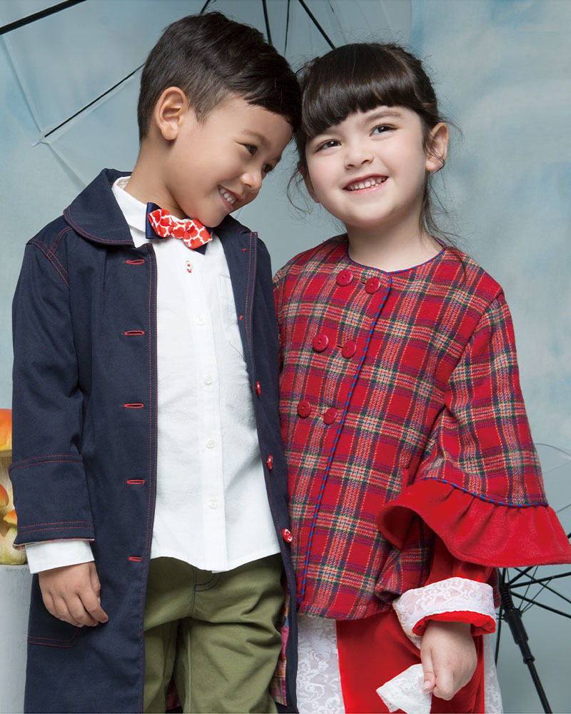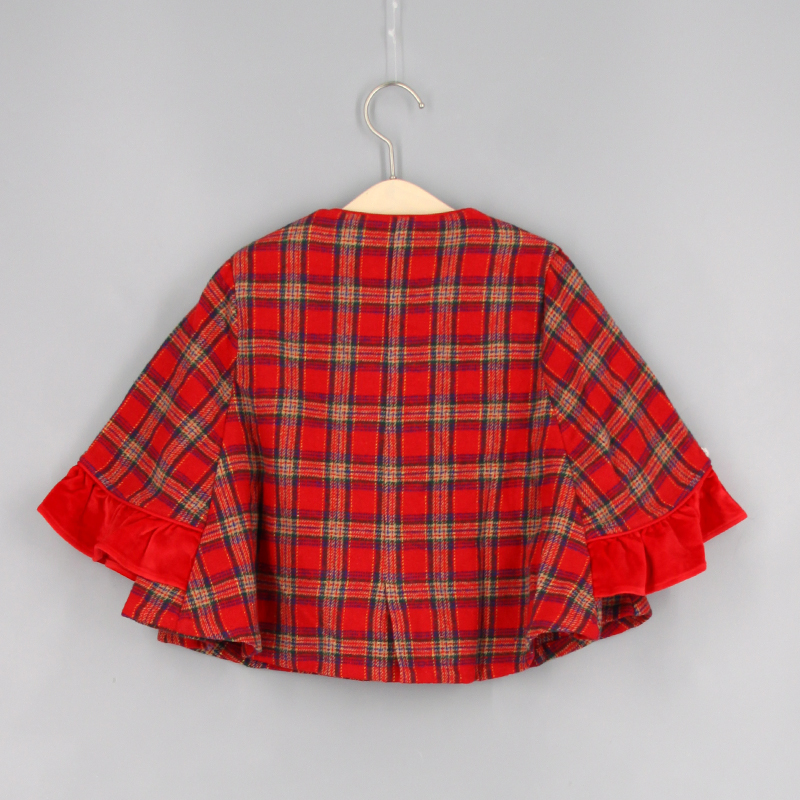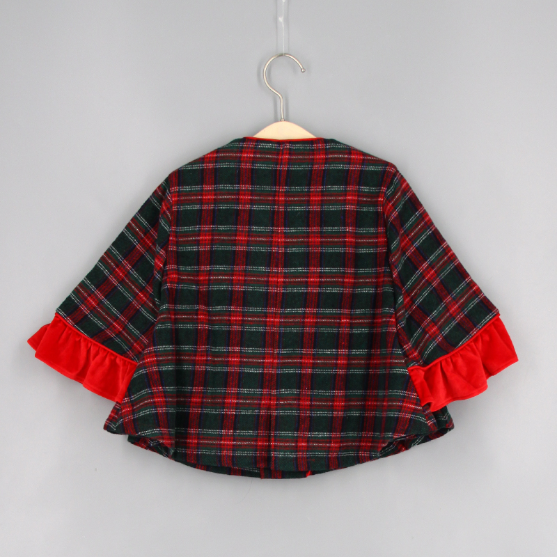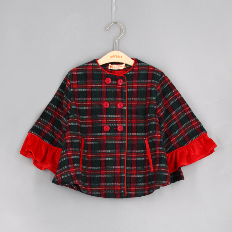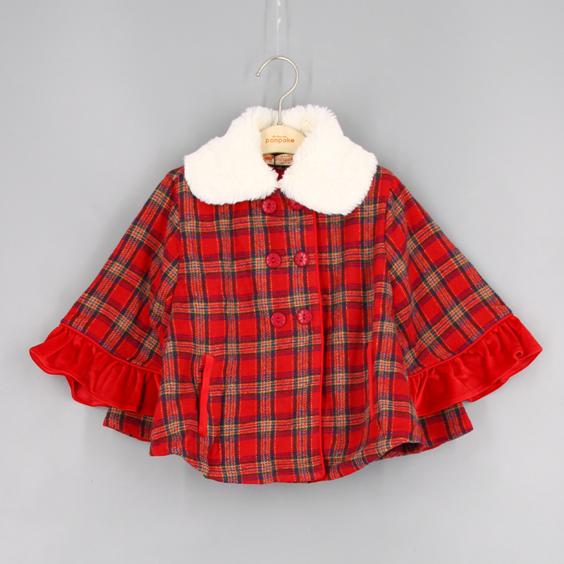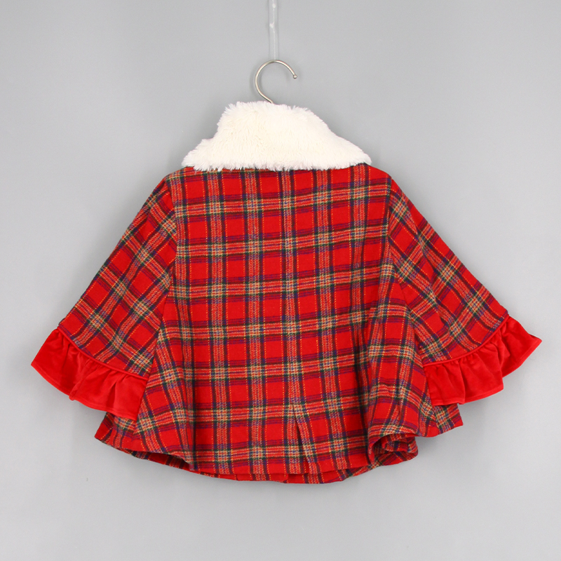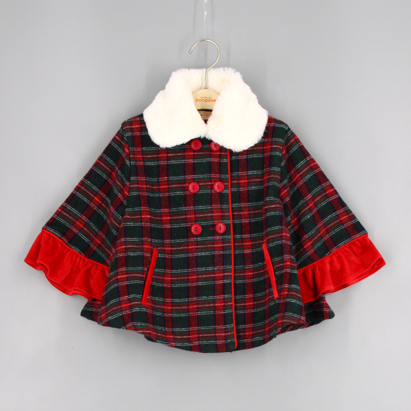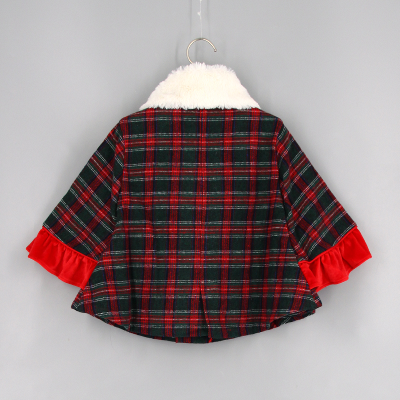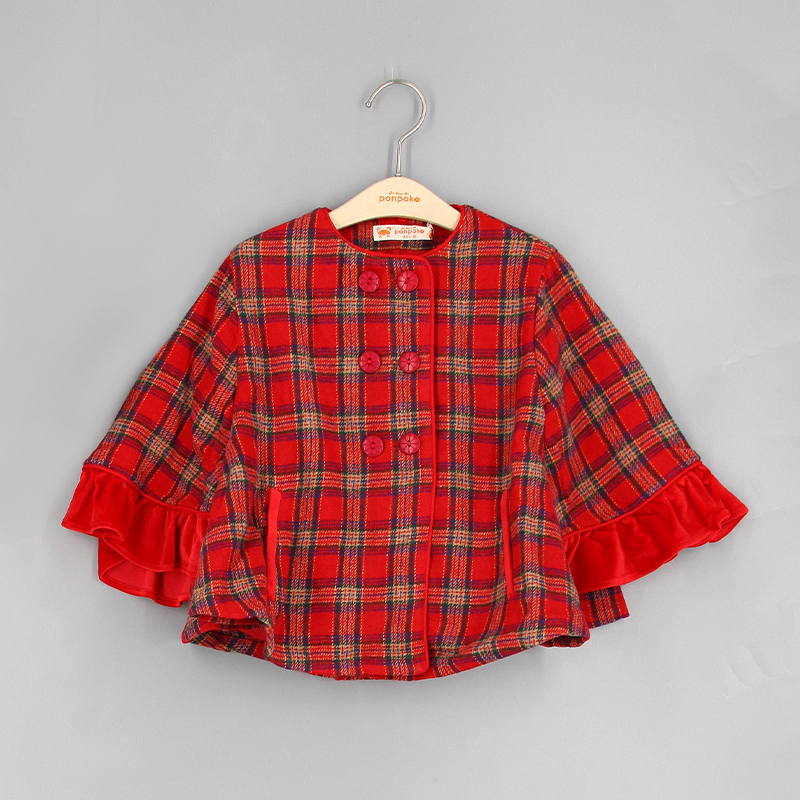 雙排鈕扣, 荷葉袖, 格仔圖案, 暗袋細節, 附毛毛頸帶