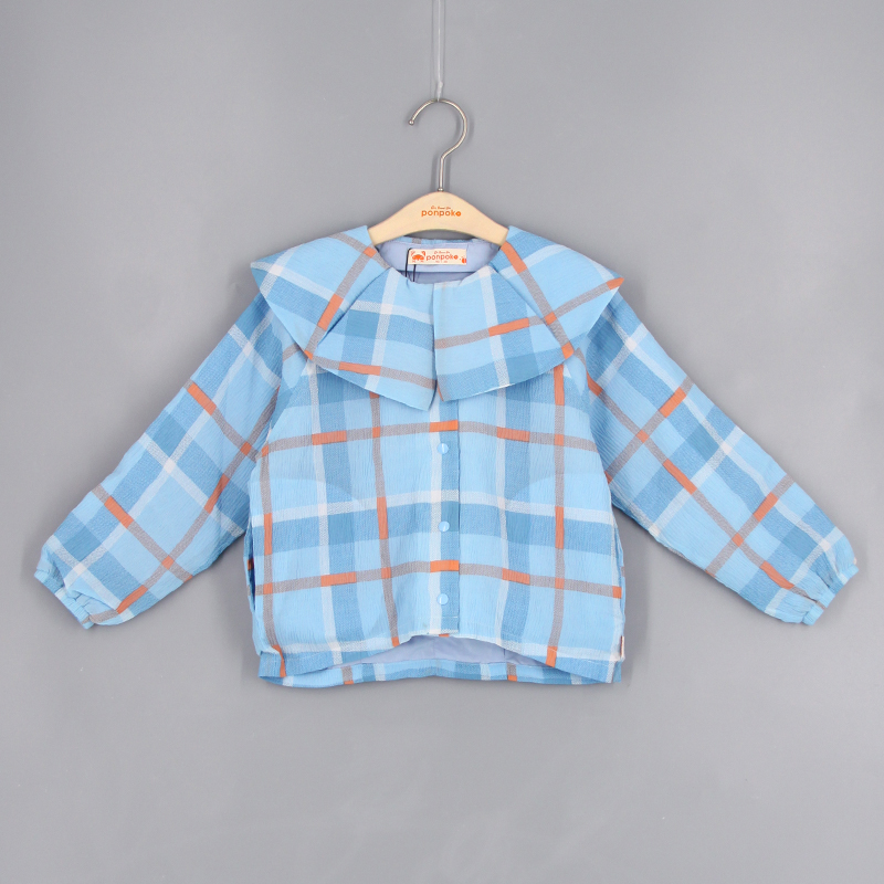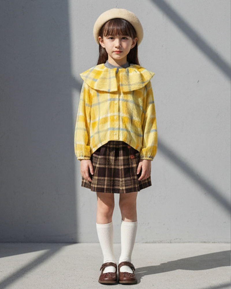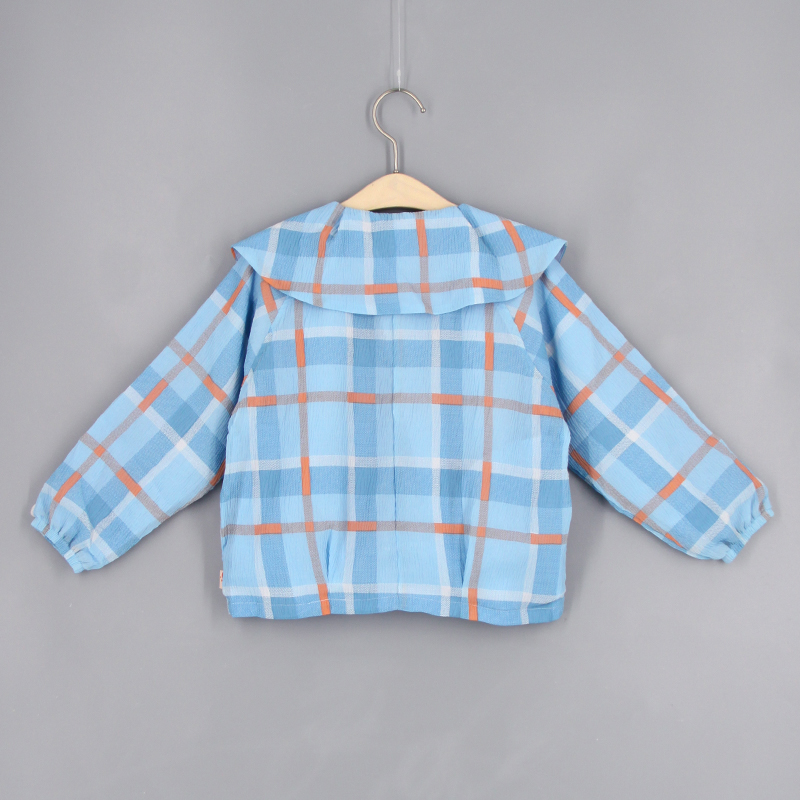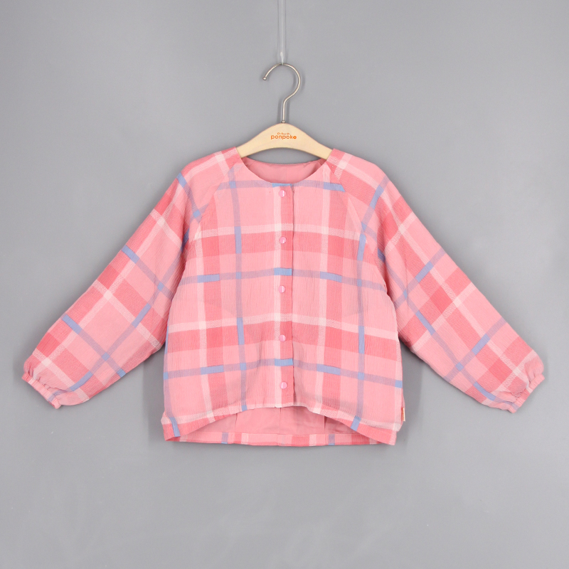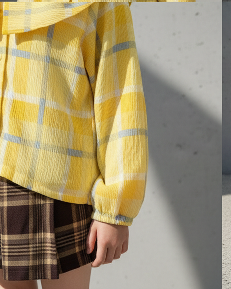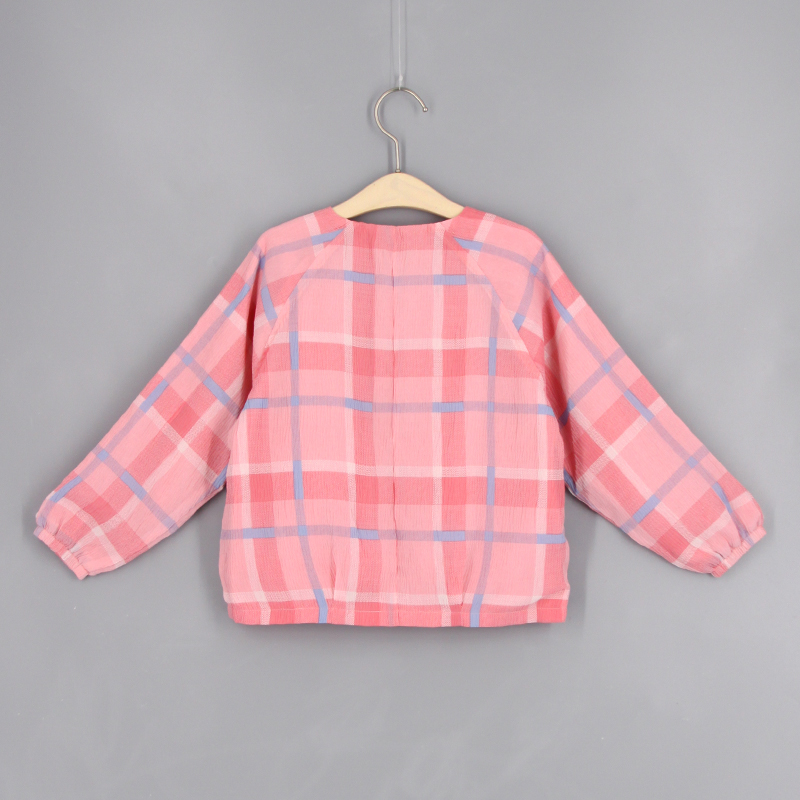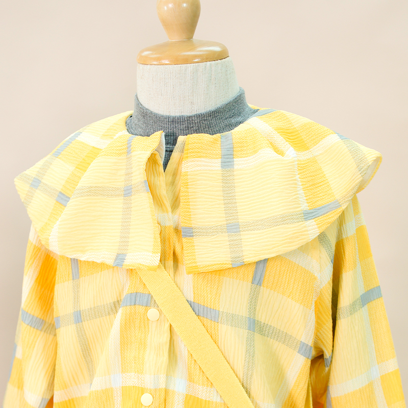 可拆卸衣領, 泡泡袖, 前短後長衫腳, 前中鈕扣開合, 兩側口袋, 鄒鄒布面料, 格仔圖案, 寬鬆版型