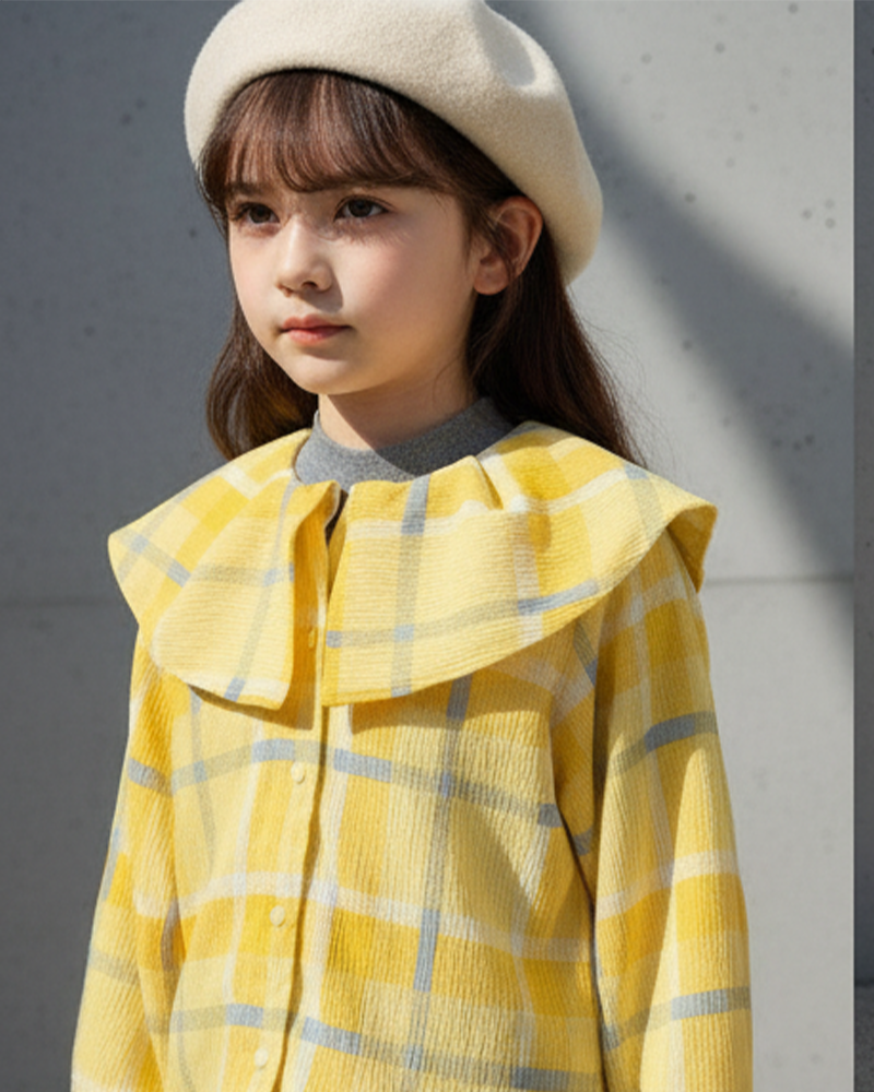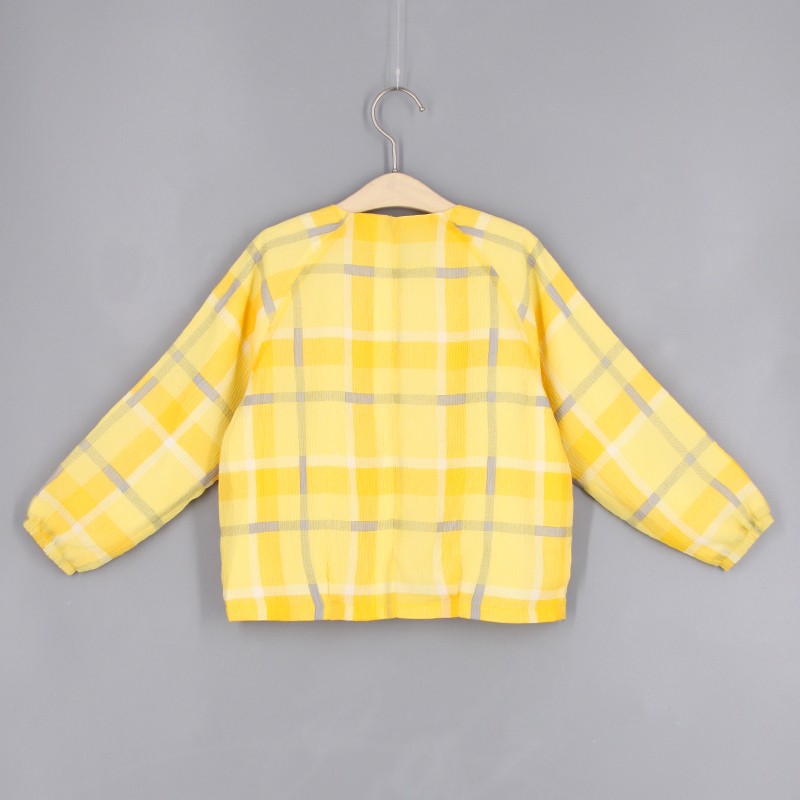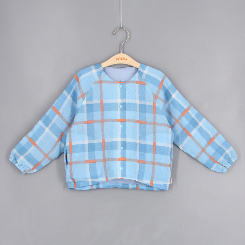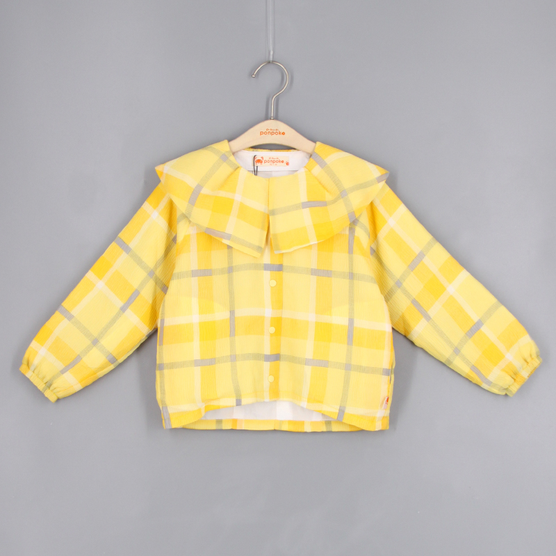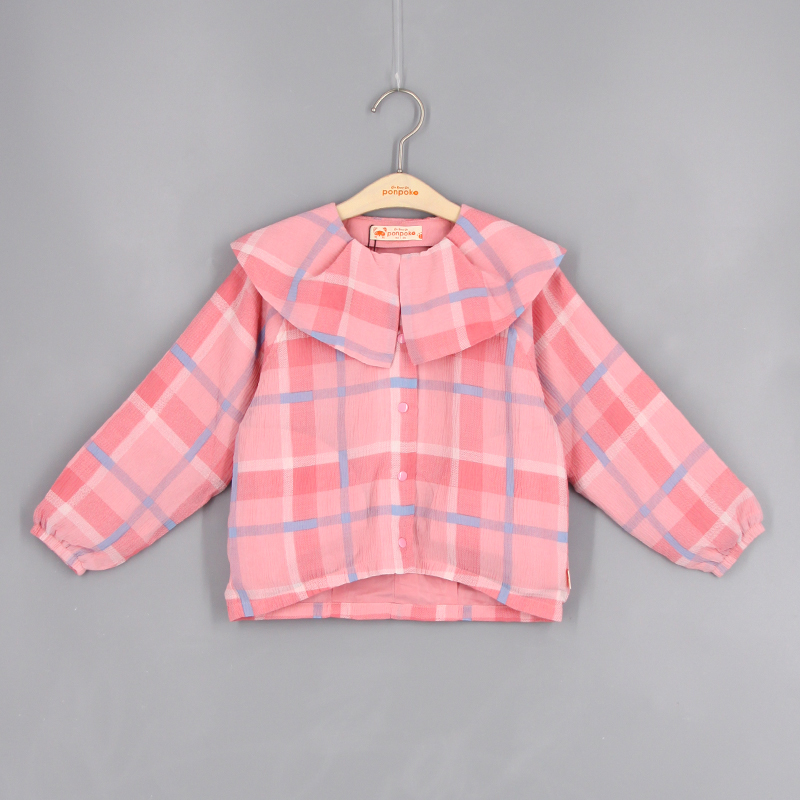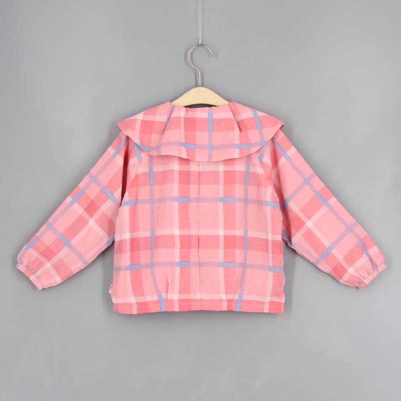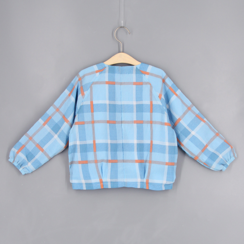 可拆卸衣領, 泡泡袖, 前短後長衫腳, 前中鈕扣開合, 兩側口袋, 鄒鄒布面料, 格仔圖案, 寬鬆版型