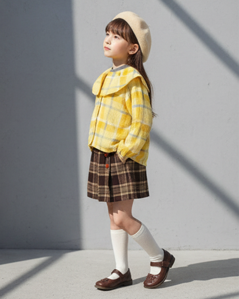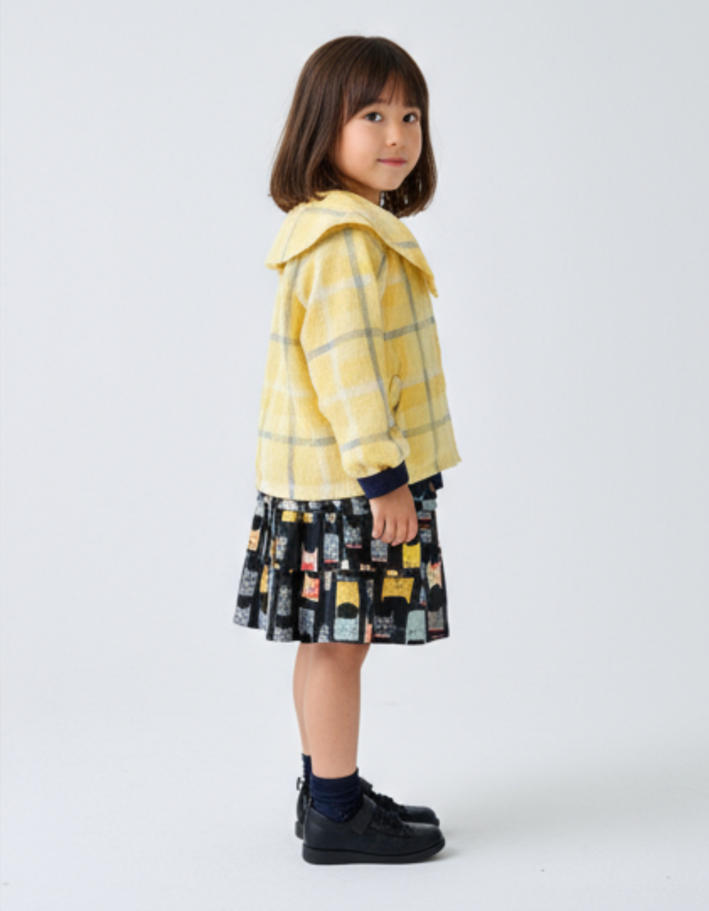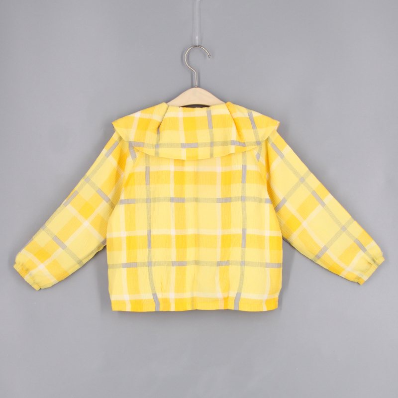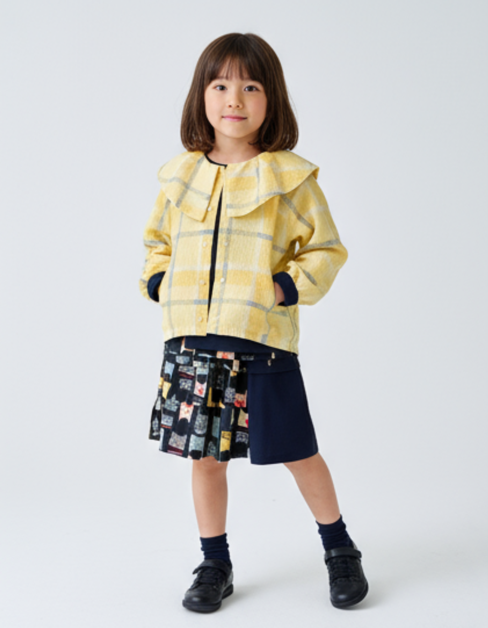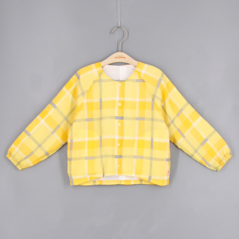 可拆卸衣領, 泡泡袖, 前短後長衫腳, 前中鈕扣開合, 兩側口袋, 鄒鄒布面料, 格仔圖案, 寬鬆版型