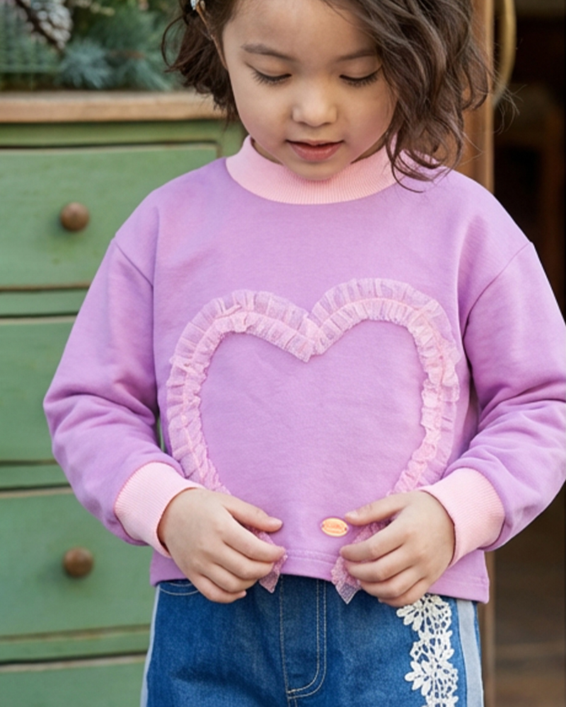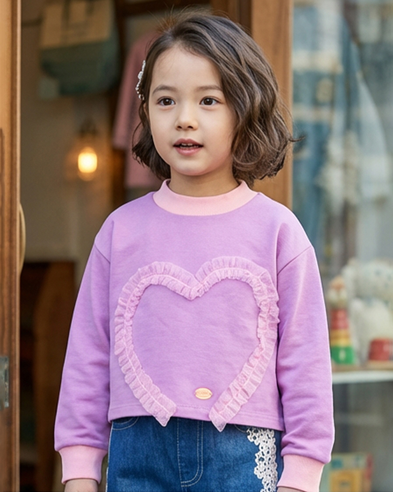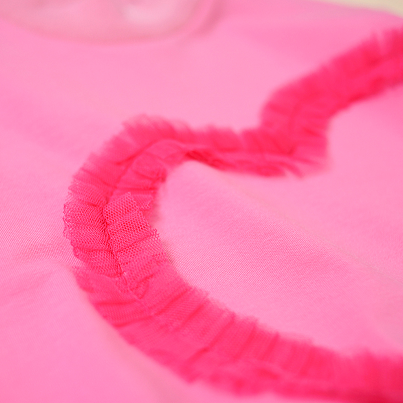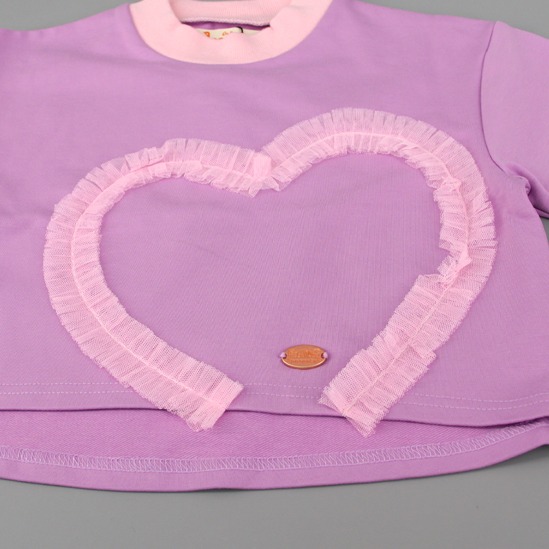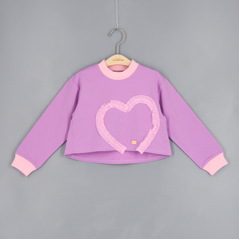 羅紋圓領,短身衫款, 前短後長衫腳,百褶邊大心形圖案, 品牌金屬章, 線圈底衛衣布料