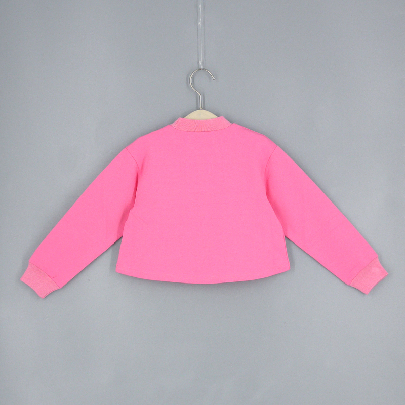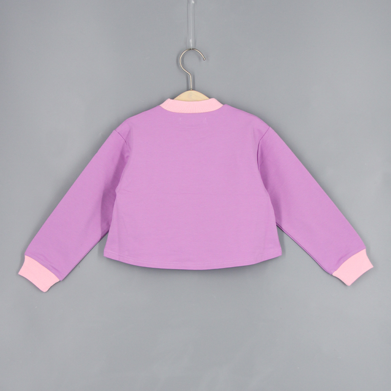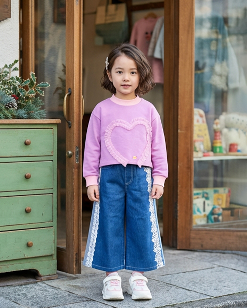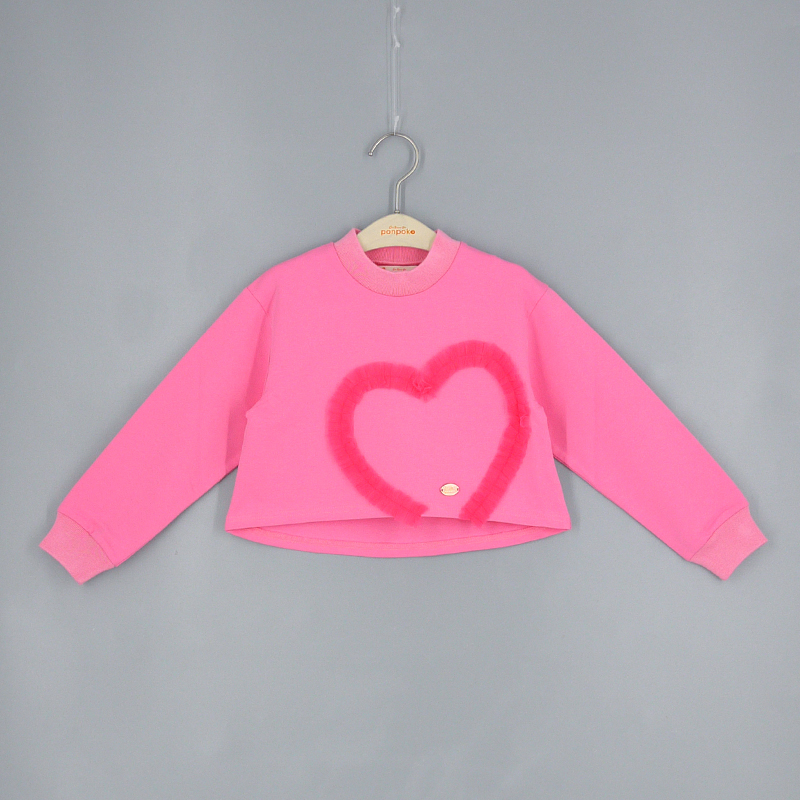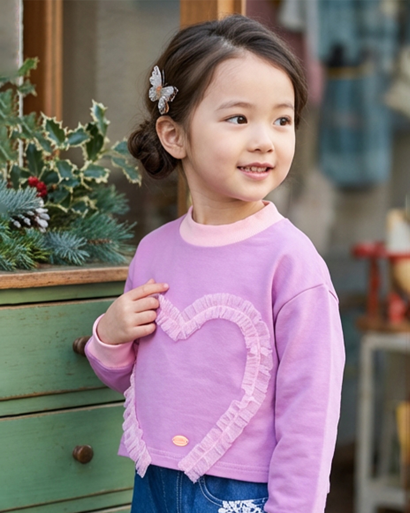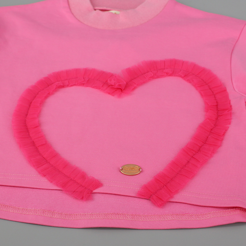 羅紋圓領,短身衫款, 前短後長衫腳,百褶邊大心形圖案, 品牌金屬章, 線圈底衛衣布料