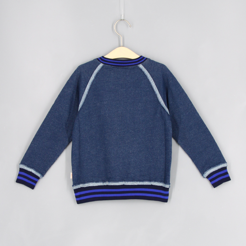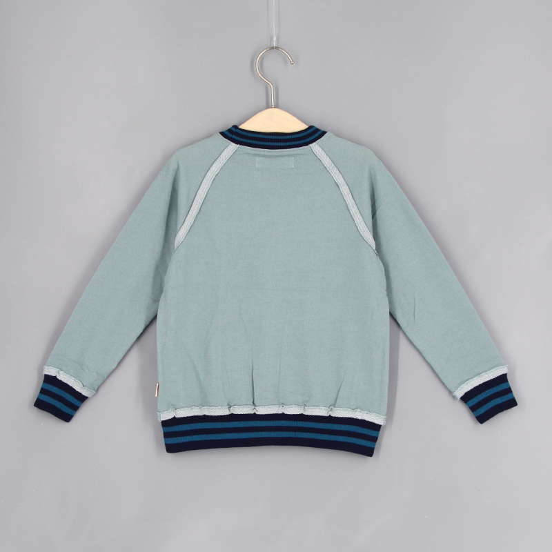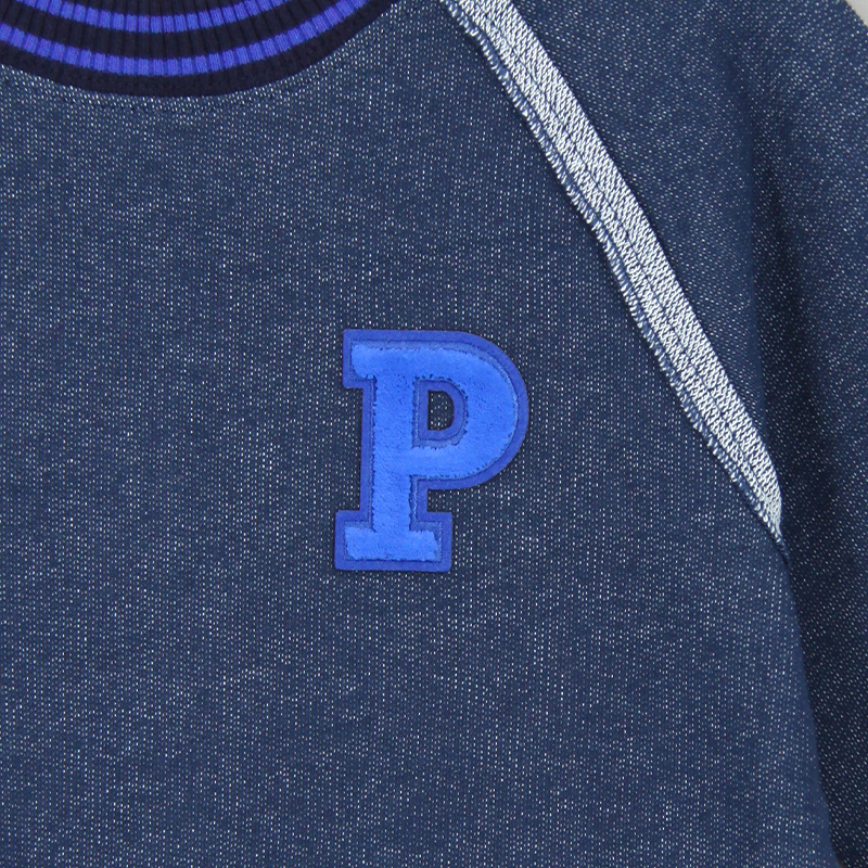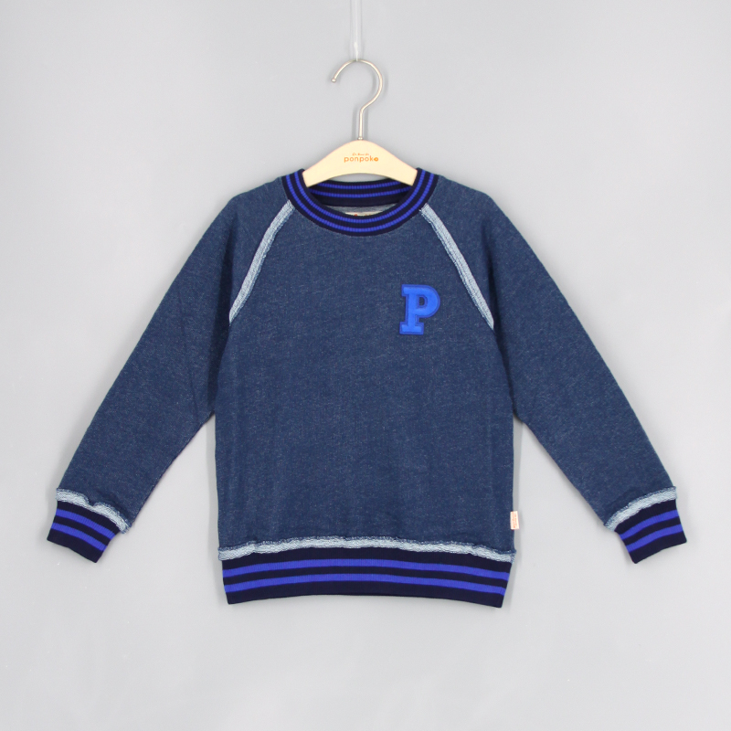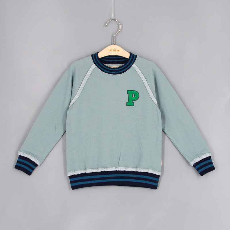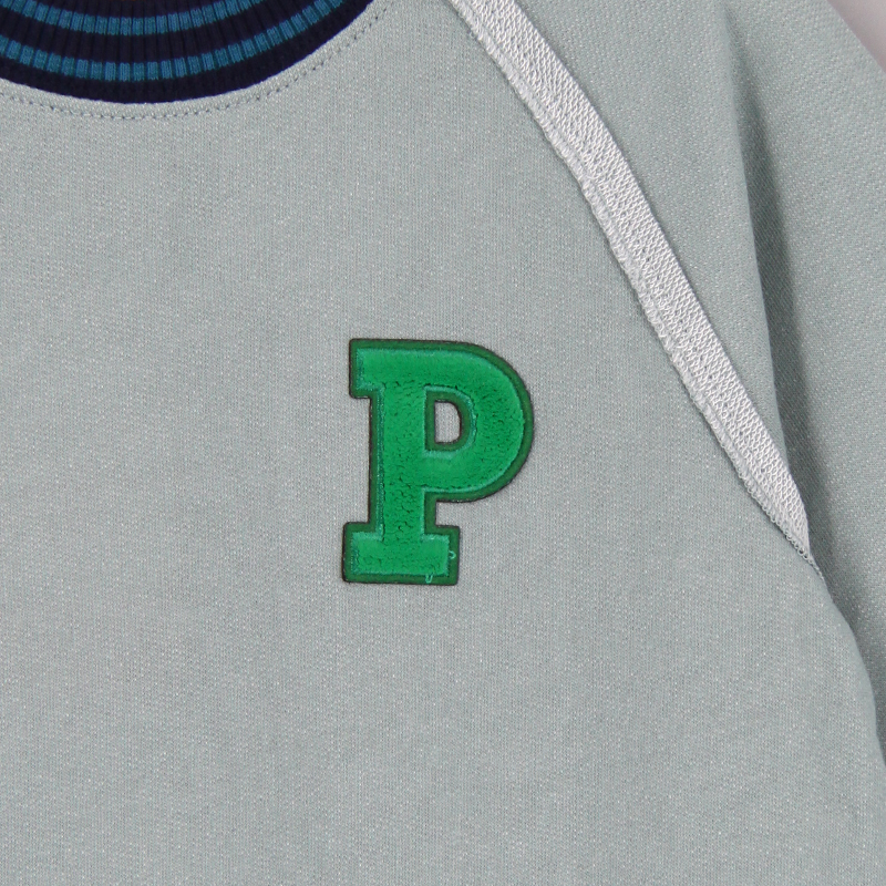 圓領, 牛角袖, 卷邊設計, 毛刷刺繡章, 間色羅紋邊, 寬鬆版型