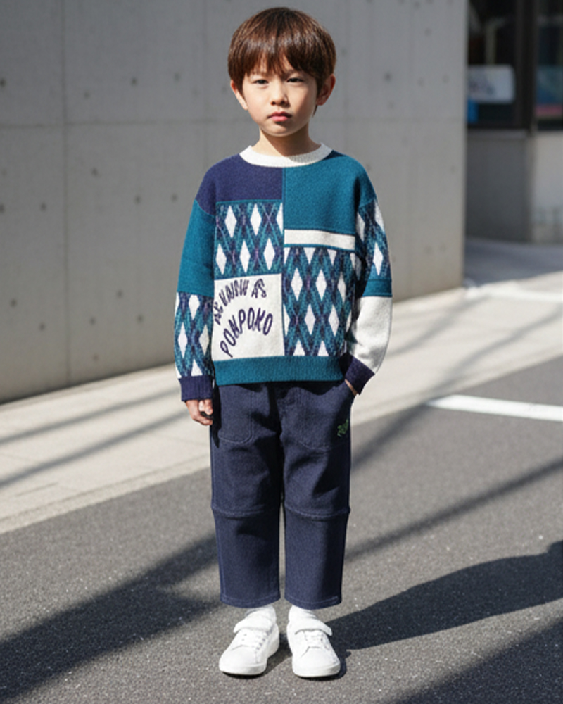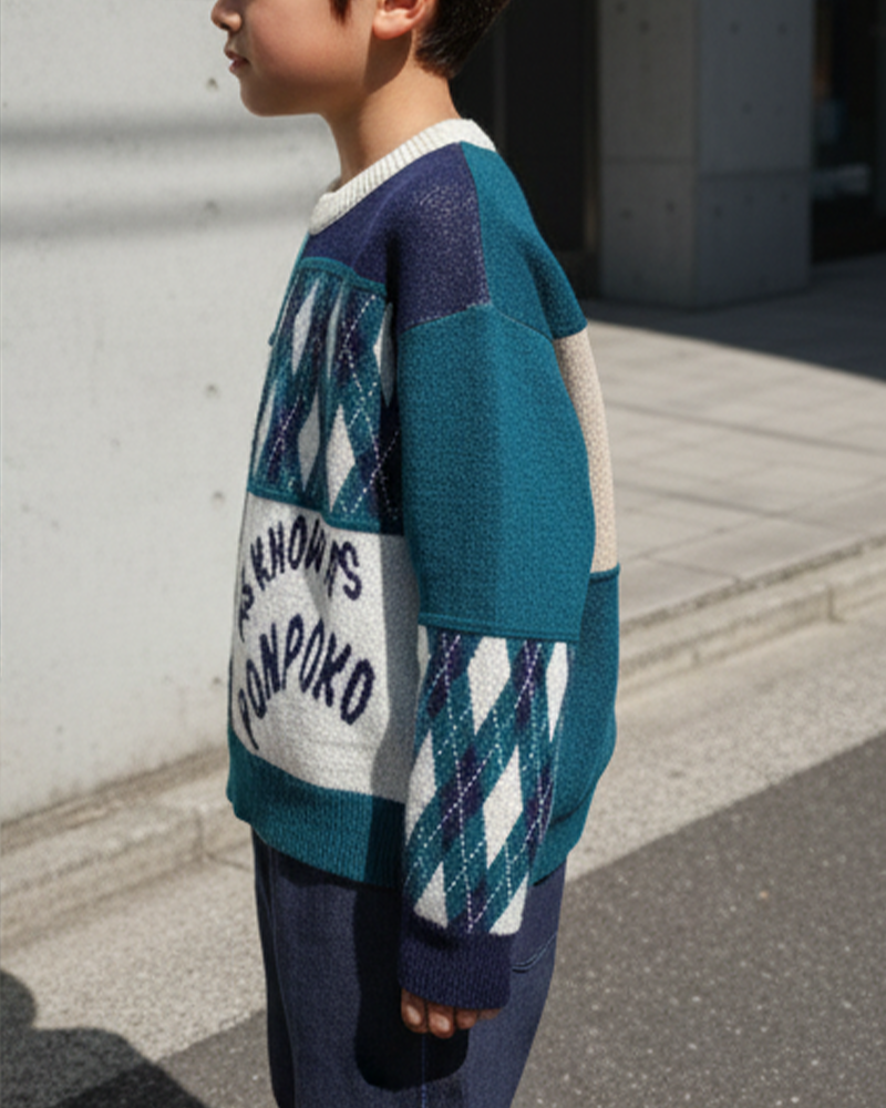 羅紋圓領, 菱形格圖案, 羅紋手袖及衫腳, 拼色風格, Ponpoko針織字樣, 全棉, 合身款式