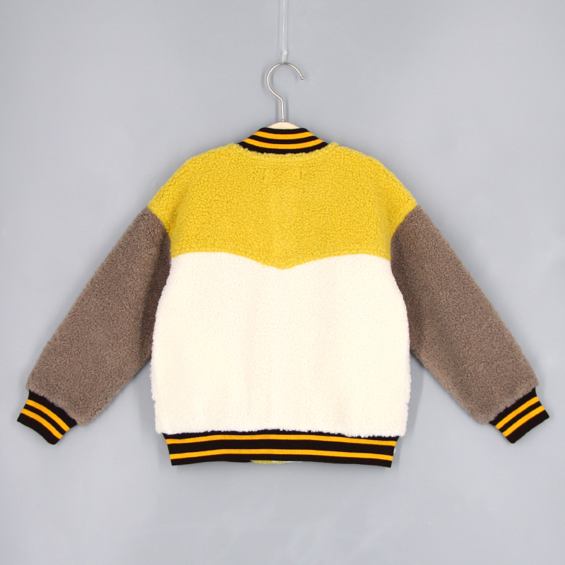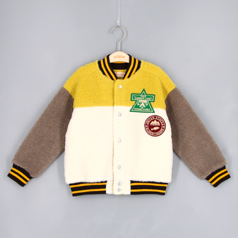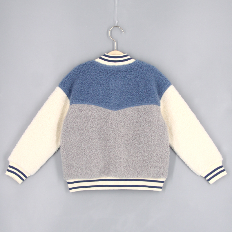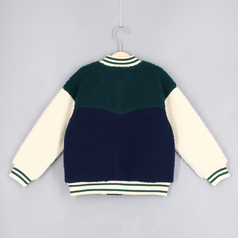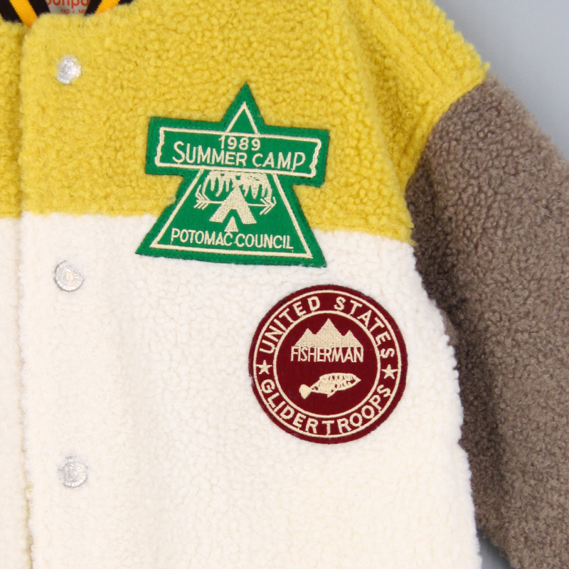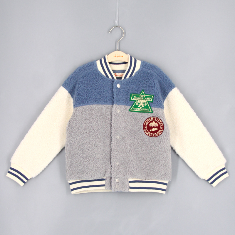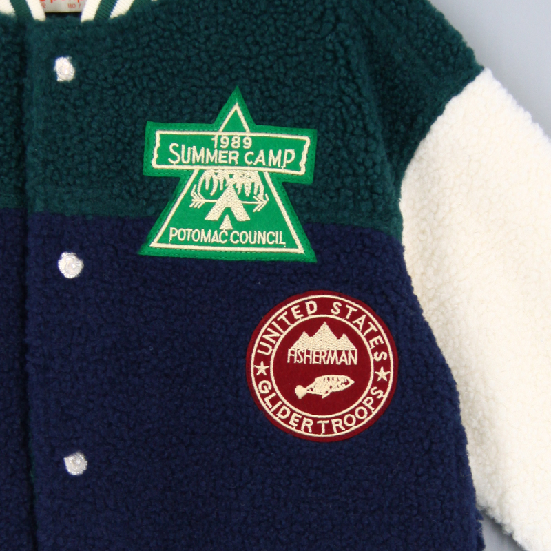 棒球領, 間色羅紋邊, 側袋細節, 前中鈕扣開合, 喼鈕開合, 長袖, 刺繡貼章, 寬鬆版形, 泰迪絨布料, 款式柔軟輕身
