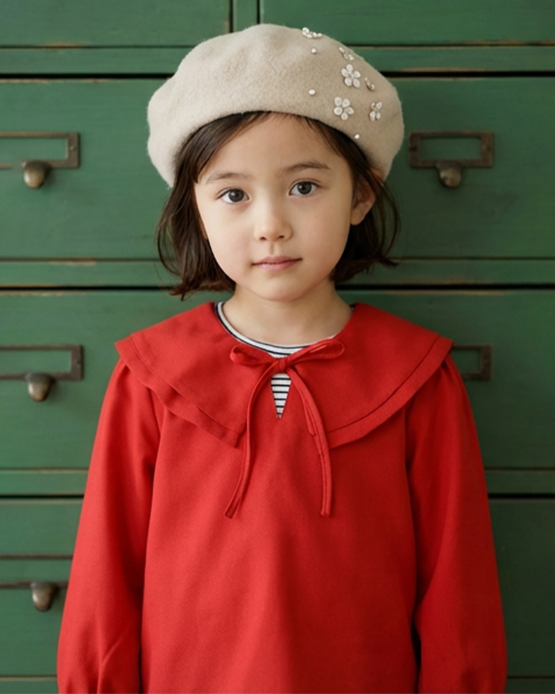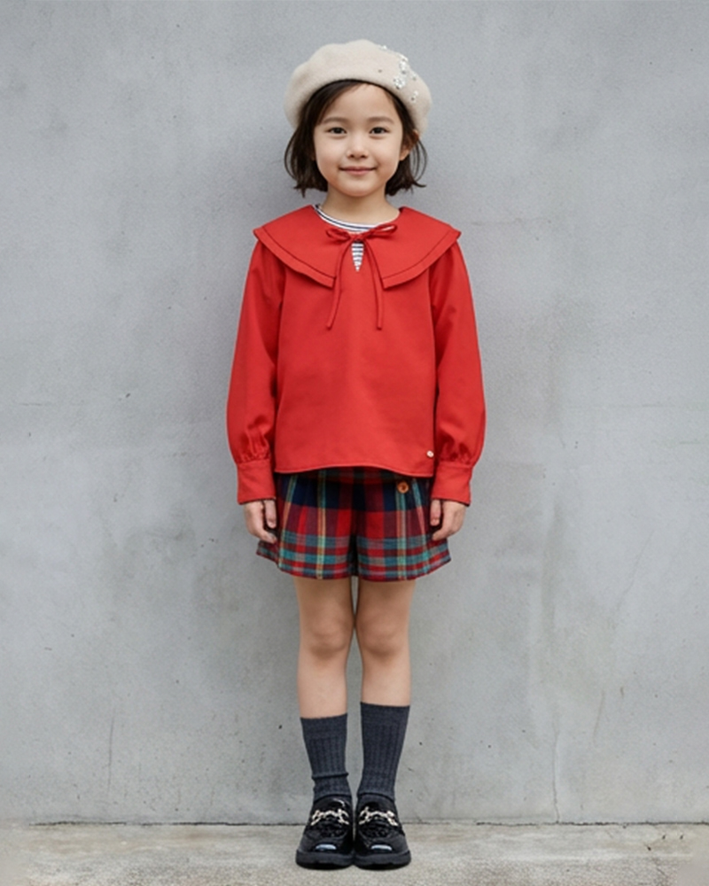 雙層圍兜領, 泡泡袖, 鈕扣開合的袖口, 蝴蝶結領帶, 品牌金屬章, 小寬鬆款式
