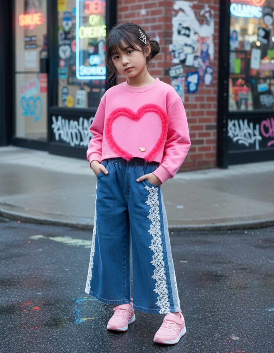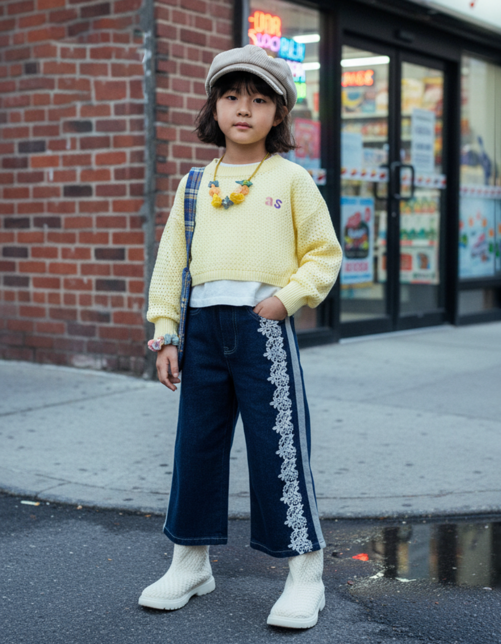 彈性牛仔布料, 橡筋腰頭, 蕾絲花邊縫飾 ,兩側口袋, 闊腳褲