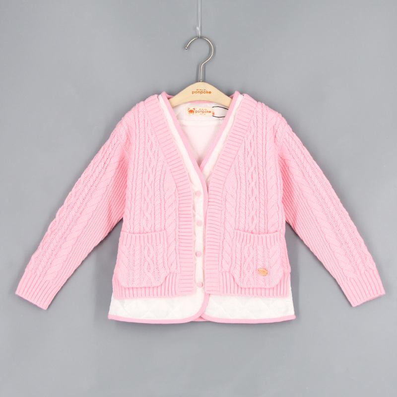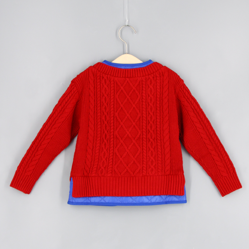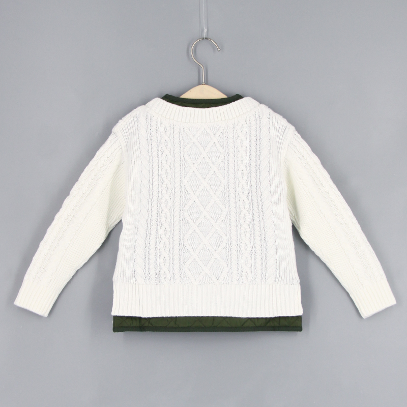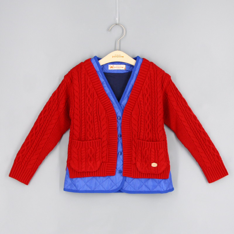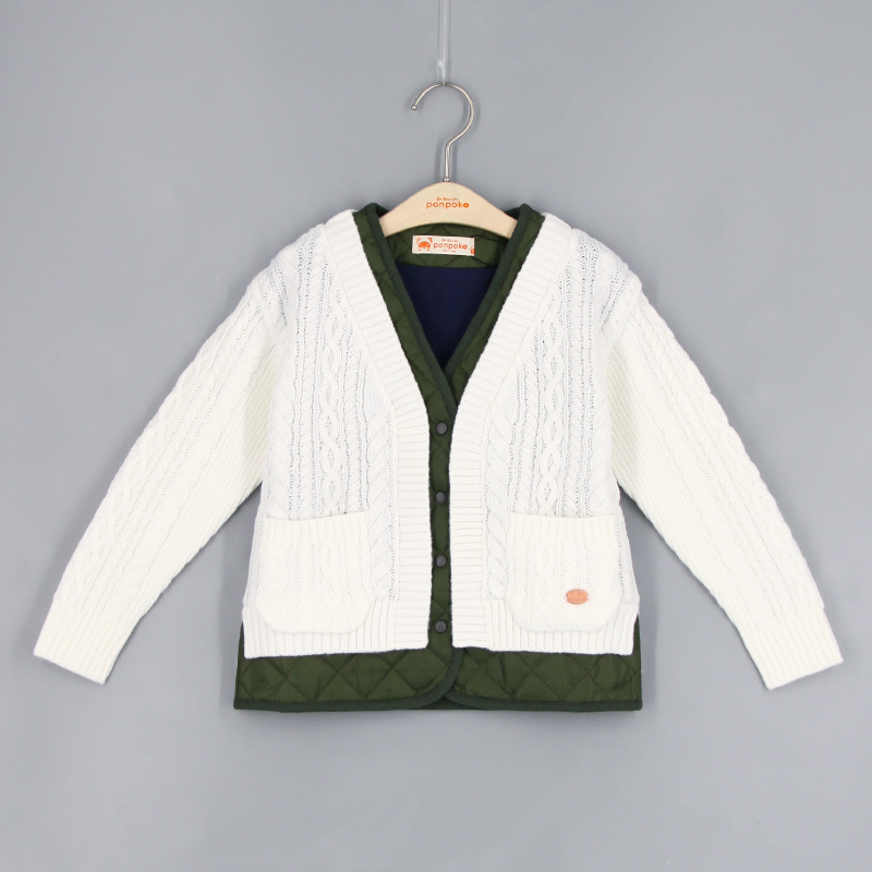 V領, 間棉拼針織布, 前方口袋, 前中鈕扣開合, 針織扭紋設計, 粗針毛線, 品牌小標籤細節, 假兩件外套, 撞色風格, 男女通用款式