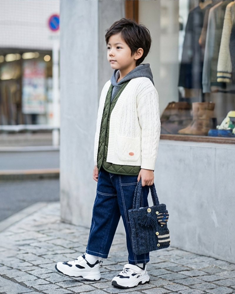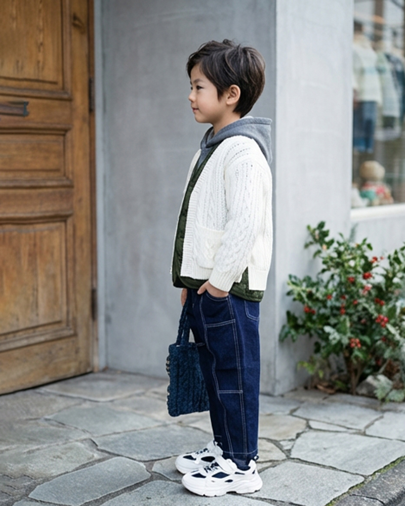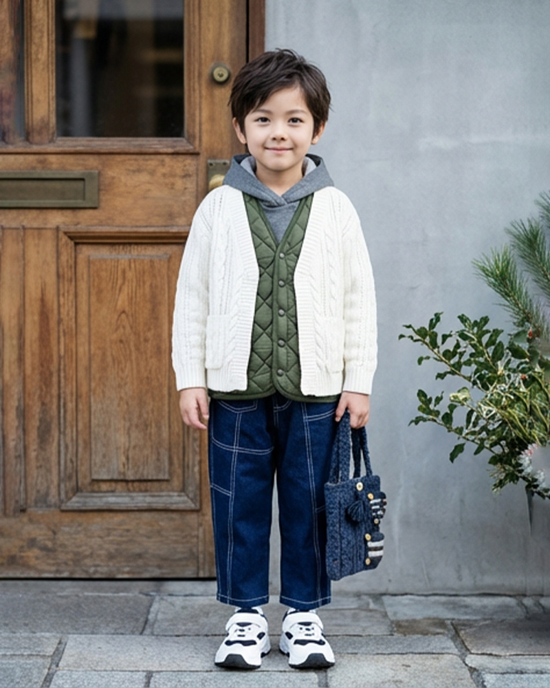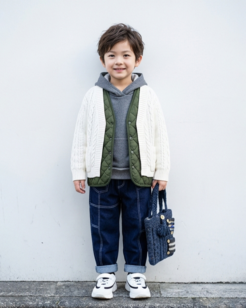 V領, 間棉拼針織布, 前方口袋, 前中鈕扣開合, 針織扭紋設計, 粗針毛線, 品牌小標籤細節, 假兩件外套, 撞色風格, 男女通用款式