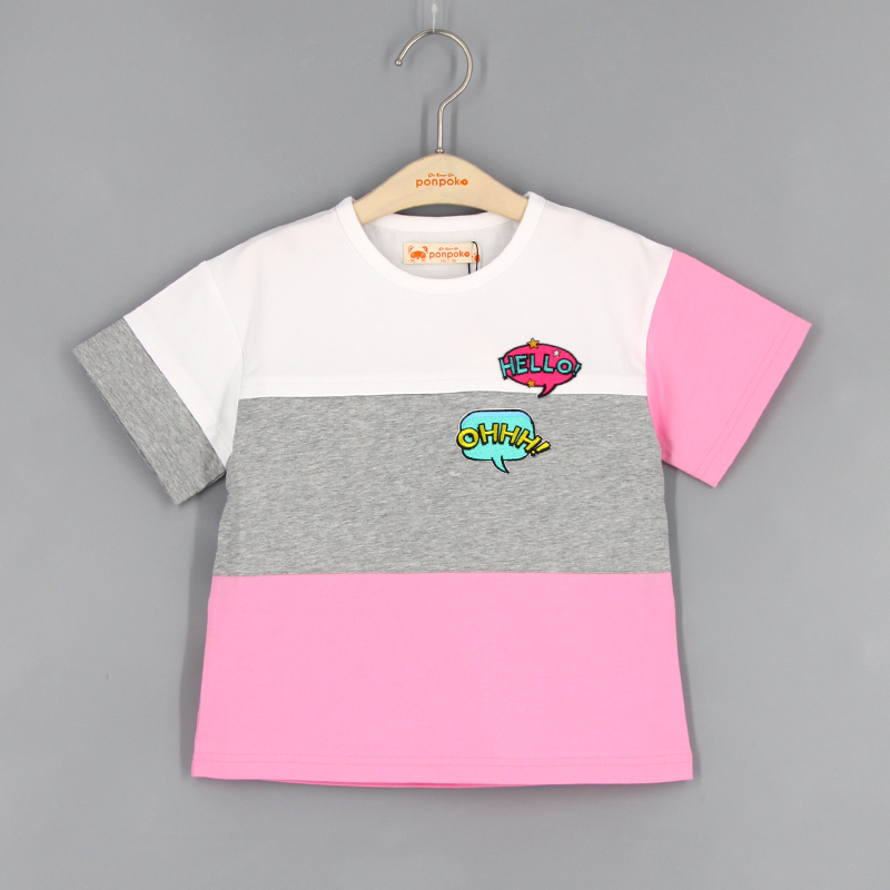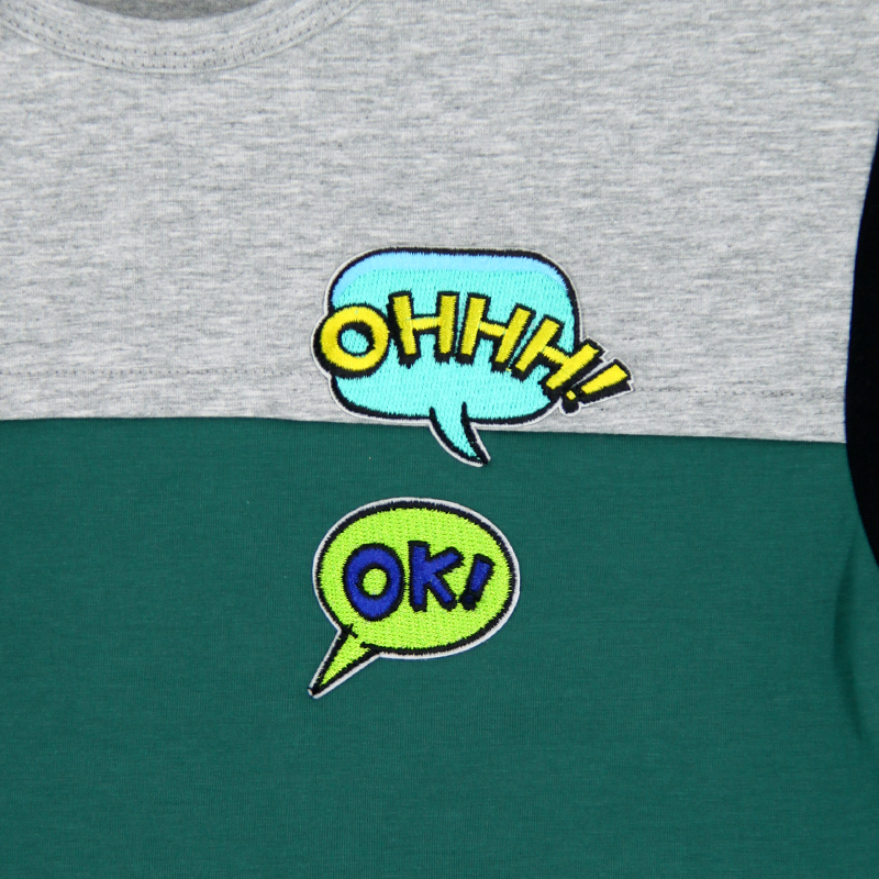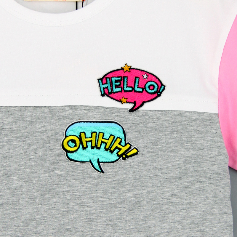 圓領, 對話泡泡布貼, 拼色風格, 跌膊款, 合身款式