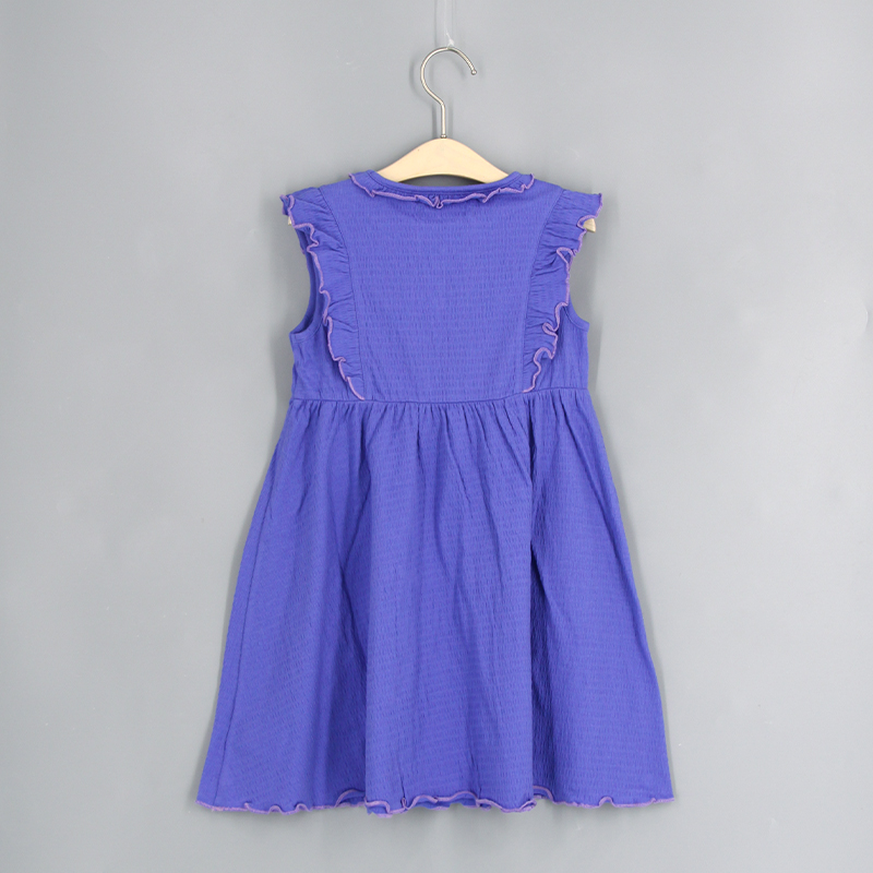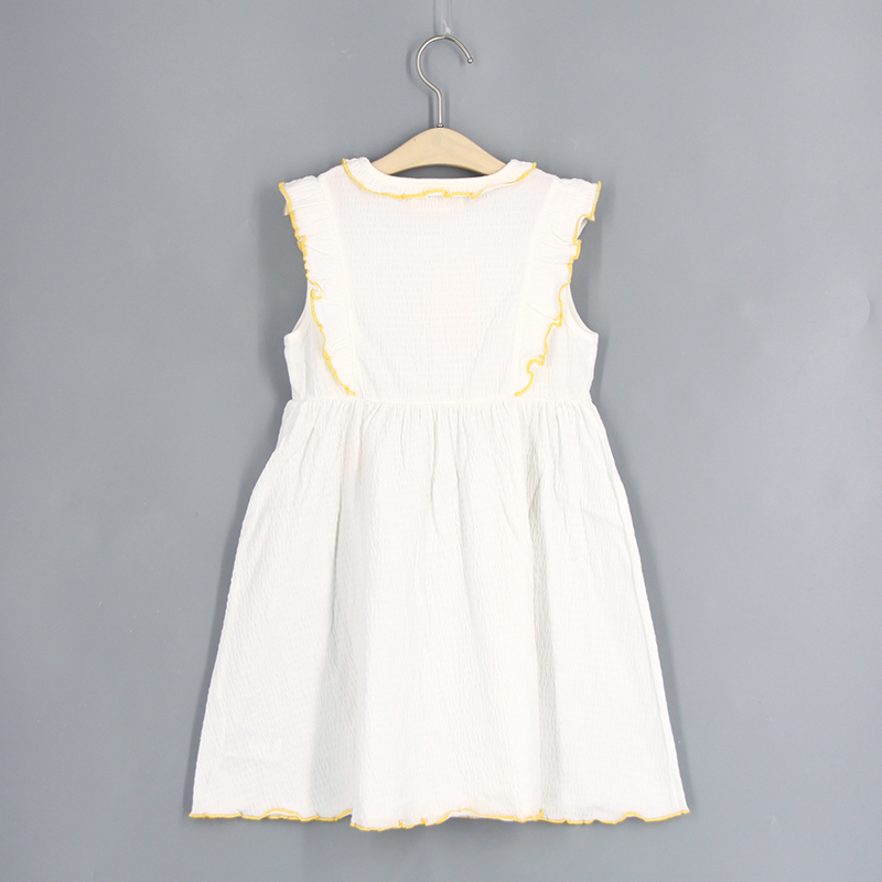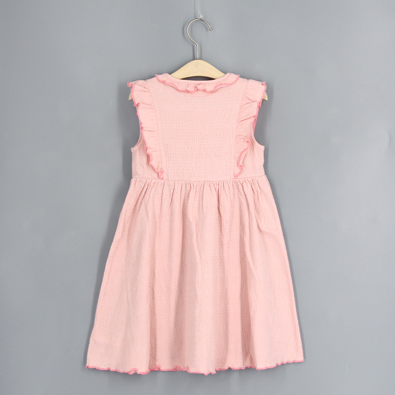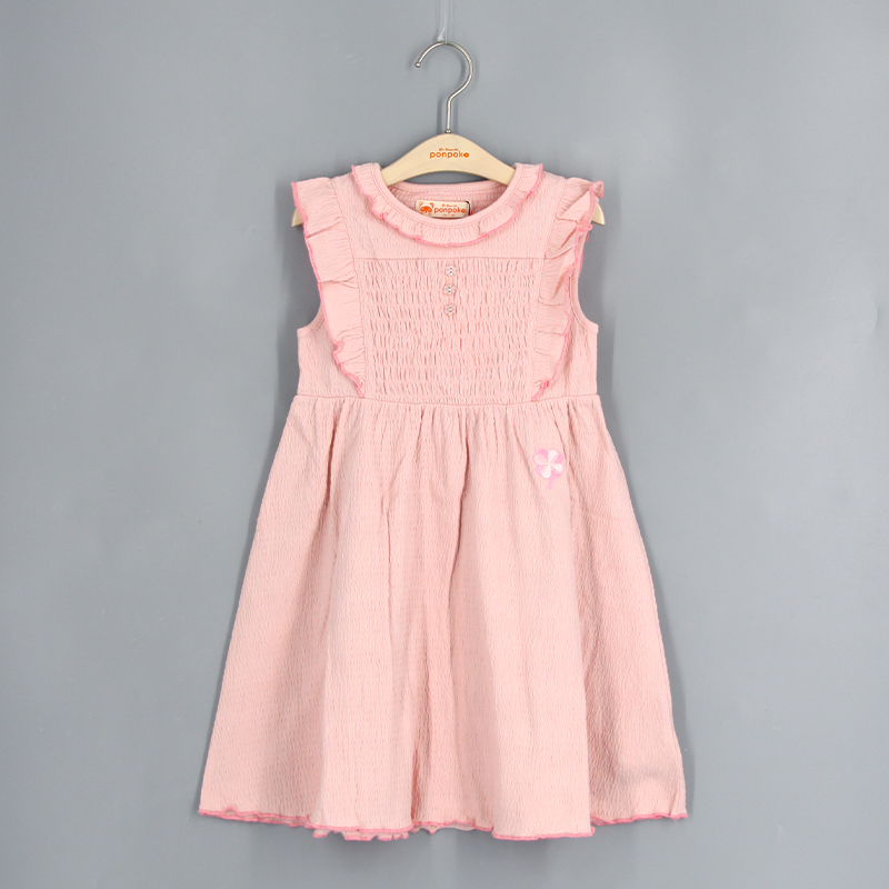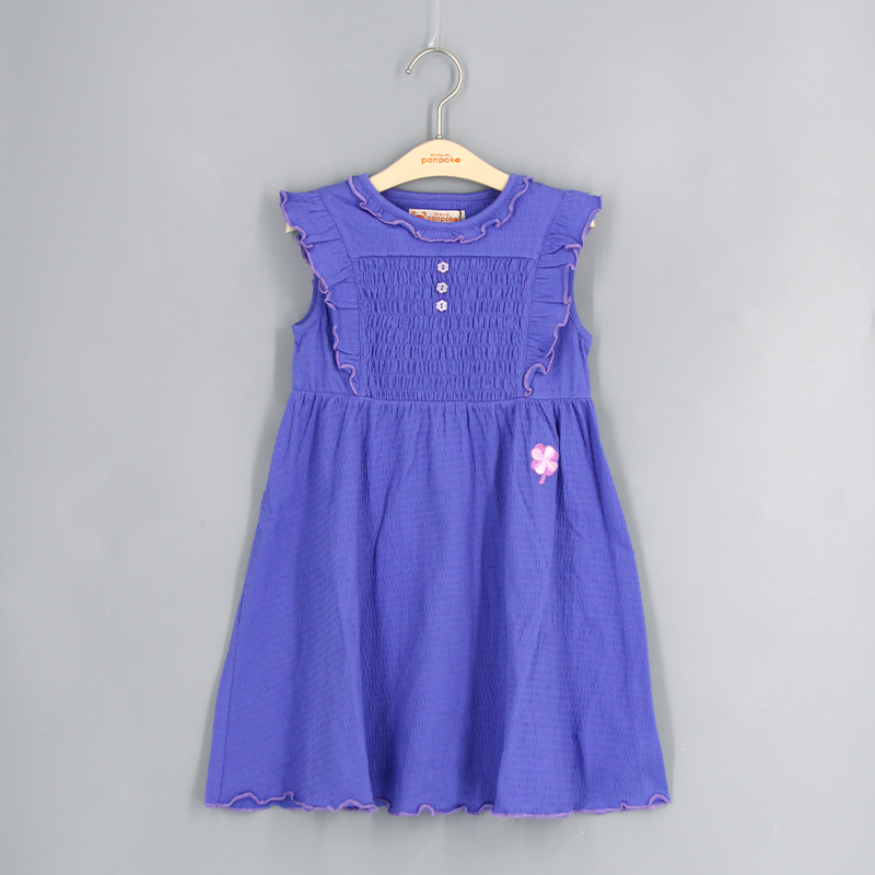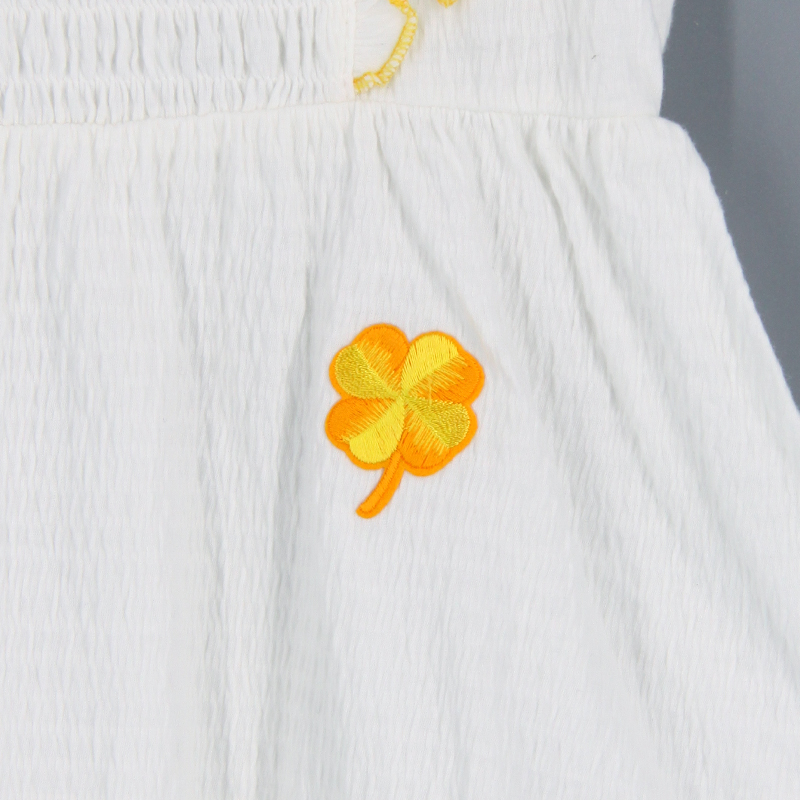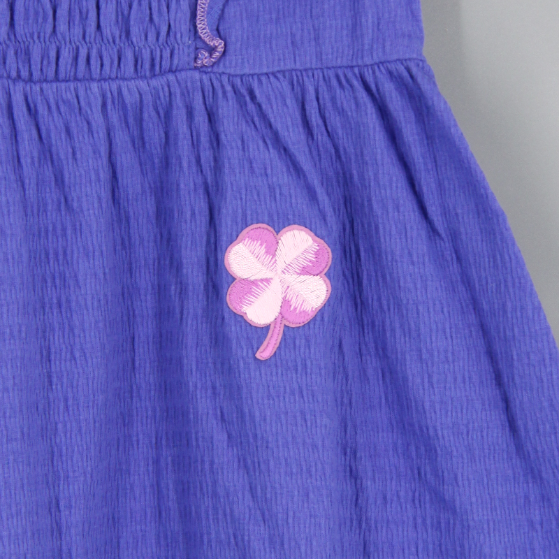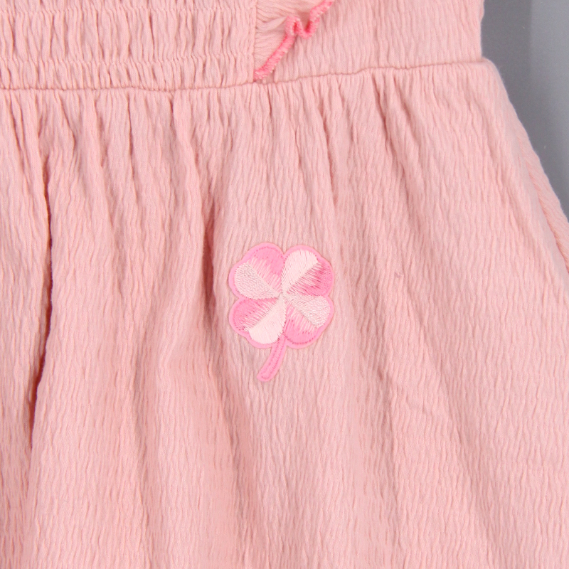 圓領, 無袖, 木耳邊, 鈕扣裝飾, 四葉草布貼, 鄒鄒布面料, 合身款式
