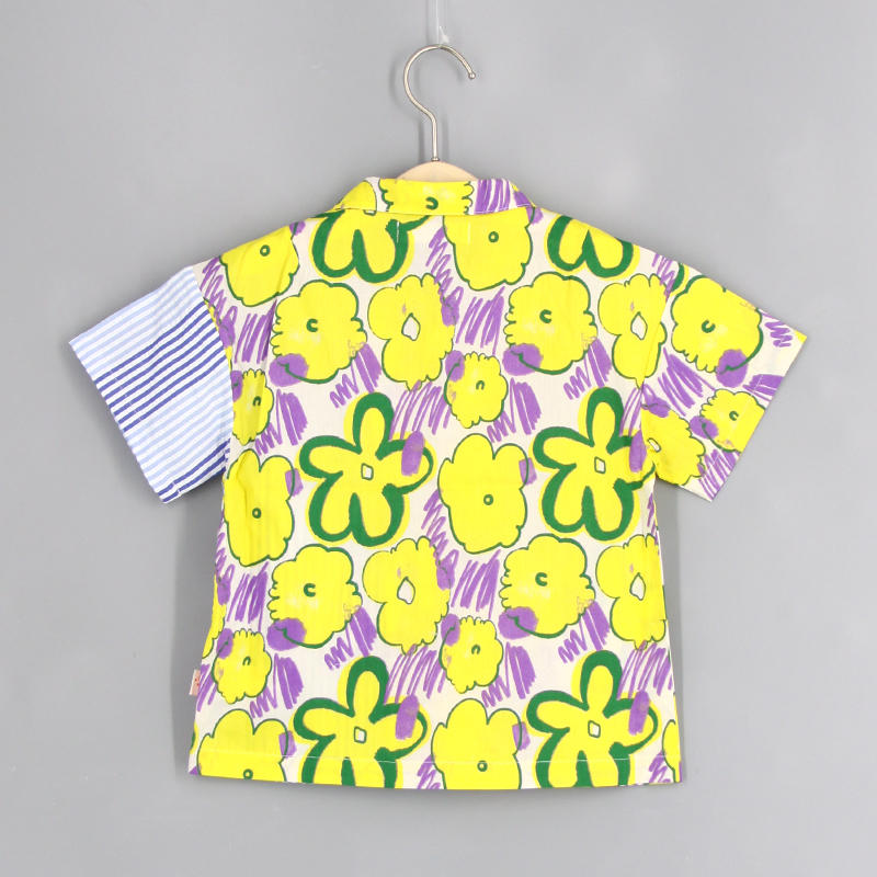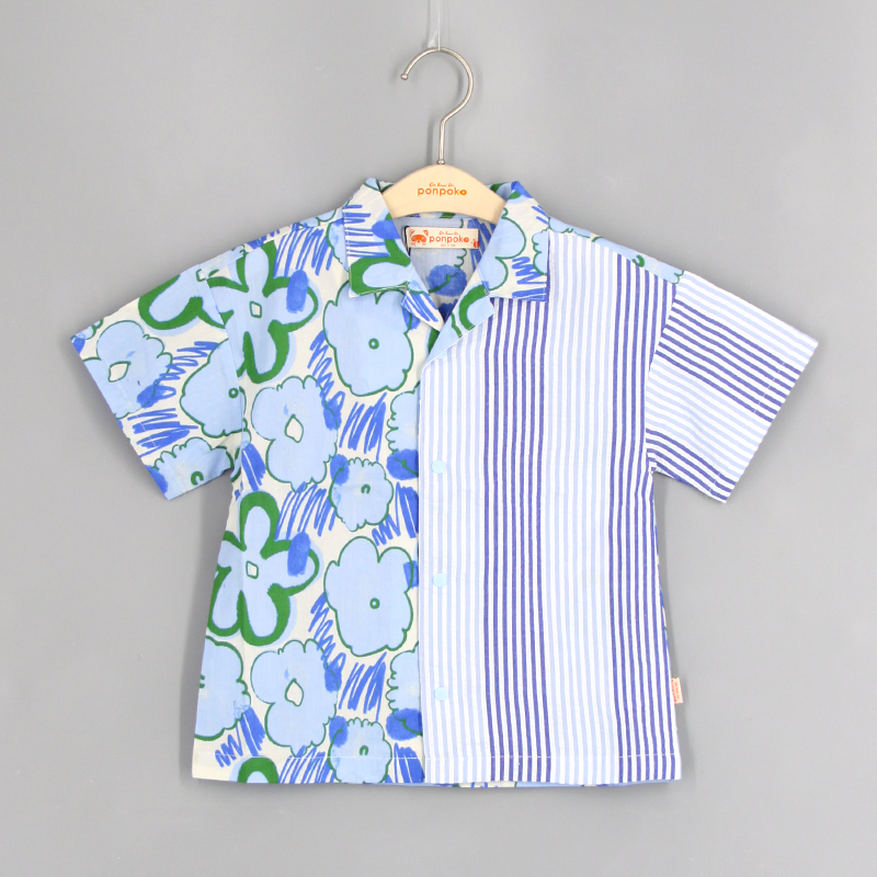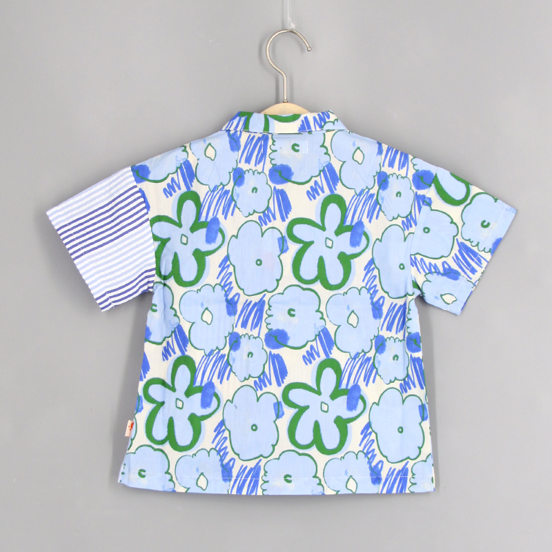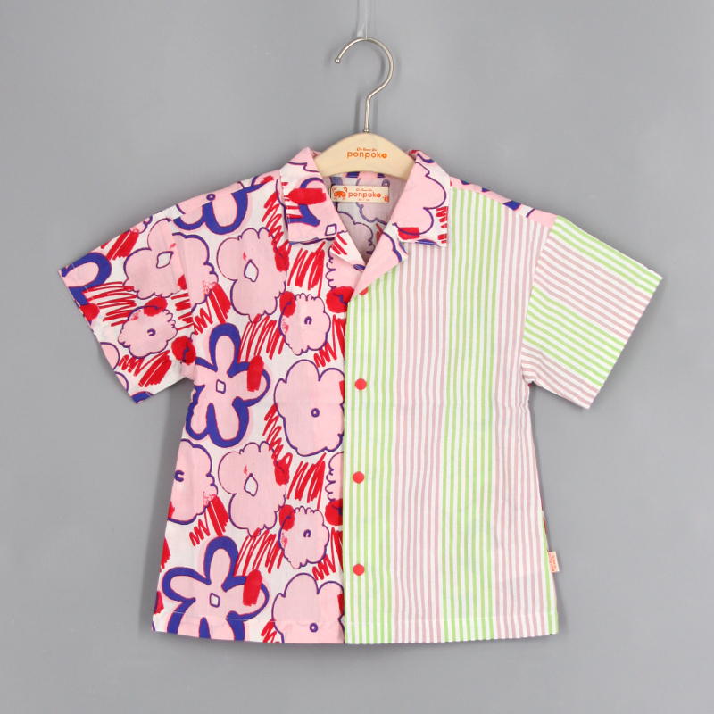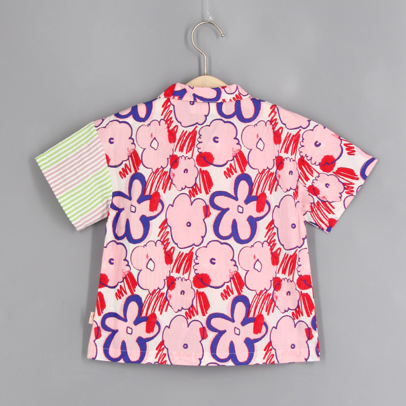 V領, 前中鈕扣開合, 品牌小標籤細節, 短袖, 花卉拼直紋設計, 拼布風格, 撞色風格