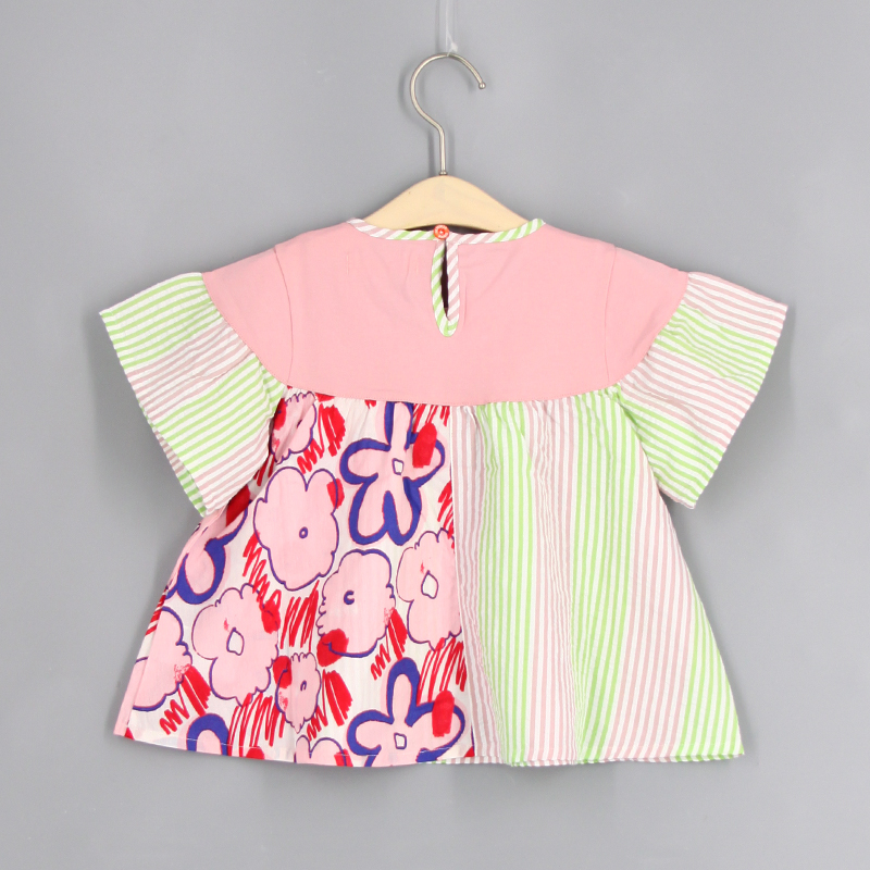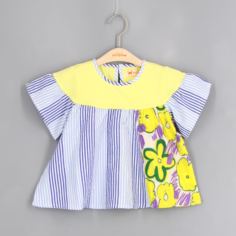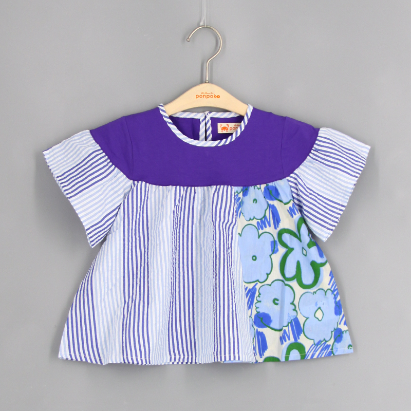 圓領, 荷葉袖, 荷葉下擺, 後方鎖匙窿, 花卉拼直紋設計, 拼布風格, 撞色風格, 寬鬆版型