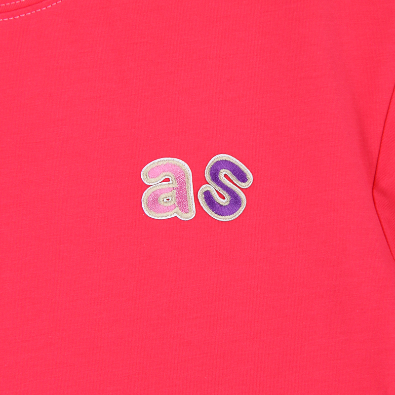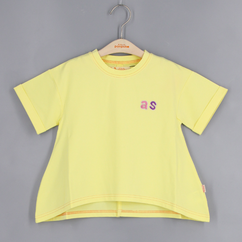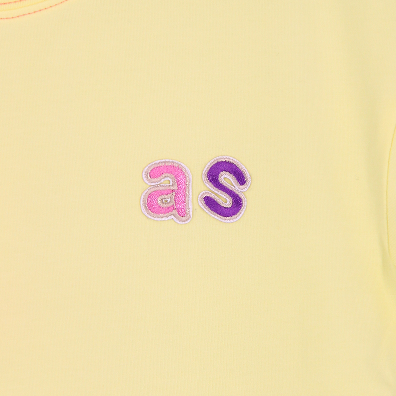 圓領, 捲袖設計, as布貼, 前短後長衫腳, 後方開叉, 大闊腳下擺, 品牌小標籤細節, 撞色車線, 寬鬆款式