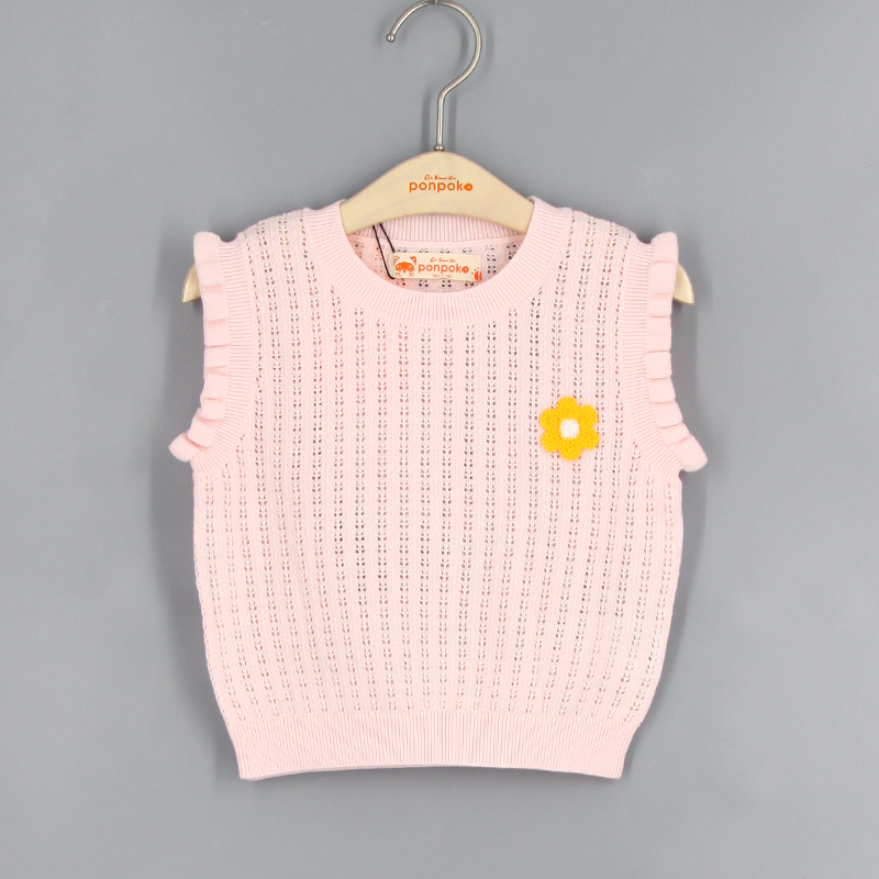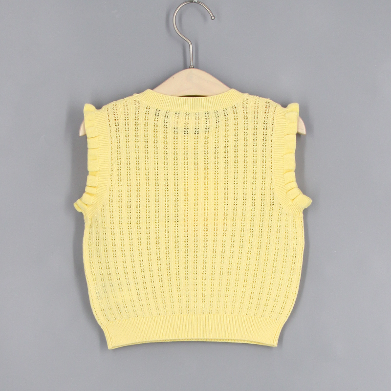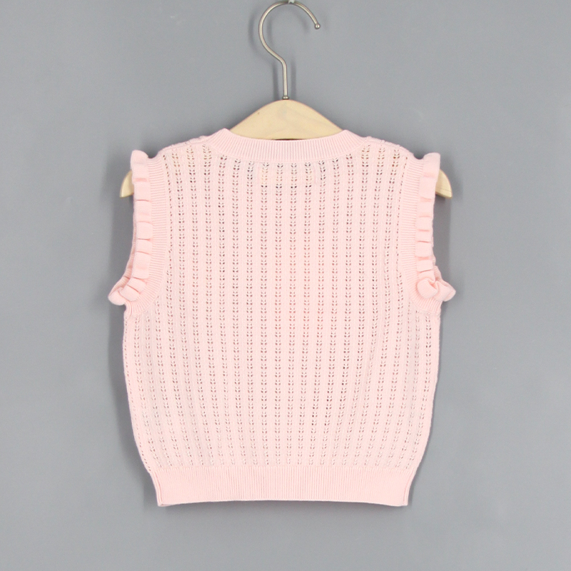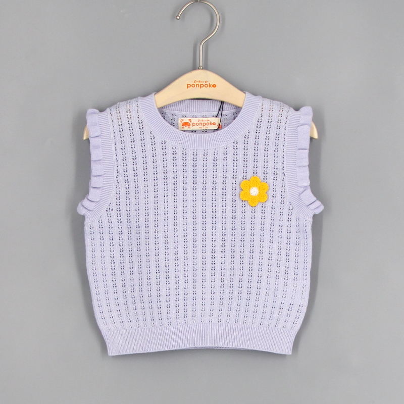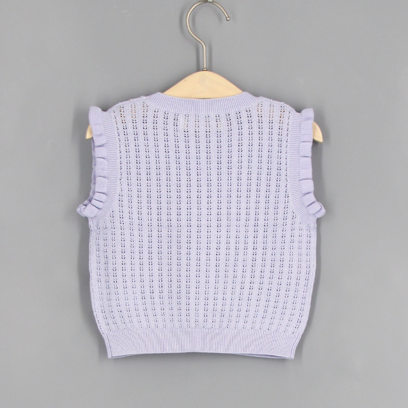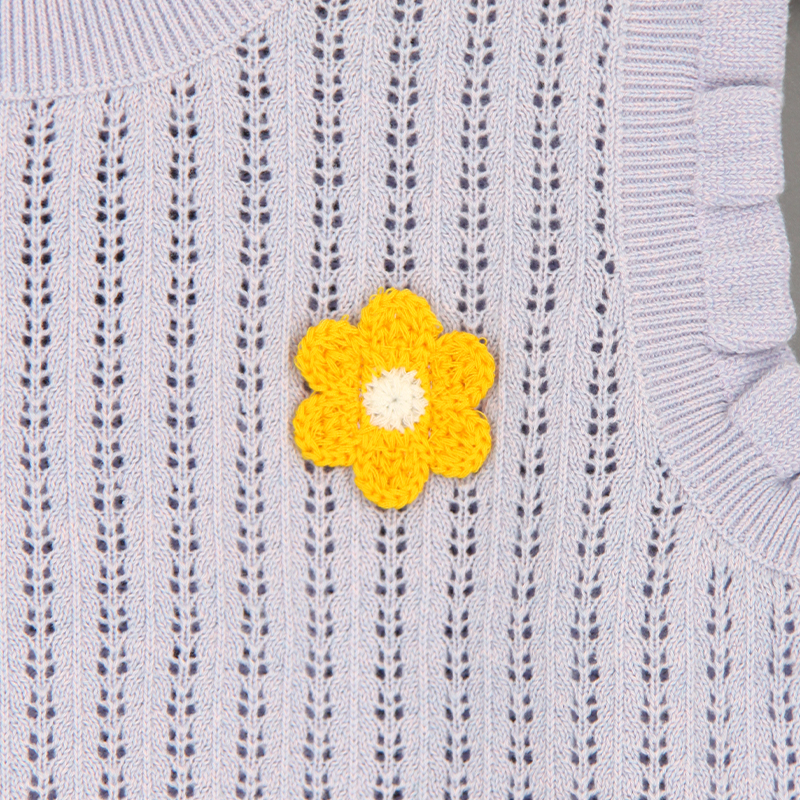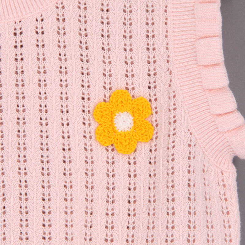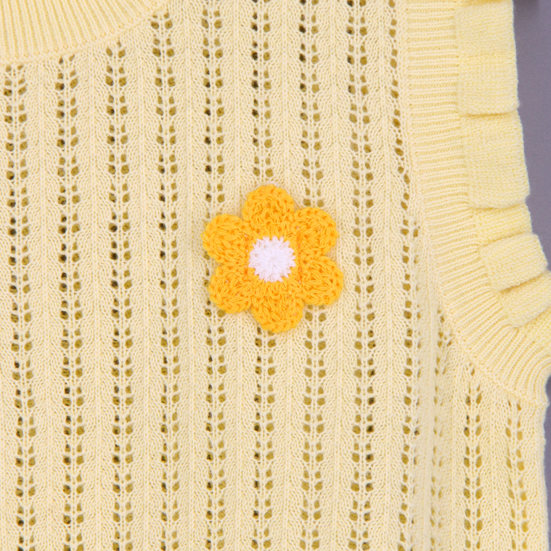圓領, 木耳邊袖, 挑窿針織花紋, 勾花布貼, 羅紋領及衫腳, 合身款式