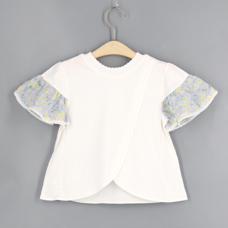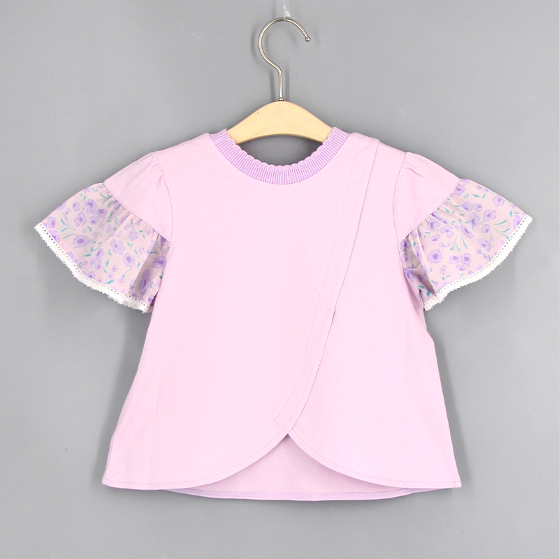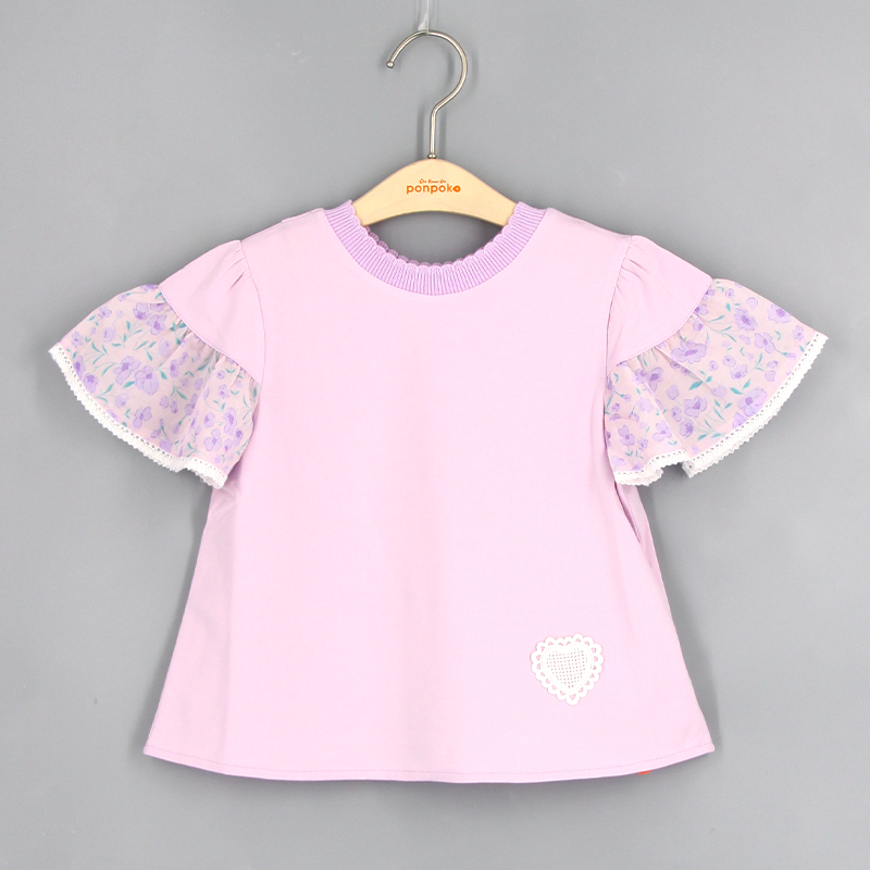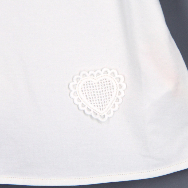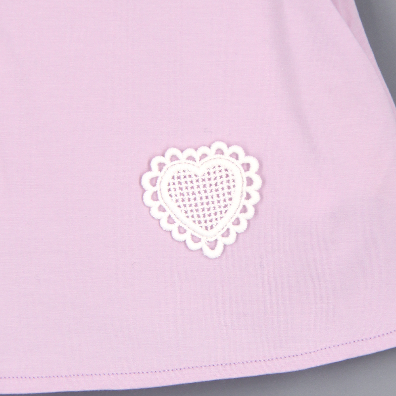 圓領, 波浪邊羅紋衫領, 荷葉袖, 愛心褸空布貼, 前後可穿款式, 花瓣後幅設計, 後幅特色雙層曲線剪裁設計, 拼布風格