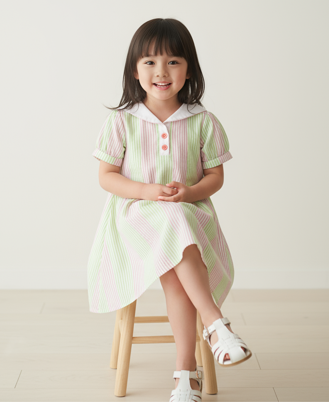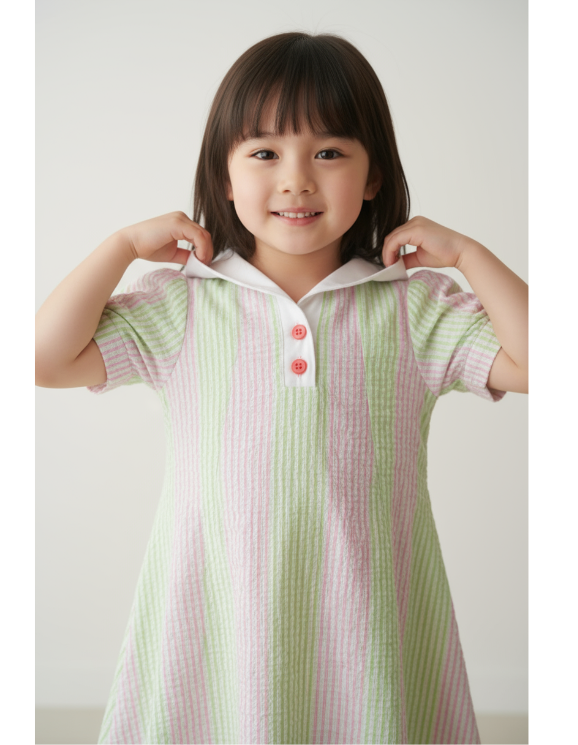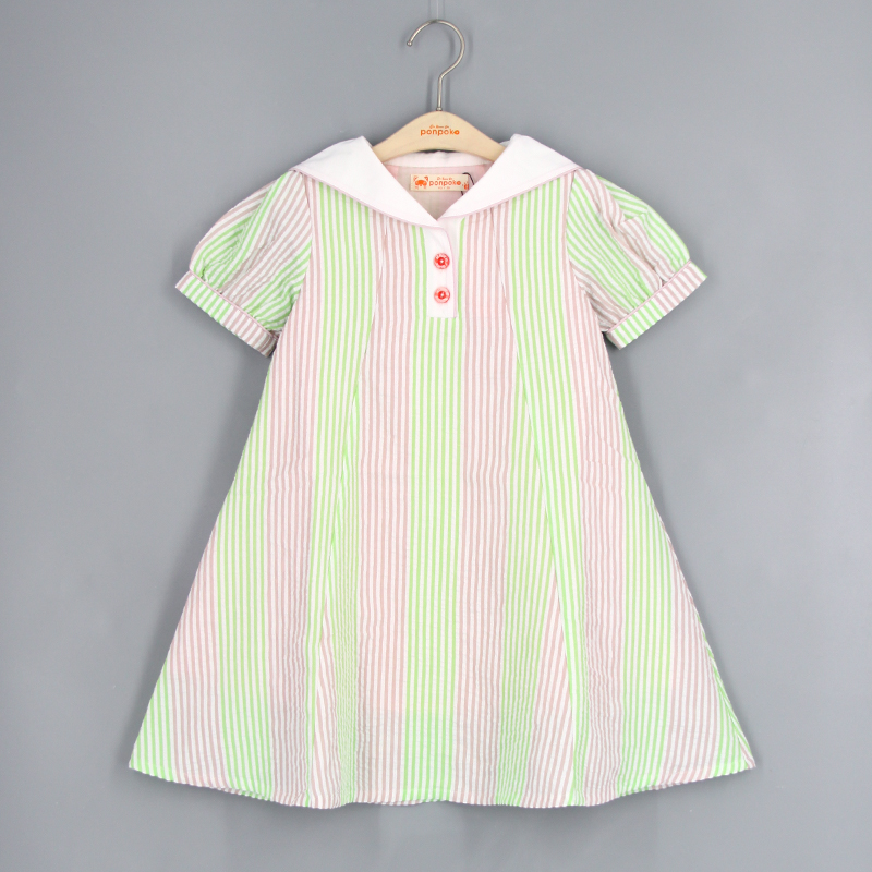 水手領設計, 泡泡袖, 品牌特色鈕扣, 直紋設計, 傘裙款式, 後幅束腰款設計