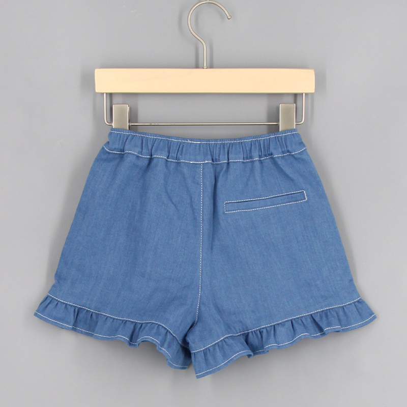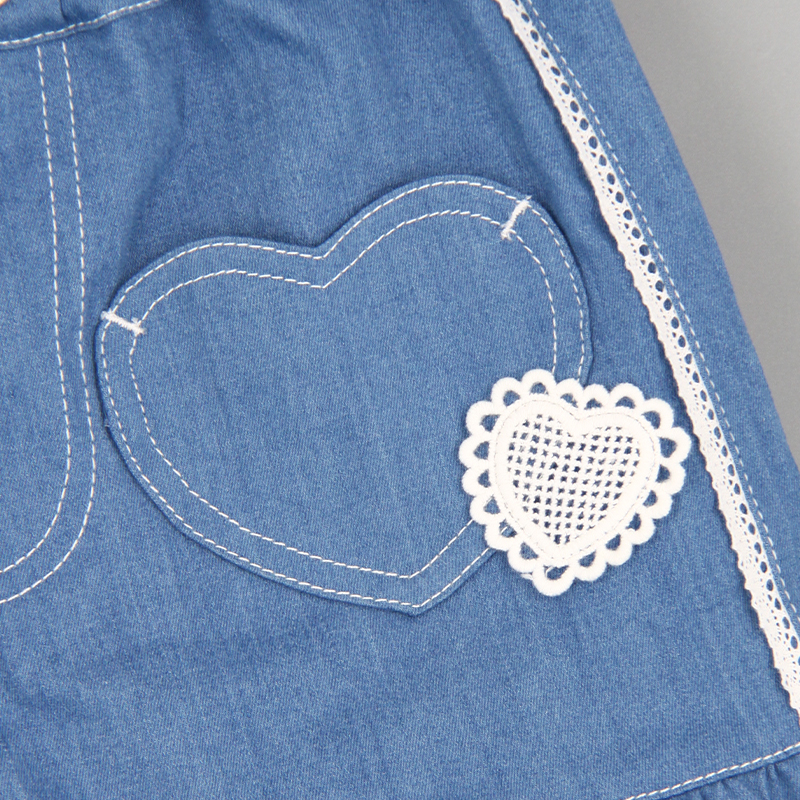 橡筋腰頭, 心型口袋, 心型布貼, 蕾絲花邊飾, 荷葉邊褲腳, 後方仿口袋裝飾, 撞色車線