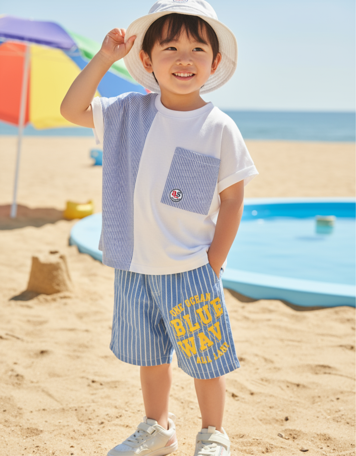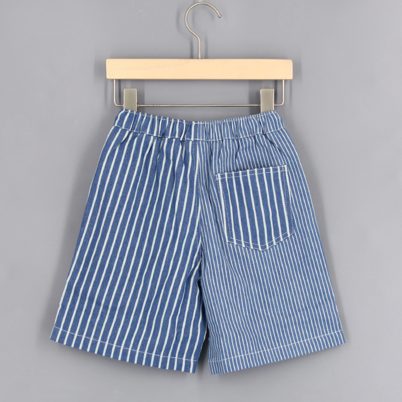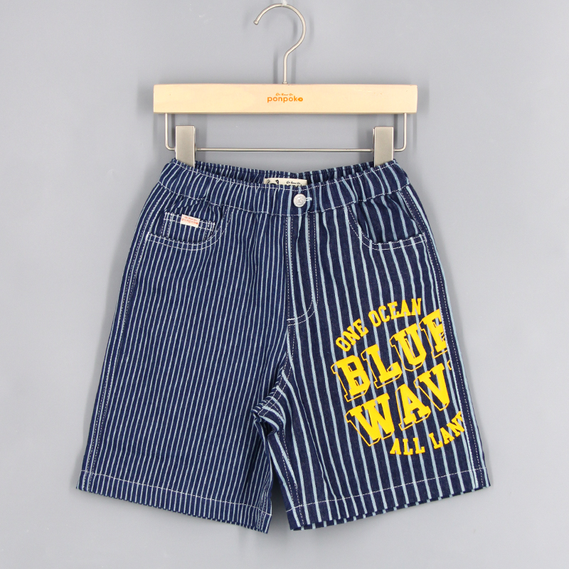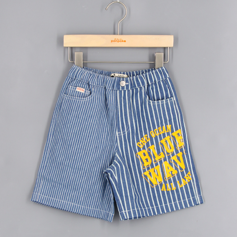 橡筋腰頭, 特色印花設計, 粗幼間條紋, 兩側及後方口袋, 品牌小標籤細節, 中長款短褲, 牛仔布