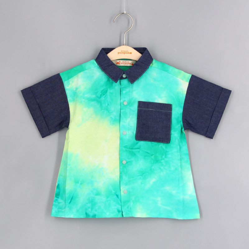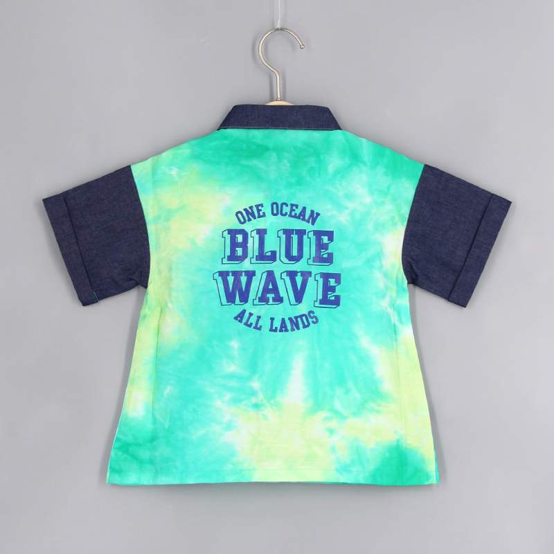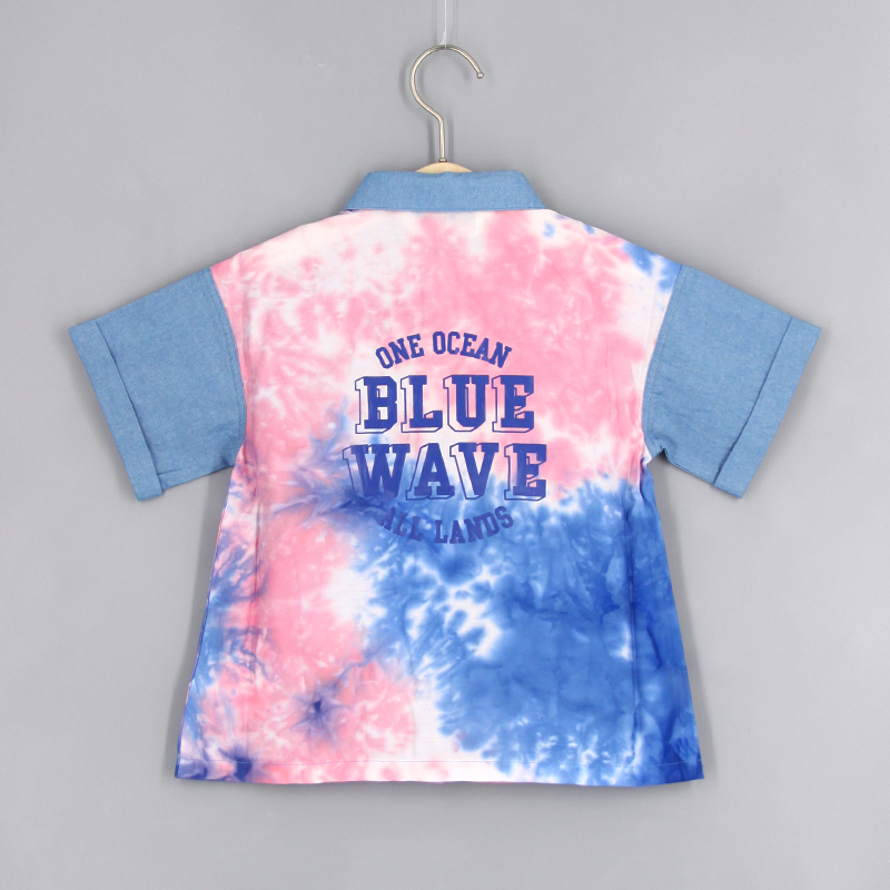 特色牛仔拼扎染布, 立體前胸袋, 前中鈕扣開合, 背面特色印花, 合身款式