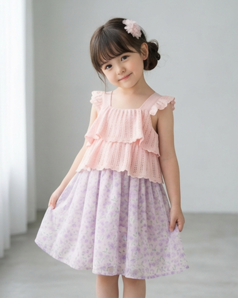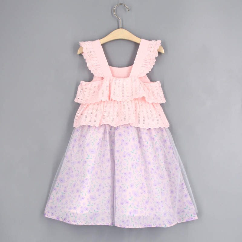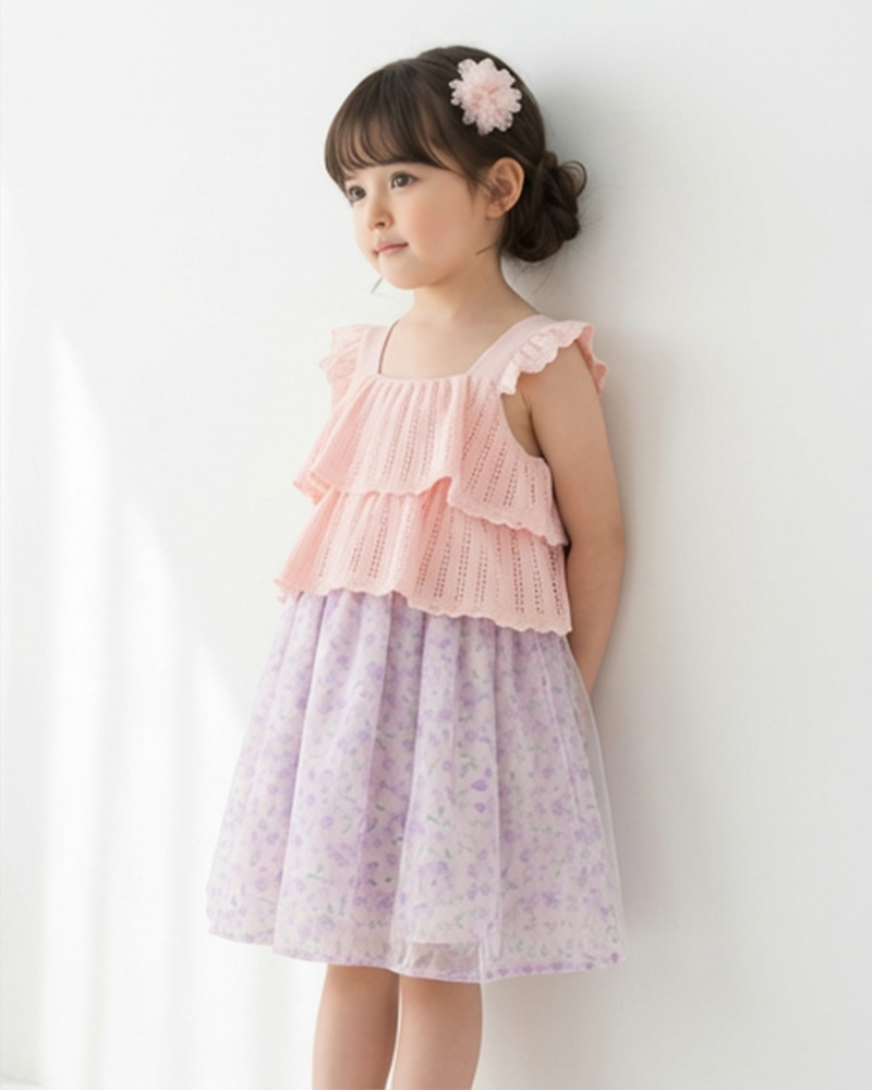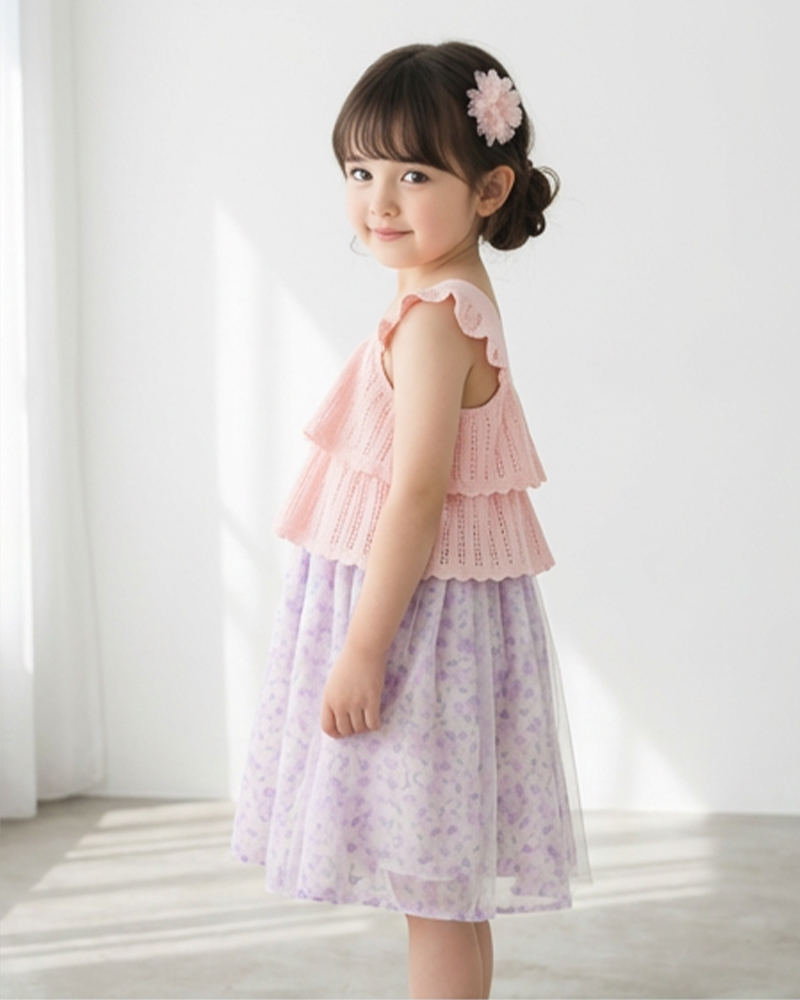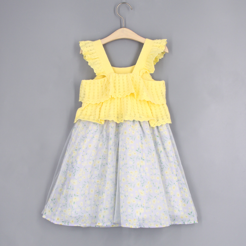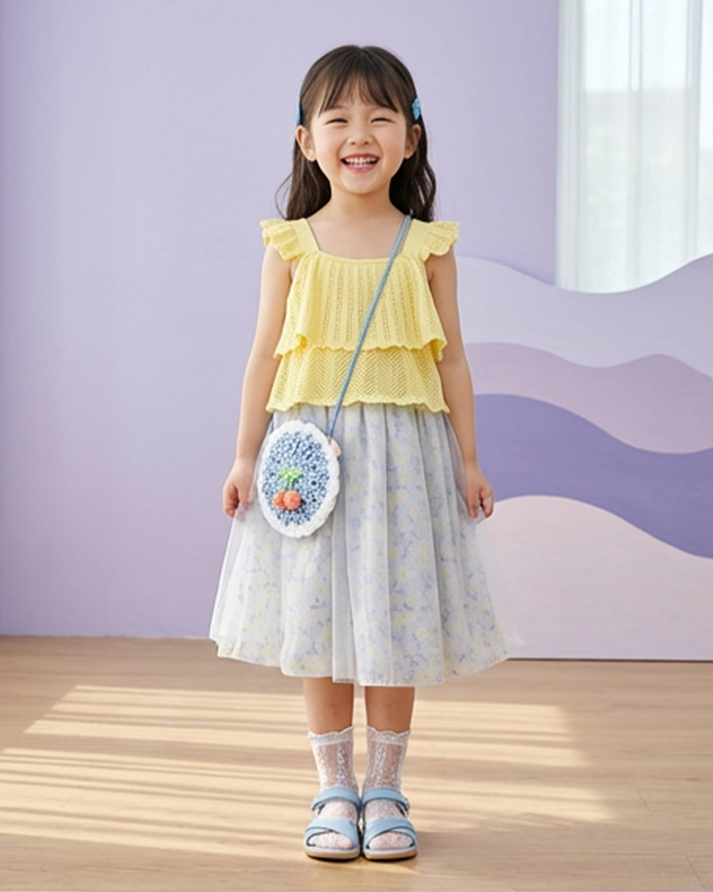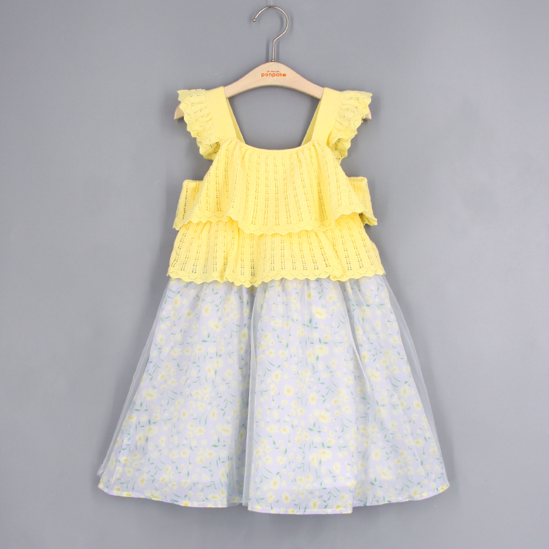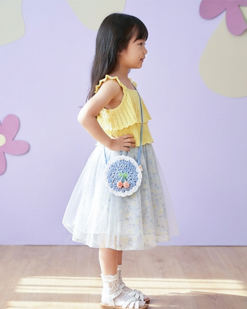 方領, 荷葉邊袖, 針織挑窿上身, 橡根腰頭, 網紗拼花布雙層拼布裙