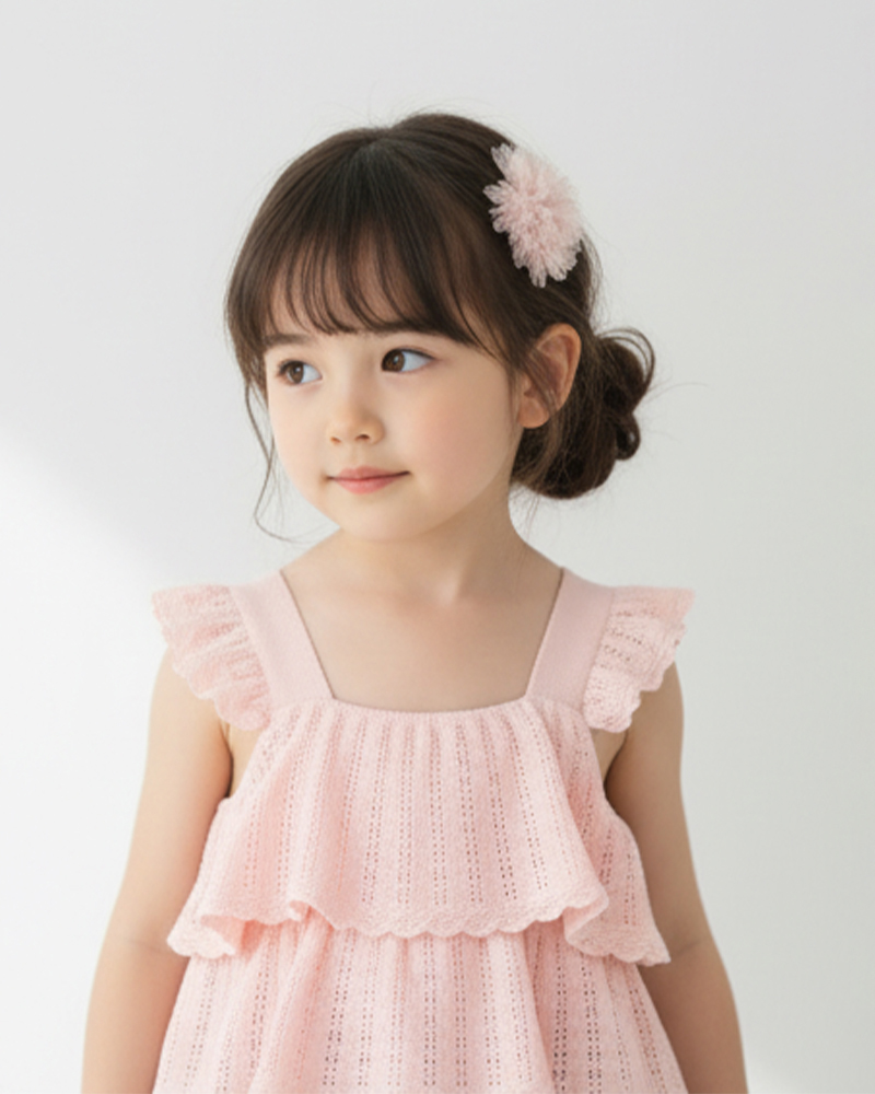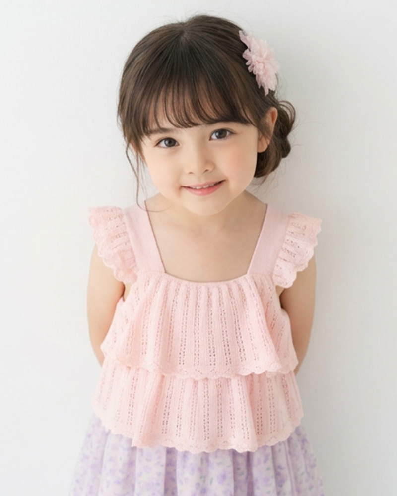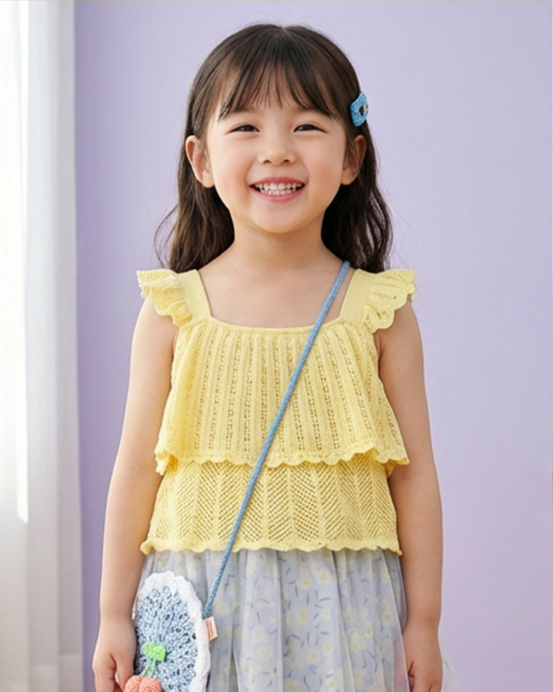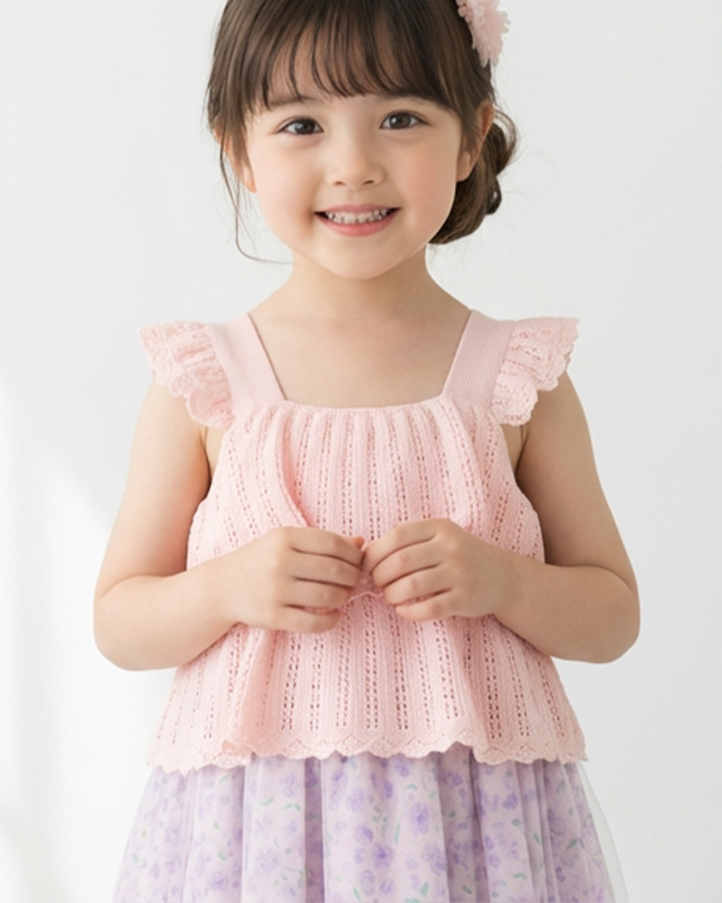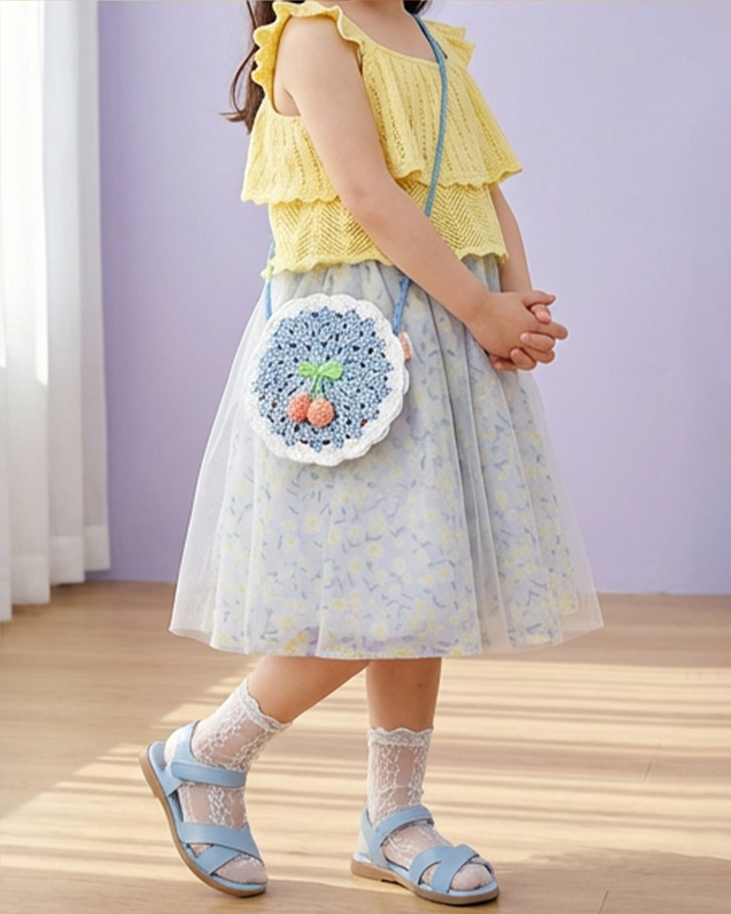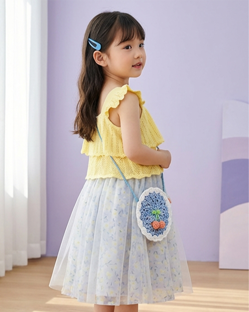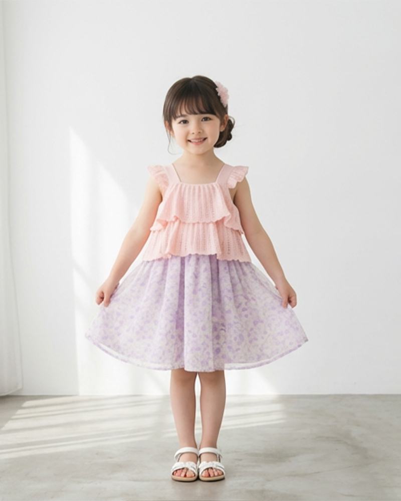 方領, 荷葉邊袖, 針織挑窿上身, 橡根腰頭, 網紗拼花布雙層拼布裙
