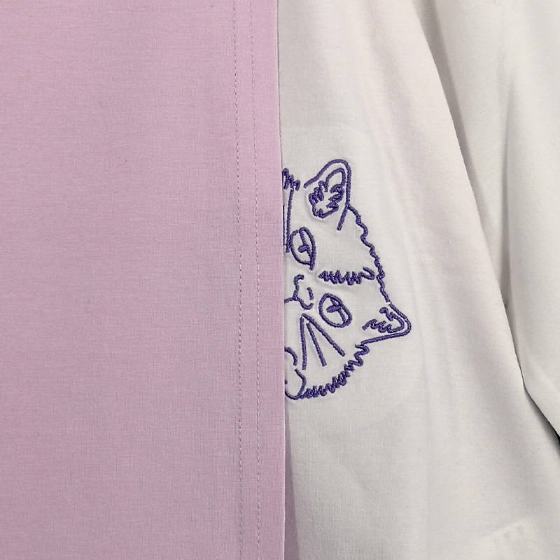 圓領, 貓貓刺繡圖案, 特色疊層剪裁設計, 前短後長衫腳, 撞色風格