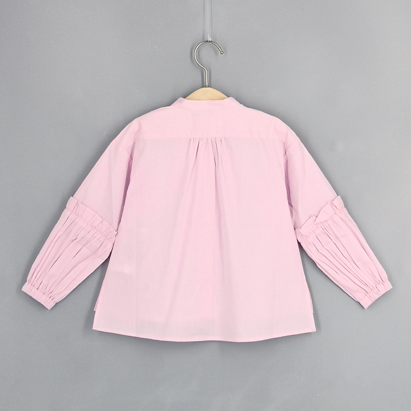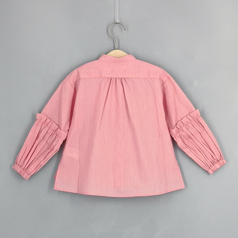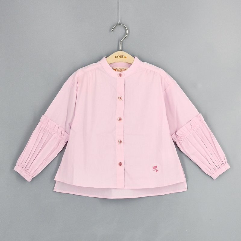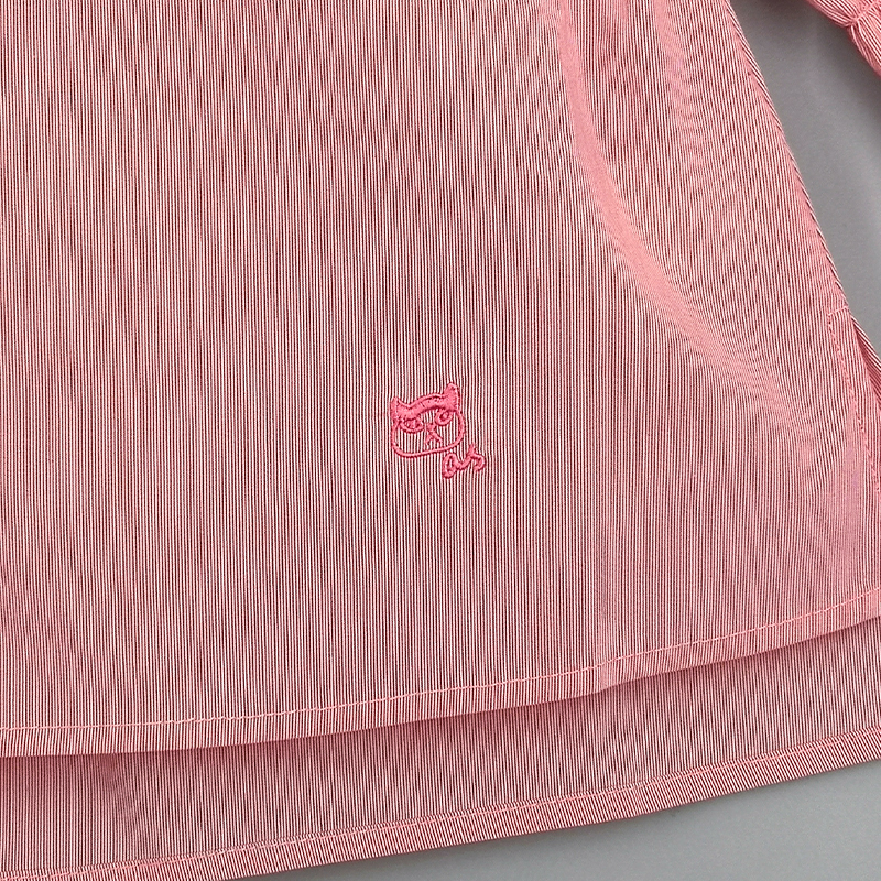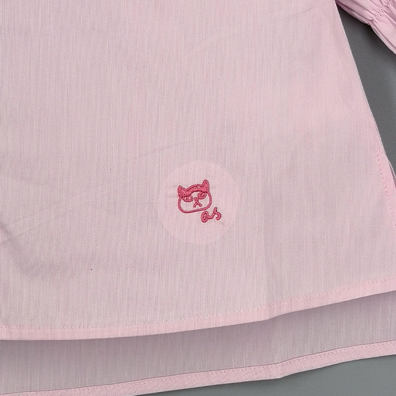 小企領, 泡泡碎褶袖款, 小貓刺繡設計, 愛心鈕扣, 前中鈕扣開合, 壓褶細節, 前短後長衫腳, 條紋圖案, 合身款式