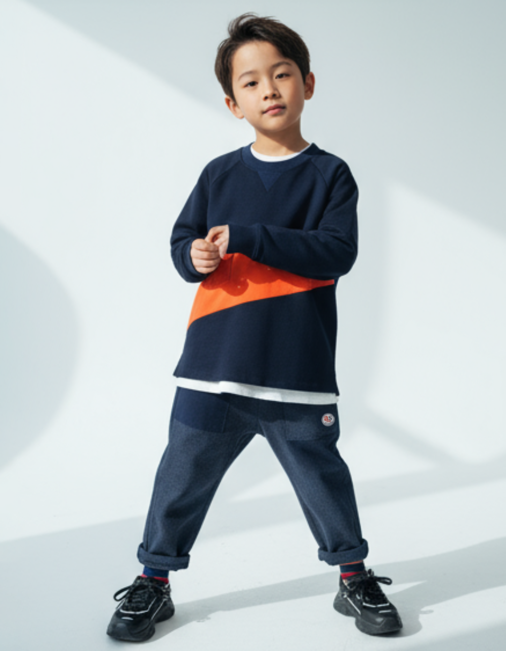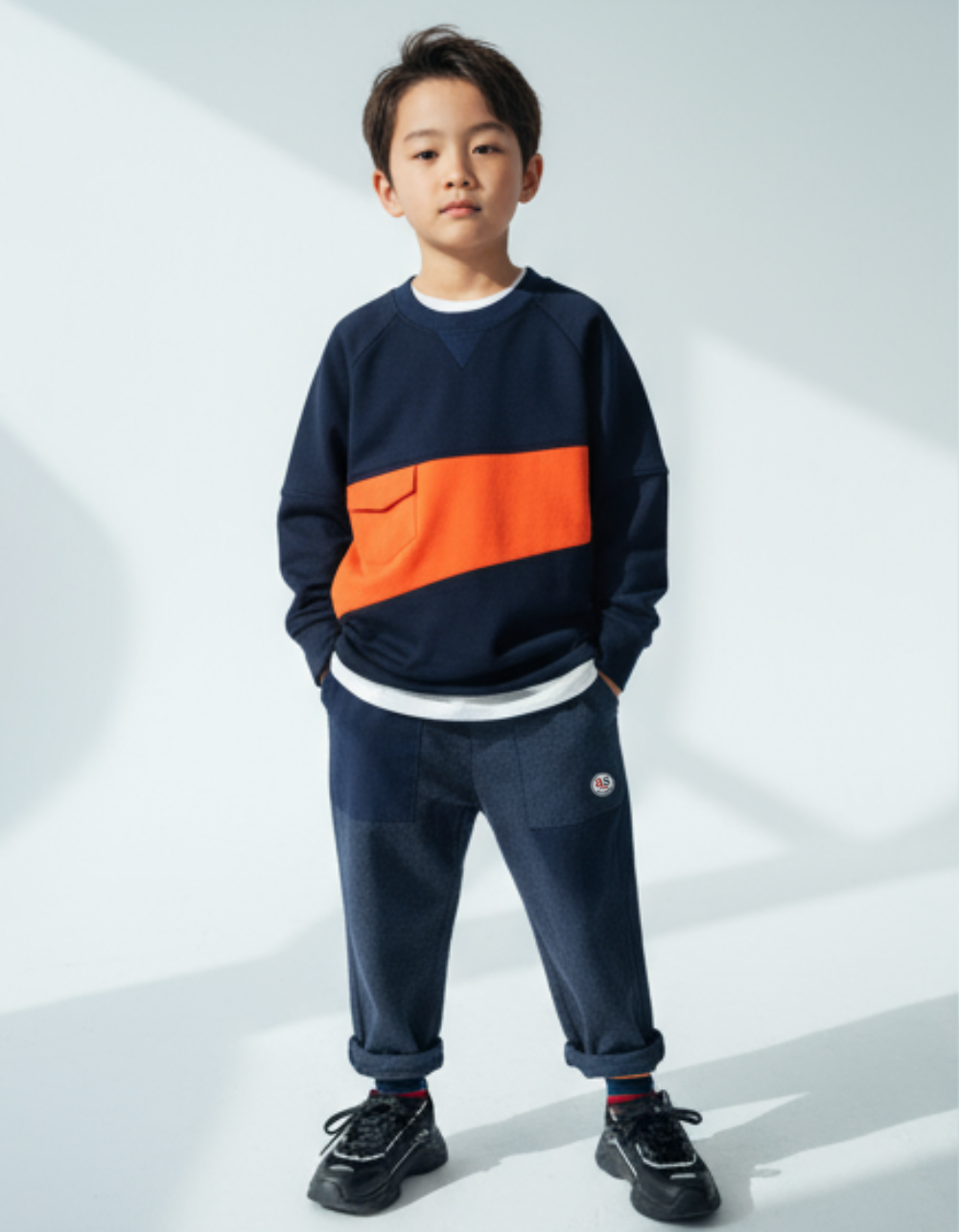 圓領, 羅紋領, 前方口袋, 斜裁拼布風格, 背面As Know As刺繡標誌, 撞色風格