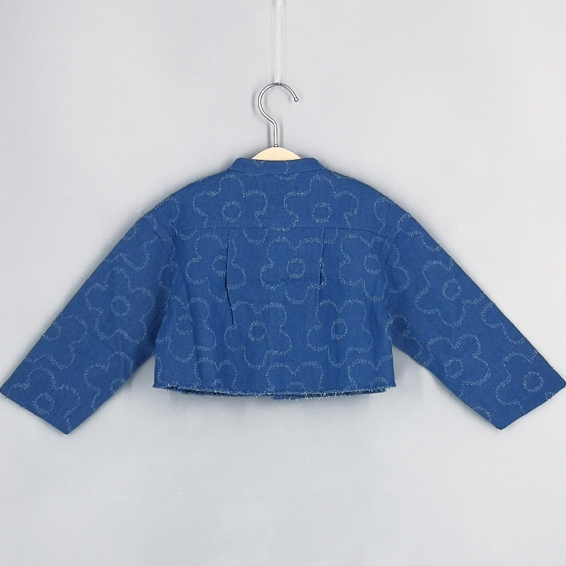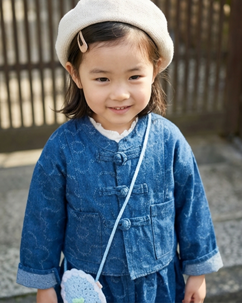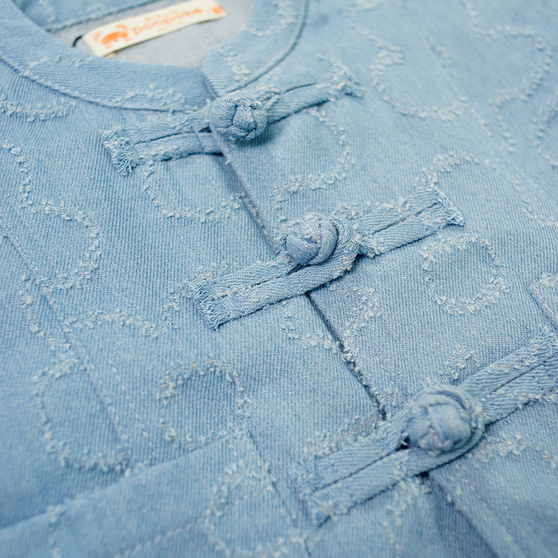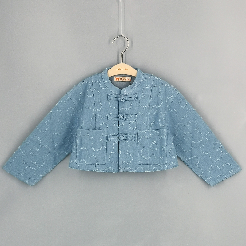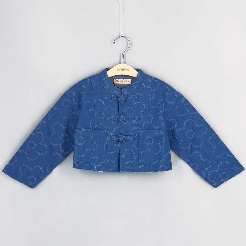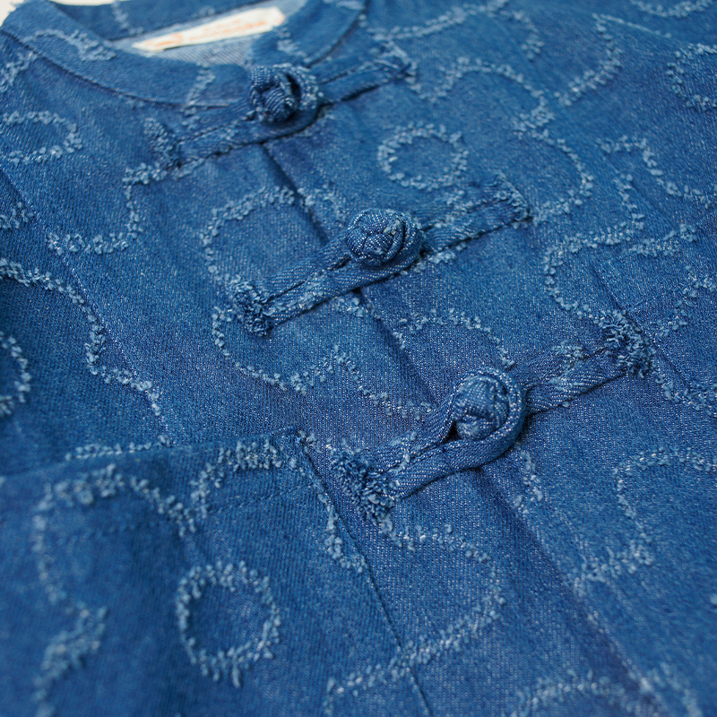 圓領, 中國結鈕扣, 前方口袋, 特色花花圖案布, 流蘇邊, 短身衫款, 牛仔布